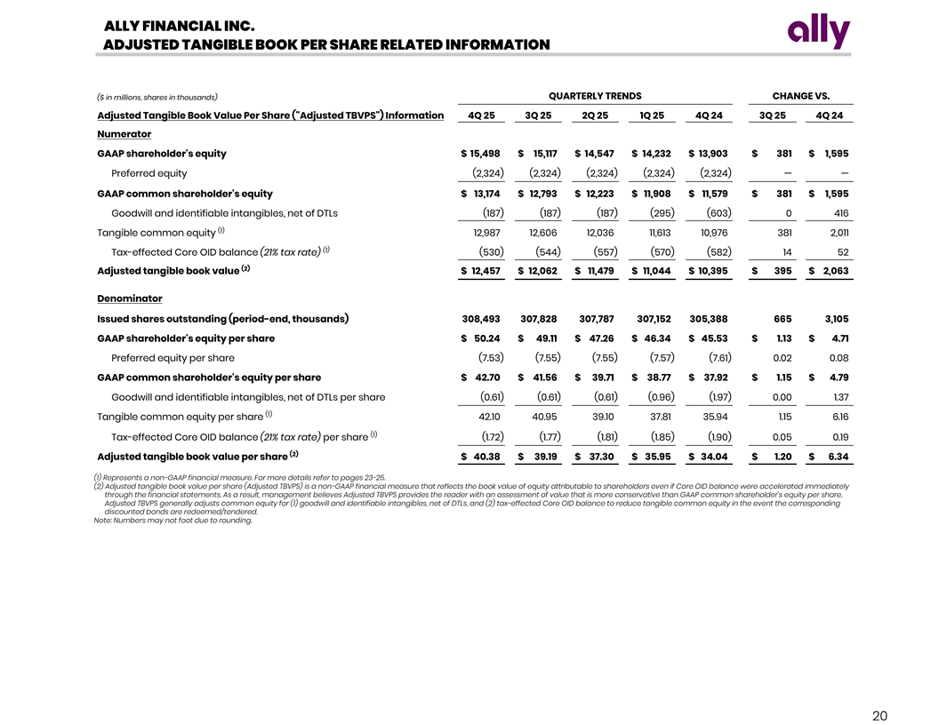 ALLY FINANCIAL INC. ADJUSTED TANGIBLE BOOK PER SHARE RELATED INFORMATION QUARTERLY TRENDS CHANGE VS. ($ in millions, shares in thousands) Adjusted Tangible Book Value Per Share ( Adjusted TBVPS ) Information 4Q 25 3Q 25 2Q 25 1Q 25 4Q 24 3Q 25 4Q 24 Numerator GAAP shareholder's equity $ 15,498 $ 15,117 $ 14,547 $ 14,232 $ 13,903 $ 381 $ 1,595 Preferred equity (2,324) (2,324) (2,324) (2,324) (2,324) — — GAAP common shareholder's equity $ 13,174 $ 12,793 $ 12,223 $ 11,908 $ 11,579 $ 381 $ 1,595 Goodwill and identifiable intangibles, net of DTLs (187) (187) (187) (295) (603) 0 416 (1) Tangible common equity 12,987 12,606 12,036 11,613 10,976 381 2,011 (1) Tax-effected Core OID balance (21% tax rate) (530) (544) (557) (570) (582) 14 52 (2) Adjusted tangible book value $ 12,457 $ 12,062 $ 11,479 $ 11,044 $ 10,395 $ 395 $ 2,063 Denominator Issued shares outstanding (period-end, thousands) 308,493 307,828 307,787 307,152 305,388 665 3,105 GAAP shareholder's equity per share $ 50.24 $ 49.11 $ 47.26 $ 46.34 $ 45.53 $ 1.13 $ 4.71 Preferred equity per share (7.53) (7.55) (7.55) (7.57) (7.61) 0.02 0.08 GAAP common shareholder's equity per share $ 42.70 $ 41.56 $ 39.71 $ 38.77 $ 37.92 $ 1.15 $ 4.79 Goodwill and identifiable intangibles, net of DTLs per share (0.61) (0.61) (0.61) (0.96) (1.97) 0.00 1.37 (1) Tangible common equity per share 42.10 40.95 39.10 37.81 35.94 1.15 6.16 (1) Tax-effected Core OID balance (21% tax rate) per share (1.72) (1.77) (1.81) (1.85) (1.90) 0.05 0.19 (2) Adjusted tangible book value per share $ 40.38 $ 39.19 $ 37.30 $ 35.95 $ 34.04 $ 1.20 $ 6.34 (1) Represents a non-GAAP financial measure. For more details refer to pages 23-25. (2) Adjusted tangible book value per share (Adjusted TBVPS) is a non-GAAP financial measure that reflects the book value of equity attributable to shareholders even if Core OID balance were accelerated immediately through the financial statements. As a result, management believes Adjusted TBVPS provides the reader with an assessment of value that is more conservative than GAAP common shareholder’s equity per share. Adjusted TBVPS generally adjusts common equity for (1) goodwill and identifiable intangibles, net of DTLs, and (2) tax-effected Core OID balance to reduce tangible common equity in the event the corresponding discounted bonds are redeemed/tendered. Note: Numbers may not foot due to rounding. 20