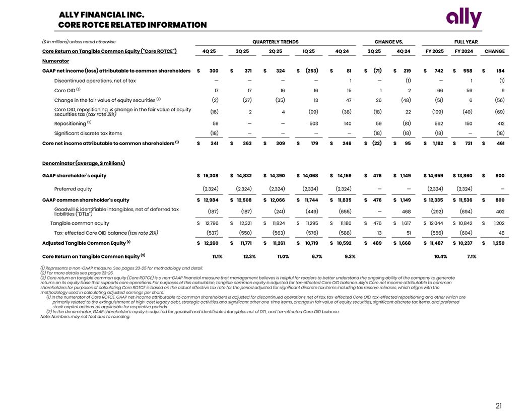 ALLY FINANCIAL INC. CORE ROTCE RELATED INFORMATION ($ in millions) unless noted otherwise QUARTERLY TRENDS CHANGE VS. FULL YEAR Core Return on Tangible Common Equity ( Core ROTCE ) 4Q 25 3Q 25 2Q 25 1Q 25 4Q 24 3Q 25 4Q 24 FY 2025 FY 2024 CHANGE Numerator GAAP net income (loss) attributable to common shareholders $ 300 $ 371 $ 324 $ (253) $ 81 $ (71) $ 219 $ 742 $ 558 $ 184 Discontinued operations, net of tax — — — — 1 — (1) — 1 (1) (2) Core OID 17 17 16 16 15 1 2 66 56 9 (2) Change in the fair value of equity securities (2) (27) (35) 13 47 26 (48) (51) 6 (56) Core OID, repositioning & change in the fair value of equity (16) 2 4 (99) (38) (18) 22 (109) (40) (69) securities tax (tax rate 21%) (2) Repositioning 59 — — 503 140 59 (81) 562 150 412 Significant discrete tax items (18) — — — — (18) (18) (18) — (18) (1) Core net income attributable to common shareholders $ 341 $ 363 $ 309 $ 179 $ 246 $ (22) $ 95 $ 1,192 $ 731 $ 461 Denominator (average, $ millions) GAAP shareholder's equity $ 15,308 $ 14,832 $ 14,390 $ 14,068 $ 14,159 $ 476 $ 1,149 $ 14,659 $ 13,860 $ 800 Preferred equity (2,324) (2,324) (2,324) (2,324) (2,324) — — (2,324) (2,324) — GAAP common shareholder's equity $ 12,984 $ 12,508 $ 12,066 $ 11,744 $ 11,835 $ 476 $ 1,149 $ 12,335 $ 11,536 $ 800 Goodwill & identifiable intangibles, net of deferred tax (187) (187) (241) (449) (655) — 468 (292) (694) 402 liabilities ( DTLs ) Tangible common equity $ 12,796 $ 12,321 $ 11,824 $ 11,295 $ 11,180 $ 476 $ 1,617 $ 12,044 $ 10,842 $ 1,202 Tax-effected Core OID balance (tax rate 21%) (537) (550) (563) (576) (588) 13 51 (556) (604) 48 (1) Adjusted Tangible Common Equity $ 12,260 $ 11,771 $ 11,261 $ 10,719 $ 10,592 $ 489 $ 1,668 $ 11,487 $ 10,237 $ 1,250 (3) Core Return on Tangible Common Equity 1 1.1 % 1 2.3 % 1 1.0 % 6 .7 % 9 .3% 1 0.4% 7 .1% (1) Represents a non-GAAP measure. See pages 23-25 for methodology and detail. (2) For more details see pages 23-25. (3) Core return on tangible common equity (Core ROTCE) is a non-GAAP financial measure that management believes is helpful for readers to better understand the ongoing ability of the company to generate returns on its equity base that supports core operations. For purposes of this calculation, tangible common equity is adjusted for tax-effected Core OID balance. Ally’s Core net income attributable to common shareholders for purposes of calculating Core ROTCE is based on the actual effective tax rate for the period adjusted for significant discrete tax items including tax reserve releases, which aligns with the methodology used in calculating adjusted earnings per share. (1) In the numerator of Core ROTCE, GAAP net income attributable to common shareholders is adjusted for discontinued operations net of tax, tax-effected Core OID, tax-effected repositioning and other which are primarily related to the extinguishment of high-cost legacy debt, strategic activities and significant other one-time items, change in fair value of equity securities, significant discrete tax items, and preferred stock capital actions, as applicable for respective periods. (2) In the denominator, GAAP shareholder’s equity is adjusted for goodwill and identifiable intangibles net of DTL, and tax-effected Core OID balance. Note: Numbers may not foot due to rounding. 21