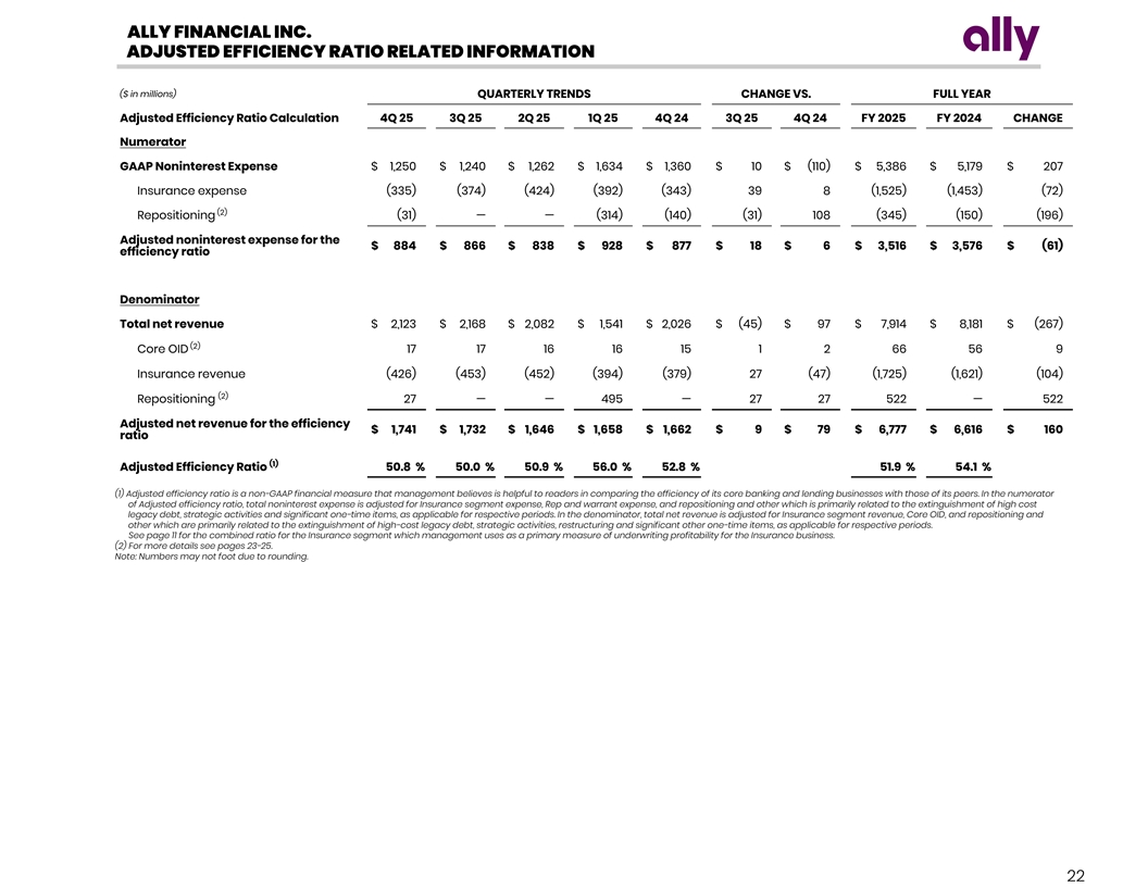 ALLY FINANCIAL INC. ADJUSTED EFFICIENCY RATIO RELATED INFORMATION ($ in millions) QUARTERLY TRENDS CHANGE VS. FULL YEAR Adjusted Efficiency Ratio Calculation 4Q 25 3Q 25 2Q 25 1Q 25 4Q 24 3Q 25 4Q 24 FY 2025 FY 2024 CHANGE Numerator GAAP Noninterest Expense $ 1,250 $ 1,240 $ 1,262 $ 1,634 $ 1,360 $ 10 $ (110) $ 5,386 $ 5,179 $ 207 Insurance expense (335) (374) (424) (392) (343) 39 8 (1,525) (1,453) (72) (2) Repositioning (31) — — (314) (140) (31) 108 (345) (150) (196) Adjusted noninterest expense for the $ 884 $ 866 $ 838 $ 928 $ 877 $ 18 $ 6 $ 3,516 $ 3,576 $ (61) efficiency ratio Denominator Total net revenue $ 2,123 $ 2,168 $ 2,082 $ 1,541 $ 2,026 $ (45) $ 97 $ 7,914 $ 8,181 $ (267) (2) Core OID 17 17 16 16 15 1 2 66 56 9 Insurance revenue (426) (453) (452) (394) (379) 27 (47) (1,725) (1,621) (104) (2) Repositioning 27 — — 495 — 27 27 522 — 522 Adjusted net revenue for the efficiency $ 1,741 $ 1,732 $ 1,646 $ 1,658 $ 1,662 $ 9 $ 79 $ 6,777 $ 6,616 $ 160 ratio (1) Adjusted Efficiency Ratio 5 0.8 % 5 0.0 % 50.9 % 56.0 % 5 2.8 % 51.9 % 54.1 % (1) Adjusted efficiency ratio is a non-GAAP financial measure that management believes is helpful to readers in comparing the efficiency of its core banking and lending businesses with those of its peers. In the numerator of Adjusted efficiency ratio, total noninterest expense is adjusted for Insurance segment expense, Rep and warrant expense, and repositioning and other which is primarily related to the extinguishment of high cost legacy debt, strategic activities and significant one-time items, as applicable for respective periods. In the denominator, total net revenue is adjusted for Insurance segment revenue, Core OID, and repositioning and other which are primarily related to the extinguishment of high-cost legacy debt, strategic activities, restructuring and significant other one-time items, as applicable for respective periods. See page 11 for the combined ratio for the Insurance segment which management uses as a primary measure of underwriting profitability for the Insurance business. (2) For more details see pages 23-25. Note: Numbers may not foot due to rounding. 22