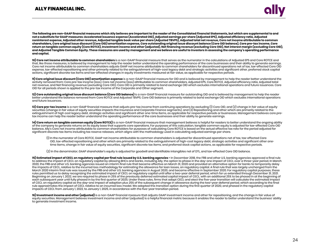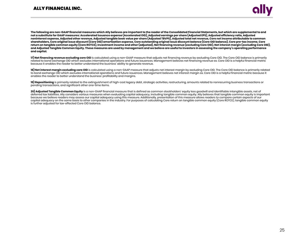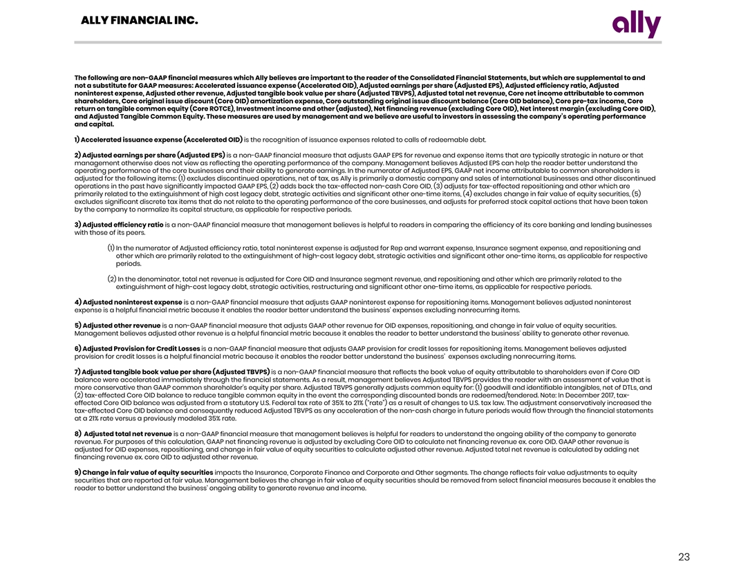 ALLY FINANCIAL INC. The following are non-GAAP financial measures which Ally believes are important to the reader of the Consolidated Financial Statements, but which are supplemental to and not a substitute for GAAP measures: Accelerated issuance expense (Accelerated OID), Adjusted earnings per share (Adjusted EPS), Adjusted efficiency ratio, Adjusted noninterest expense, Adjusted other revenue, Adjusted tangible book value per share (Adjusted TBVPS), Adjusted total net revenue, Core net income attributable to common shareholders, Core original issue discount (Core OID) amortization expense, Core outstanding original issue discount balance (Core OID balance), Core pre-tax income, Core return on tangible common equity (Core ROTCE), Investment income and other (adjusted), Net financing revenue (excluding Core OID), Net interest margin (excluding Core OID), and Adjusted Tangible Common Equity. These measures are used by management and we believe are useful to investors in assessing the company’s operating performance and capital. 17) Net financing revenue excluding core OID is calculated using a non-GAAP measure that adjusts net financing revenue by excluding Core OID. The Core OID balance is primarily related to bond exchange OID which excludes international operations and future issuances. Management believes net financing revenue ex. Core OID is a helpful financial metric because it enables the reader to better understand the business' ability to generate revenue. 18) Net interest margin excluding core OID is calculated using a non-GAAP measure that adjusts net interest margin by excluding Core OID. The Core OID balance is primarily related to bond exchange OID which excludes international operations and future issuances. Management believes net interest margin ex. Core OID is a helpful financial metric because it enables the reader to better understand the business' profitability and margins. 19) Repositioning is primarily related to the extinguishment of high-cost legacy debt, strategic activities, restructuring, amounts related to nonrecurring business transactions or pending transactions, and significant other one-time items. 20) Adjusted Tangible Common Equity is a non-GAAP financial measure that is defined as common stockholders’ equity less goodwill and identifiable intangible assets, net of deferred tax liabilities. Ally considers various measures when evaluating capital adequacy, including tangible common equity. Ally believes that tangible common equity is important because we believe readers may assess our capital adequacy using this measure. Additionally, presentation of this measure allows readers to compare certain aspects of our capital adequacy on the same basis to other companies in the industry. For purposes of calculating Core return on tangible common equity (Core ROTCE), tangible common equity is further adjusted for tax-effected Core OID balance. 25
