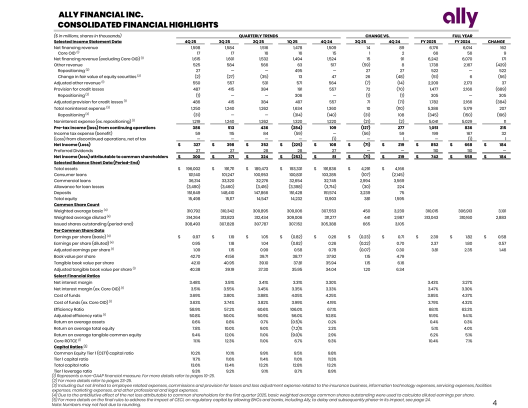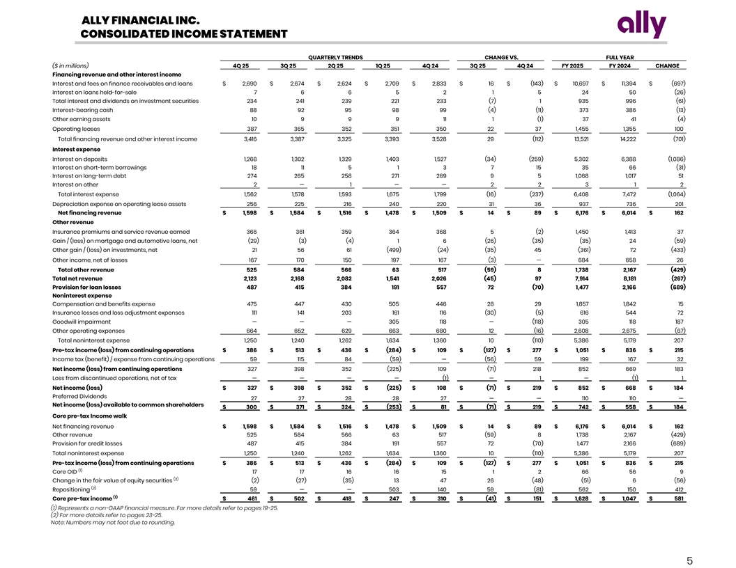 ALLY FINANCIAL INC. CONSOLIDATED FINANCIAL HIGHLIGHTS ($ in millions, shares in thousands) QUARTERLY TRENDS CHANGE VS. FULL YEAR Selected Income Statement Data 4Q 25 3Q 25 2Q 25 1Q 25 4Q 24 3Q 25 4Q 24 FY 2025 FY 2024 CHANGE Net financing revenue 1,598 1,584 1,516 1,478 1,509 14 89 6,176 6,014 162 (1) Core OID 17 17 16 16 15 1 2 66 56 9 (1) Net financing revenue (excluding Core OID) 1,615 1,601 1,532 1,494 1,524 15 91 6,242 6,070 171 Other revenue 525 584 566 63 517 (59) 8 1,738 2,167 (429) (2) Repositioning 27 — — 495 — 27 27 522 — 522 (2) Change in fair value of equity securities (2) (27) (35) 13 47 26 (48) (51) 6 (56) (1) Adjusted other revenue 550 557 531 571 564 (7) (14) 2,209 2,173 37 Provision for credit losses 487 415 384 191 557 72 (70) 1,477 2,166 (689) (2) Repositioning (1) — — 306 — (1) (1) 305 — 305 (1) Adjusted provision for credit losses 486 415 384 497 557 71 (71) 1,782 2,166 (384) (3) Total noninterest expense 1,250 1,240 1,262 1,634 1,360 10 (110) 5,386 5,179 207 (2) Repositioning (31) — — (314) (140) (31) 108 (345) (150) (196) (1) Noninterest expense (ex. repositioning) 1,219 1,240 1,262 1,320 1,220 (21) (2) 5,041 5,029 11 Pre-tax income (loss) from continuing operations 386 513 436 (284) 109 (127) 277 1,051 836 215 Income tax expense (benefit) 59 115 84 (59) — (56) 59 199 167 32 (Loss) from discontinued operations, net of tax — — — — (1) — 1 — (1) 1 Net Income (Loss) $ 327 $ 398 $ 352 $ (225) $ 108 $ (71) $ 219 $ 852 $ 668 $ 184 Preferred Dividends 27 27 28 28 27 — — 110 110 — Net income (loss) attributable to common shareholders $ 300 $ 371 $ 324 $ (253) $ 81 $ (71) $ 219 $ 742 $ 558 $ 184 Selected Balance Sheet Data (Period-End) Total assets $ 196,002 $ 191,711 $ 189,473 $ 193,331 $ 191,836 $ 4,291 $ 4,166 Consumer loans 101,140 101,247 100,953 100,831 103,285 (107) (2,145) Commercial loans 36,314 33,320 32,276 32,654 32,745 2,994 3,569 Allowance for loan losses (3,490) (3,460) (3,416) (3,398) (3,714) (30) 224 Deposits 151,649 148,410 147,866 151,428 151,574 3,239 75 Total equity 15,498 15,117 14,547 14,232 13,903 381 1,595 Common Share Count (4) Weighted average basic 310,792 310,342 309,895 309,006 307,553 450 3,239 310,015 306,913 3,101 (4) Weighted average diluted 314,264 313,823 312,434 309,006 311,277 441 2,987 313,043 310,160 2,883 Issued shares outstanding (period-end) 308,493 307,828 307,787 307,152 305,388 665 3,105 Per Common Share Data (4) Earnings per share (basic) $ 0.97 $ 1.19 $ 1.05 $ (0.82) $ 0.26 $ (0.23) $ 0.71 $ 2.39 $ 1.82 $ 0.58 (4) Earnings per share (diluted) 0.95 1.18 1.04 (0.82) 0.26 (0.22) 0.70 2.37 1.80 0.57 (1) Adjusted earnings per share 1.09 1.15 0.99 0.58 0.78 (0.07) 0.30 3.81 2.35 1.46 Book value per share 42.70 41.56 39.71 38.77 37.92 1.15 4.79 Tangible book value per share 42.10 40.95 39.10 37.81 35.94 1.15 6.16 (1) Adjusted tangible book value per share 40.38 39.19 37.30 35.95 34.04 1.20 6.34 Select Financial Ratios Net interest margin 3 .48% 3 .51% 3.41 % 3.31% 3.30 % 3 .43 % 3.27 % (1) Net interest margin (ex. Core OID) 3 .51 % 3.55% 3 .45% 3.35% 3.33% 3.47 % 3.30% Cost of funds 3.69% 3.80 % 3 .88 % 4 .05 % 4 .25 % 3.85 % 4.37% (1) Cost of funds (ex. Core OID) 3.63% 3.74 % 3 .82% 3.99 % 4.19% 3.79% 4.32% Efficiency Ratio 5 8.9% 57.2 % 60.6 % 106.0% 6 7.1% 68.1% 63.3% (1) Adjusted efficiency ratio 50.8 % 50.0% 5 0.9% 56.0% 52.8% 5 1.9% 5 4.1 % Return on average assets 0.6% 0 .8 % 0.7% ( 0.5) % 0 .2 % 0 .4 % 0.3% Return on average total equity 7.8% 1 0.0% 9 .0 % ( 7.2)% 2 .3 % 5.1% 4 .0% Return on average tangible common equity 9 .4% 12.0% 11.0% (9.0) % 2.9 % 6 .2% 5.1 % (1) Core ROTCE 1 1.1% 12.3% 11.0 % 6.7% 9 .3 % 10.4% 7 .1 % (5) Capital Ratios Common Equity Tier 1 (CET1) capital ratio 1 0.2% 10.1 % 9.9% 9 .5 % 9.8% Tier 1 capital ratio 11.7% 1 1.6% 1 1.4% 11.0% 11.3% Total capital ratio 1 3.6% 1 3.4% 13.2% 12.8 % 1 3.2 % Tier 1 leverage ratio 9.3% 9 .2% 9.1% 8.7 % 8.9% (1) Represents a non-GAAP financial measure. For more details refer to pages 19-25. (2) For more details refer to pages 23-25. (3) Including but not limited to employee related expenses, commissions and provision for losses and loss adjustment expense related to the insurance business, information technology expenses, servicing expenses, facilities expenses, marketing expenses, and other professional and legal expenses. (4) Due to the antidilutive effect of the net loss attributable to common shareholders for the first quarter 2025, basic weighted average common shares outstanding were used to calculate diluted earnings per share. (5) For more details on the final rules to address the impact of CECL on regulatory capital by allowing BHCs and banks, including Ally, to delay and subsequently phase-in its impact, see page 24. 4 Note: Numbers may not foot due to rounding.