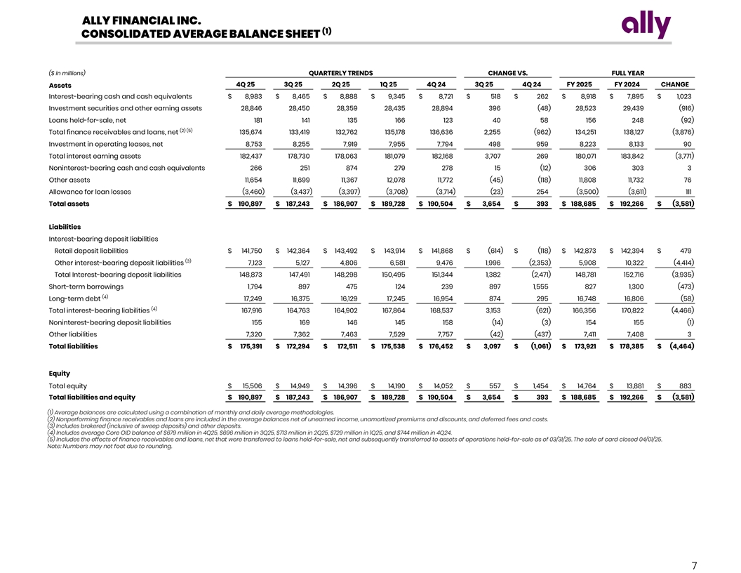 ALLY FINANCIAL INC. CONSOLIDATED PERIOD-END BALANCE SHEET ($ in millions) QUARTERLY TRENDS CHANGE VS. Assets 4Q 25 3Q 25 2Q 25 1Q 25 4Q 24 3Q 25 4Q 24 Cash and cash equivalents Noninterest-bearing $ 405 $ 429 $ 530 $ 543 $ 522 $ (24) $ (117) Interest-bearing 9,625 9,817 10,062 9,866 9,770 (192) (145) Total cash and cash equivalents 10,030 10,246 10,592 10,409 10,292 (216) (262) (1) Investment securities 28,220 27,982 27,896 27,956 27,627 238 593 Loans held-for-sale, net 549 179 185 209 160 370 389 Finance receivables and loans, net 137,454 134,567 133,229 133,485 136,030 2,887 1,424 Allowance for loan losses (3,490) (3,460) (3,416) (3,398) (3,714) (30) 224 Total finance receivables and loans, net 133,964 131,107 129,813 130,087 132,316 2,857 1,648 Investment in operating leases, net 8,772 8,599 7,992 7,879 7,991 173 781 Premiums receivable and other insurance assets 2,844 2,903 2,893 2,806 2,790 (59) 54 Other assets 11,623 10,695 10,102 11,545 10,660 928 963 (2) Assets of operations held-for-sale — — — 2,440 — — — Total assets $ 196,002 $ 191,711 $ 189,473 $ 193,331 $ 191,836 $ 4,291 $ 4,166 Liabilities Deposit liabilities Noninterest-bearing $ 125 $ 174 $ 155 $ 133 $ 131 $ (49) $ (6) Interest-bearing 151,524 148,236 147,711 151,295 151,443 3,288 81 Total deposit liabilities 151,649 148,410 147,866 151,428 151,574 3,239 75 Short-term borrowings 4,695 3,879 3,856 3,339 1,625 816 3,070 Long-term debt 17,070 16,749 15,876 16,465 17,495 321 (425) Interest payable 729 1,097 912 954 890 (368) (161) Unearned insurance premiums and service revenue 3,656 3,648 3,627 3,563 3,535 8 121 Accrued expense and other liabilities 2,705 2,811 2,789 3,315 2,814 (106) (109) Liabilities of operations held-for-sale — — — 35 — — — Total liabilities $ 180,504 $ 176,594 $ 174,926 $ 179,099 $ 177,933 $ 3,910 $ 2,571 Equity (3) Common stock and paid-in capital $ 15,327 $ 15,310 $ 15,291 $ 15,248 $ 15,233 $ 17 $ 94 Preferred stock 2,324 2,324 2,324 2,324 2,324 — — Retained earnings (accumulated deficit) 633 427 151 (78) 270 206 363 Accumulated other comprehensive loss (2,786) (2,944) (3,219) (3,262) (3,924) 158 1,138 Total equity 15,498 15,117 14,547 14,232 13,903 381 1,595 Total liabilities and equity $ 196,002 $ 191,711 $ 189,473 $ 193,331 $ 191,836 $ 4,291 $ 4,166 (1) Includes Held-to-maturity securities. (2) Credit Card moved to Assets of Operations Held-For-Sale (HFS) on 03/31/25. Sale of Credit Card closed on 04/01/25. (3) Includes Treasury stock. Note: Numbers may not foot due to rounding. 6