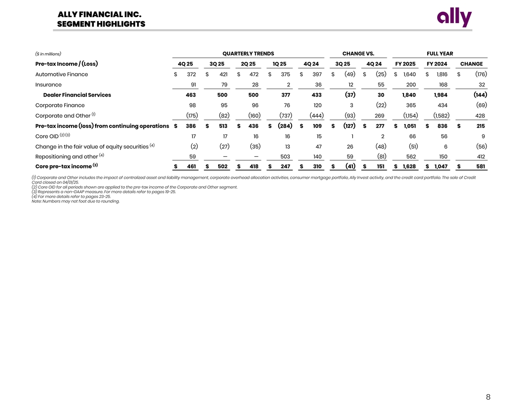 ALLY FINANCIAL INC. SEGMENT HIGHLIGHTS ($ in millions) QUARTERLY TRENDS CHANGE VS. FULL YEAR Pre-tax Income / (Loss) 4Q 25 3Q 25 2Q 25 1Q 25 4Q 24 3Q 25 4Q 24 FY 2025 FY 2024 CHANGE Automotive Finance $ 372 $ 421 $ 472 $ 375 $ 397 $ (49) $ (25) $ 1,640 $ 1,816 $ (176) Insurance 91 79 28 2 36 12 55 200 168 32 Dealer Financial Services 463 500 500 377 433 (37) 30 1,840 1,984 (144) Corporate Finance 98 95 96 76 120 3 (22) 365 434 (69) (1) Corporate and Other (175) (82) (160) (737) (444) (93) 269 (1,154) (1,582) 428 Pre-tax income (loss) from continuing operations $ 386 $ 513 $ 436 $ (284) $ 109 $ (127) $ 277 $ 1,051 $ 836 $ 215 (2) (3) Core OID 17 17 16 16 15 1 2 66 56 9 (4) Change in the fair value of equity securities (2) (27) (35) 13 47 26 (48) (51) 6 (56) (4) Repositioning and other 59 — — 503 140 59 (81) 562 150 412 (3) Core pre-tax income $ 461 $ 502 $ 418 $ 247 $ 310 $ (41) $ 151 $ 1,628 $ 1,047 $ 581 (1) Corporate and Other includes the impact of centralized asset and liability management, corporate overhead allocation activities, consumer mortgage portfolio, Ally Invest activity, and the credit card portfolio. The sale of Credit Card closed on 04/01/25. (2) Core OID for all periods shown are applied to the pre-tax income of the Corporate and Other segment. (3) Represents a non-GAAP measure. For more details refer to pages 19-25. (4) For more details refer to pages 23-25. Note: Numbers may not foot due to rounding. 8