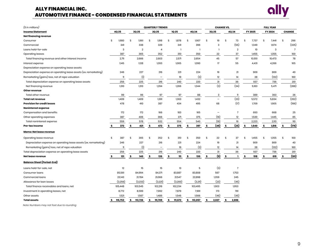 ALLY FINANCIAL INC. AUTOMOTIVE FINANCE - CONDENSED FINANCIAL STATEMENTS ($ in millions) QUARTERLY TRENDS CHANGE VS. FULL YEAR Income Statement 4Q 25 3Q 25 2Q 25 1Q 25 4Q 24 3Q 25 4Q 24 FY 2025 FY 2024 CHANGE Net financing revenue Consumer $ 1,980 $ 1,961 $ 1,918 $ 1,878 $ 1,907 $ 19 $ 73 $ 7,737 $ 7,441 $ 296 Commercial 341 338 329 341 396 3 (55) 1,349 1,674 (325) Loans held-for-sale 3 2 4 1 1 1 2 10 3 7 Operating leases 387 365 352 351 350 22 37 1,455 1,355 100 Total financing revenue and other interest income 2,711 2,666 2,603 2,571 2,654 45 57 10,551 10,473 78 Interest expense 1,145 1,128 1,093 1,065 1,090 17 55 4,431 4,266 165 Depreciation expense on operating lease assets: Depreciation expense on operating lease assets (ex. remarketing) 246 227 216 221 224 19 21 909 869 40 Remarketing (gains) loss, net of repo valuation 11 (1) — 19 (3) 12 14 28 (132) 160 Total depreciation expense on operating lease assets 256 225 216 240 220 31 36 937 736 201 Net financing revenue 1,310 1,313 1,294 1,266 1,344 (3) (34) 5,183 5,471 (288) Other revenue Total other revenue 99 96 97 97 88 3 11 389 363 26 Total net revenue 1,409 1,409 1,391 1,363 1,432 — (23) 5,572 5,834 (262) Provision for credit losses 478 410 387 434 495 68 (17) 1,709 1,905 (196) Noninterest expense Compensation and benefits 172 172 166 183 165 — 7 693 668 25 Other operating expenses 387 406 366 371 375 (19) 12 1,530 1,445 85 Total noninterest expense 559 578 532 554 540 (19) 19 2,223 2,113 110 Pre-tax Income $ 372 $ 421 $ 472 $ 375 $ 397 $ (49) $ (25) $ 1,640 $ 1,816 $ (176) Memo: Net lease revenue Operating lease revenue $ 387 $ 365 $ 352 $ 351 $ 350 $ 22 $ 37 $ 1,455 $ 1,355 $ 100 Depreciation expense on operating lease assets (ex. remarketing) 246 227 216 221 224 19 21 909 869 40 Remarketing (gains) loss, net of repo valuation 11 (1) — 19 (3) 12 14 28 (132) 160 Total depreciation expense on operating lease assets 256 225 216 240 220 31 36 937 736 201 Net lease revenue $ 131 $ 140 $ 136 $ 111 $ 130 $ (9) $ 1 $ 518 $ 619 $ (101) Balance Sheet (Period-End) Loans held-for-sale, net 12 15 15 13 5 (3) 7 Consumer loans 85,561 84,994 84,371 83,887 83,808 567 1,753 Commercial loans 23,143 21,784 21,066 21,547 22,898 1,359 245 Allowance for loan losses (3,256) (3,233) (3,221) (3,200) (3,211) (23) (45) Total finance receivables and loans, net 105,448 103,545 102,216 102,234 103,495 1,903 1,953 Investment in operating leases, net 8,772 8,599 7,992 7,879 7,991 173 781 Other assets 1,521 1,567 1,486 1,546 1,566 (46) (45) Total assets $ 115,753 $ 113,726 $ 111,709 $ 111,672 $ 113,057 $ 2,027 $ 2,696 Note: Numbers may not foot due to rounding 9