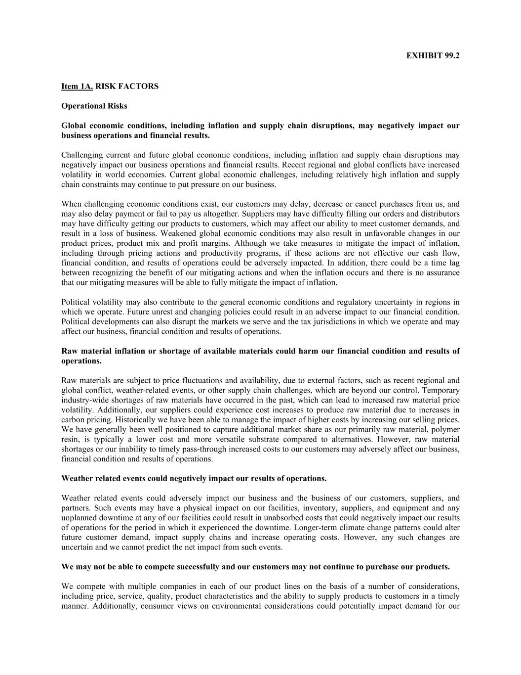 EXHIBIT 99.2 Item 1A. RISK FACTORS Operational Risks Global economic conditions, including inflation and supply chain disruptions, may negatively impact our business operations and financial results. Challenging current and future global economic conditions, including inflation and supply chain disruptions may negatively impact our business operations and financial results. Recent regional and global conflicts have increased volatility in world economies. Current global economic challenges, including relatively high inflation and supply chain constraints may continue to put pressure on our business. When challenging economic conditions exist, our customers may delay, decrease or cancel purchases from us, and may also delay payment or fail to pay us altogether. Suppliers may have difficulty filling our orders and distributors may have difficulty getting our products to customers, which may affect our ability to meet customer demands, and result in a loss of business. Weakened global economic conditions may also result in unfavorable changes in our product prices, product mix and profit margins. Although we take measures to mitigate the impact of inflation, including through pricing actions and productivity programs, if these actions are not effective our cash flow, financial condition, and results of operations could be adversely impacted. In addition, there could be a time lag between recognizing the benefit of our mitigating actions and when the inflation occurs and there is no assurance that our mitigating measures will be able to fully mitigate the impact of inflation. Political volatility may also contribute to the general economic conditions and regulatory uncertainty in regions in which we operate. Future unrest and changing policies could result in an adverse impact to our financial condition. Political developments can also disrupt the markets we serve and the tax jurisdictions in which we operate and may affect our business, financial condition and results of operations. Raw material inflation or shortage of available materials could harm our financial condition and results of operations. Raw materials are subject to price fluctuations and availability, due to external factors, such as recent regional and global conflict, weather-related events, or other supply chain challenges, which are beyond our control. Temporary industry-wide shortages of raw materials have occurred in the past, which can lead to increased raw material price volatility. Additionally, our suppliers could experience cost increases to produce raw material due to increases in carbon pricing. Historically we have been able to manage the impact of higher costs by increasing our selling prices. We have generally been well positioned to capture additional market share as our primarily raw material, polymer resin, is typically a lower cost and more versatile substrate compared to alternatives. However, raw material shortages or our inability to timely pass-through increased costs to our customers may adversely affect our business, financial condition and results of operations. Weather related events could negatively impact our results of operations. Weather related events could adversely impact our business and the business of our customers, suppliers, and partners. Such events may have a physical impact on our facilities, inventory, suppliers, and equipment and any unplanned downtime at any of our facilities could result in unabsorbed costs that could negatively impact our results of operations for the period in which it experienced the downtime. Longer-term climate change patterns could alter future customer demand, impact supply chains and increase operating costs. However, any such changes are uncertain and we cannot predict the net impact from such events. We may not be able to compete successfully and our customers may not continue to purchase our products. We compete with multiple companies in each of our product lines on the basis of a number of considerations, including price, service, quality, product characteristics and the ability to supply products to customers in a timely manner. Additionally, consumer views on environmental considerations could potentially impact demand for our