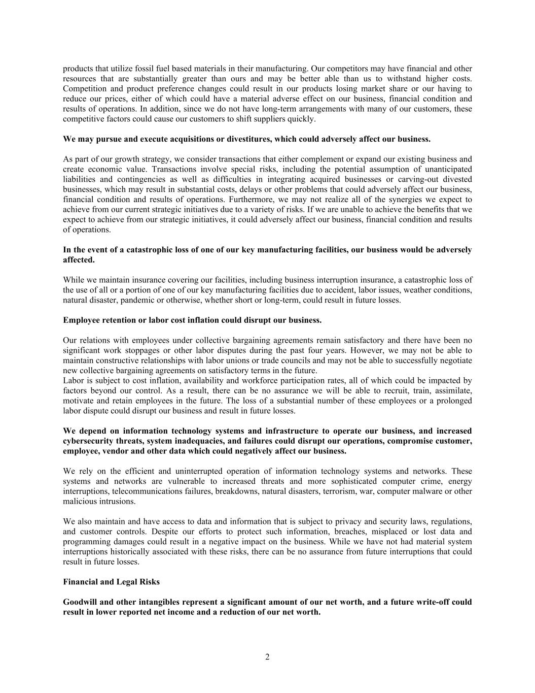 2 products that utilize fossil fuel based materials in their manufacturing. Our competitors may have financial and other resources that are substantially greater than ours and may be better able than us to withstand higher costs. Competition and product preference changes could result in our products losing market share or our having to reduce our prices, either of which could have a material adverse effect on our business, financial condition and results of operations. In addition, since we do not have long-term arrangements with many of our customers, these competitive factors could cause our customers to shift suppliers quickly. We may pursue and execute acquisitions or divestitures, which could adversely affect our business. As part of our growth strategy, we consider transactions that either complement or expand our existing business and create economic value. Transactions involve special risks, including the potential assumption of unanticipated liabilities and contingencies as well as difficulties in integrating acquired businesses or carving-out divested businesses, which may result in substantial costs, delays or other problems that could adversely affect our business, financial condition and results of operations. Furthermore, we may not realize all of the synergies we expect to achieve from our current strategic initiatives due to a variety of risks. If we are unable to achieve the benefits that we expect to achieve from our strategic initiatives, it could adversely affect our business, financial condition and results of operations. In the event of a catastrophic loss of one of our key manufacturing facilities, our business would be adversely affected. While we maintain insurance covering our facilities, including business interruption insurance, a catastrophic loss of the use of all or a portion of one of our key manufacturing facilities due to accident, labor issues, weather conditions, natural disaster, pandemic or otherwise, whether short or long-term, could result in future losses. Employee retention or labor cost inflation could disrupt our business. Our relations with employees under collective bargaining agreements remain satisfactory and there have been no significant work stoppages or other labor disputes during the past four years. However, we may not be able to maintain constructive relationships with labor unions or trade councils and may not be able to successfully negotiate new collective bargaining agreements on satisfactory terms in the future. Labor is subject to cost inflation, availability and workforce participation rates, all of which could be impacted by factors beyond our control. As a result, there can be no assurance we will be able to recruit, train, assimilate, motivate and retain employees in the future. The loss of a substantial number of these employees or a prolonged labor dispute could disrupt our business and result in future losses. We depend on information technology systems and infrastructure to operate our business, and increased cybersecurity threats, system inadequacies, and failures could disrupt our operations, compromise customer, employee, vendor and other data which could negatively affect our business. We rely on the efficient and uninterrupted operation of information technology systems and networks. These systems and networks are vulnerable to increased threats and more sophisticated computer crime, energy interruptions, telecommunications failures, breakdowns, natural disasters, terrorism, war, computer malware or other malicious intrusions. We also maintain and have access to data and information that is subject to privacy and security laws, regulations, and customer controls. Despite our efforts to protect such information, breaches, misplaced or lost data and programming damages could result in a negative impact on the business. While we have not had material system interruptions historically associated with these risks, there can be no assurance from future interruptions that could result in future losses. Financial and Legal Risks Goodwill and other intangibles represent a significant amount of our net worth, and a future write-off could result in lower reported net income and a reduction of our net worth.