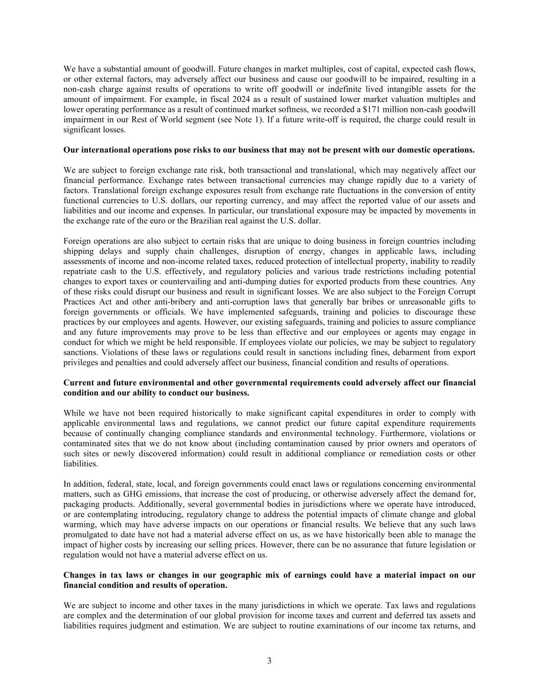 3 We have a substantial amount of goodwill. Future changes in market multiples, cost of capital, expected cash flows, or other external factors, may adversely affect our business and cause our goodwill to be impaired, resulting in a non-cash charge against results of operations to write off goodwill or indefinite lived intangible assets for the amount of impairment. For example, in fiscal 2024 as a result of sustained lower market valuation multiples and lower operating performance as a result of continued market softness, we recorded a $171 million non-cash goodwill impairment in our Rest of World segment (see Note 1). If a future write-off is required, the charge could result in significant losses. Our international operations pose risks to our business that may not be present with our domestic operations. We are subject to foreign exchange rate risk, both transactional and translational, which may negatively affect our financial performance. Exchange rates between transactional currencies may change rapidly due to a variety of factors. Translational foreign exchange exposures result from exchange rate fluctuations in the conversion of entity functional currencies to U.S. dollars, our reporting currency, and may affect the reported value of our assets and liabilities and our income and expenses. In particular, our translational exposure may be impacted by movements in the exchange rate of the euro or the Brazilian real against the U.S. dollar. Foreign operations are also subject to certain risks that are unique to doing business in foreign countries including shipping delays and supply chain challenges, disruption of energy, changes in applicable laws, including assessments of income and non-income related taxes, reduced protection of intellectual property, inability to readily repatriate cash to the U.S. effectively, and regulatory policies and various trade restrictions including potential changes to export taxes or countervailing and anti-dumping duties for exported products from these countries. Any of these risks could disrupt our business and result in significant losses. We are also subject to the Foreign Corrupt Practices Act and other anti-bribery and anti-corruption laws that generally bar bribes or unreasonable gifts to foreign governments or officials. We have implemented safeguards, training and policies to discourage these practices by our employees and agents. However, our existing safeguards, training and policies to assure compliance and any future improvements may prove to be less than effective and our employees or agents may engage in conduct for which we might be held responsible. If employees violate our policies, we may be subject to regulatory sanctions. Violations of these laws or regulations could result in sanctions including fines, debarment from export privileges and penalties and could adversely affect our business, financial condition and results of operations. Current and future environmental and other governmental requirements could adversely affect our financial condition and our ability to conduct our business. While we have not been required historically to make significant capital expenditures in order to comply with applicable environmental laws and regulations, we cannot predict our future capital expenditure requirements because of continually changing compliance standards and environmental technology. Furthermore, violations or contaminated sites that we do not know about (including contamination caused by prior owners and operators of such sites or newly discovered information) could result in additional compliance or remediation costs or other liabilities. In addition, federal, state, local, and foreign governments could enact laws or regulations concerning environmental matters, such as GHG emissions, that increase the cost of producing, or otherwise adversely affect the demand for, packaging products. Additionally, several governmental bodies in jurisdictions where we operate have introduced, or are contemplating introducing, regulatory change to address the potential impacts of climate change and global warming, which may have adverse impacts on our operations or financial results. We believe that any such laws promulgated to date have not had a material adverse effect on us, as we have historically been able to manage the impact of higher costs by increasing our selling prices. However, there can be no assurance that future legislation or regulation would not have a material adverse effect on us. Changes in tax laws or changes in our geographic mix of earnings could have a material impact on our financial condition and results of operation. We are subject to income and other taxes in the many jurisdictions in which we operate. Tax laws and regulations are complex and the determination of our global provision for income taxes and current and deferred tax assets and liabilities requires judgment and estimation. We are subject to routine examinations of our income tax returns, and