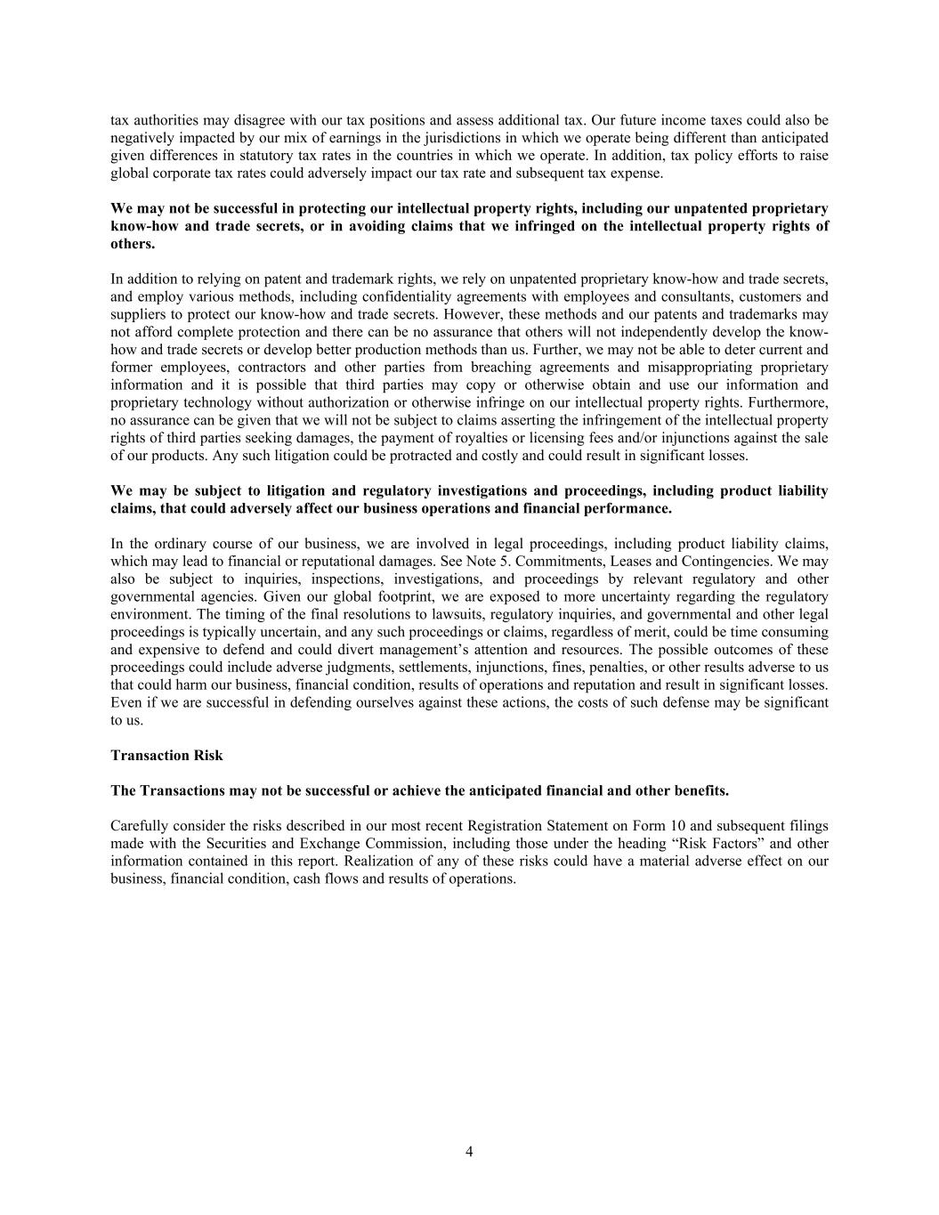 4 tax authorities may disagree with our tax positions and assess additional tax. Our future income taxes could also be negatively impacted by our mix of earnings in the jurisdictions in which we operate being different than anticipated given differences in statutory tax rates in the countries in which we operate. In addition, tax policy efforts to raise global corporate tax rates could adversely impact our tax rate and subsequent tax expense. We may not be successful in protecting our intellectual property rights, including our unpatented proprietary know-how and trade secrets, or in avoiding claims that we infringed on the intellectual property rights of others. In addition to relying on patent and trademark rights, we rely on unpatented proprietary know-how and trade secrets, and employ various methods, including confidentiality agreements with employees and consultants, customers and suppliers to protect our know-how and trade secrets. However, these methods and our patents and trademarks may not afford complete protection and there can be no assurance that others will not independently develop the know- how and trade secrets or develop better production methods than us. Further, we may not be able to deter current and former employees, contractors and other parties from breaching agreements and misappropriating proprietary information and it is possible that third parties may copy or otherwise obtain and use our information and proprietary technology without authorization or otherwise infringe on our intellectual property rights. Furthermore, no assurance can be given that we will not be subject to claims asserting the infringement of the intellectual property rights of third parties seeking damages, the payment of royalties or licensing fees and/or injunctions against the sale of our products. Any such litigation could be protracted and costly and could result in significant losses. We may be subject to litigation and regulatory investigations and proceedings, including product liability claims, that could adversely affect our business operations and financial performance. In the ordinary course of our business, we are involved in legal proceedings, including product liability claims, which may lead to financial or reputational damages. See Note 5. Commitments, Leases and Contingencies. We may also be subject to inquiries, inspections, investigations, and proceedings by relevant regulatory and other governmental agencies. Given our global footprint, we are exposed to more uncertainty regarding the regulatory environment. The timing of the final resolutions to lawsuits, regulatory inquiries, and governmental and other legal proceedings is typically uncertain, and any such proceedings or claims, regardless of merit, could be time consuming and expensive to defend and could divert management’s attention and resources. The possible outcomes of these proceedings could include adverse judgments, settlements, injunctions, fines, penalties, or other results adverse to us that could harm our business, financial condition, results of operations and reputation and result in significant losses. Even if we are successful in defending ourselves against these actions, the costs of such defense may be significant to us. Transaction Risk The Transactions may not be successful or achieve the anticipated financial and other benefits. Carefully consider the risks described in our most recent Registration Statement on Form 10 and subsequent filings made with the Securities and Exchange Commission, including those under the heading “Risk Factors” and other information contained in this report. Realization of any of these risks could have a material adverse effect on our business, financial condition, cash flows and results of operations.