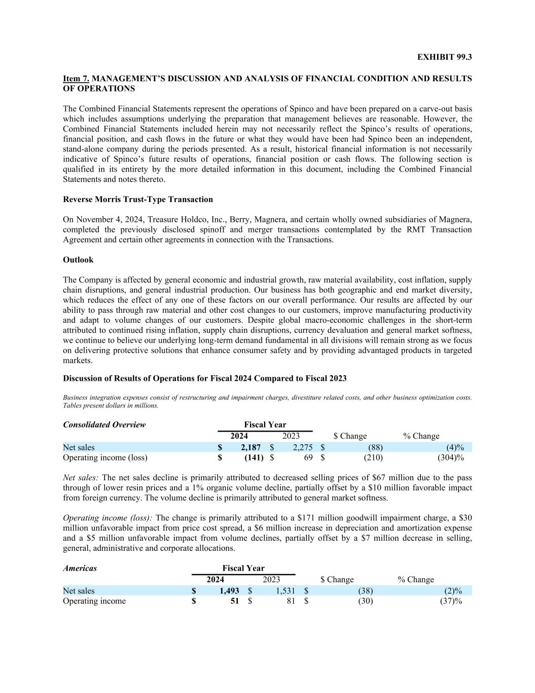 EXHIBIT 99.3 Item 7. MANAGEMENT’S DISCUSSION AND ANALYSIS OF FINANCIAL CONDITION AND RESULTS OF OPERATIONS The Combined Financial Statements represent the operations of Spinco and have been prepared on a carve-out basis which includes assumptions underlying the preparation that management believes are reasonable. However, the Combined Financial Statements included herein may not necessarily reflect the Spinco’s results of operations, financial position, and cash flows in the future or what they would have been had Spinco been an independent, stand-alone company during the periods presented. As a result, historical financial information is not necessarily indicative of Spinco’s future results of operations, financial position or cash flows. The following section is qualified in its entirety by the more detailed information in this document, including the Combined Financial Statements and notes thereto. Reverse Morris Trust-Type Transaction On November 4, 2024, Treasure Holdco, Inc., Berry, Magnera, and certain wholly owned subsidiaries of Magnera, completed the previously disclosed spinoff and merger transactions contemplated by the RMT Transaction Agreement and certain other agreements in connection with the Transactions. Outlook The Company is affected by general economic and industrial growth, raw material availability, cost inflation, supply chain disruptions, and general industrial production. Our business has both geographic and end market diversity, which reduces the effect of any one of these factors on our overall performance. Our results are affected by our ability to pass through raw material and other cost changes to our customers, improve manufacturing productivity and adapt to volume changes of our customers. Despite global macro-economic challenges in the short-term attributed to continued rising inflation, supply chain disruptions, currency devaluation and general market softness, we continue to believe our underlying long-term demand fundamental in all divisions will remain strong as we focus on delivering protective solutions that enhance consumer safety and by providing advantaged products in targeted markets. Discussion of Results of Operations for Fiscal 2024 Compared to Fiscal 2023 Business integration expenses consist of restructuring and impairment charges, divestiture related costs, and other business optimization costs. Tables present dollars in millions. Consolidated Overview Fiscal Year 2024 2023 $ Change % Change Net sales $ 2,187 $ 2,275 $ (88 ) (4 )% Operating income (loss) $ (141 ) $ 69 $ (210 ) (304 )% Net sales: The net sales decline is primarily attributed to decreased selling prices of $67 million due to the pass through of lower resin prices and a 1% organic volume decline, partially offset by a $10 million favorable impact from foreign currency. The volume decline is primarily attributed to general market softness. Operating income (loss): The change is primarily attributed to a $171 million goodwill impairment charge, a $30 million unfavorable impact from price cost spread, a $6 million increase in depreciation and amortization expense and a $5 million unfavorable impact from volume declines, partially offset by a $7 million decrease in selling, general, administrative and corporate allocations. Americas Fiscal Year 2024 2023 $ Change % Change Net sales $ 1,493 $ 1,531 $ (38 ) (2 )% Operating income $ 51 $ 81 $ (30 ) (37 )%