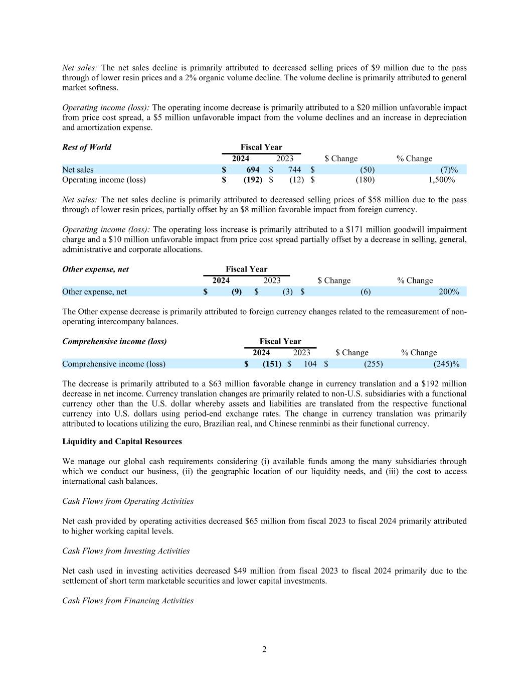 2 Net sales: The net sales decline is primarily attributed to decreased selling prices of $9 million due to the pass through of lower resin prices and a 2% organic volume decline. The volume decline is primarily attributed to general market softness. Operating income (loss): The operating income decrease is primarily attributed to a $20 million unfavorable impact from price cost spread, a $5 million unfavorable impact from the volume declines and an increase in depreciation and amortization expense. Rest of World Fiscal Year 2024 2023 $ Change % Change Net sales $ 694 $ 744 $ (50 ) (7 )% Operating income (loss) $ (192 ) $ (12 ) $ (180 ) 1,500 % Net sales: The net sales decline is primarily attributed to decreased selling prices of $58 million due to the pass through of lower resin prices, partially offset by an $8 million favorable impact from foreign currency. Operating income (loss): The operating loss increase is primarily attributed to a $171 million goodwill impairment charge and a $10 million unfavorable impact from price cost spread partially offset by a decrease in selling, general, administrative and corporate allocations. Other expense, net Fiscal Year 2024 2023 $ Change % Change Other expense, net $ (9 ) $ (3 ) $ (6 ) 200 % The Other expense decrease is primarily attributed to foreign currency changes related to the remeasurement of non- operating intercompany balances. Comprehensive income (loss) Fiscal Year 2024 2023 $ Change % Change Comprehensive income (loss) $ (151 ) $ 104 $ (255 ) (245 )% The decrease is primarily attributed to a $63 million favorable change in currency translation and a $192 million decrease in net income. Currency translation changes are primarily related to non-U.S. subsidiaries with a functional currency other than the U.S. dollar whereby assets and liabilities are translated from the respective functional currency into U.S. dollars using period-end exchange rates. The change in currency translation was primarily attributed to locations utilizing the euro, Brazilian real, and Chinese renminbi as their functional currency. Liquidity and Capital Resources We manage our global cash requirements considering (i) available funds among the many subsidiaries through which we conduct our business, (ii) the geographic location of our liquidity needs, and (iii) the cost to access international cash balances. Cash Flows from Operating Activities Net cash provided by operating activities decreased $65 million from fiscal 2023 to fiscal 2024 primarily attributed to higher working capital levels. Cash Flows from Investing Activities Net cash used in investing activities decreased $49 million from fiscal 2023 to fiscal 2024 primarily due to the settlement of short term marketable securities and lower capital investments. Cash Flows from Financing Activities
