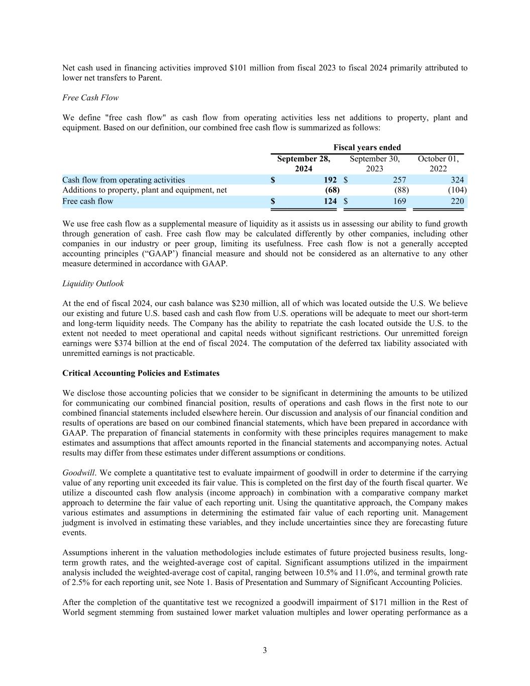 3 Net cash used in financing activities improved $101 million from fiscal 2023 to fiscal 2024 primarily attributed to lower net transfers to Parent. Free Cash Flow We define "free cash flow" as cash flow from operating activities less net additions to property, plant and equipment. Based on our definition, our combined free cash flow is summarized as follows: Fiscal years ended September 28, 2024 September 30, 2023 October 01, 2022 Cash flow from operating activities $ 192 $ 257 324 Additions to property, plant and equipment, net (68 ) (88 ) (104 ) Free cash flow $ 124 $ 169 220 We use free cash flow as a supplemental measure of liquidity as it assists us in assessing our ability to fund growth through generation of cash. Free cash flow may be calculated differently by other companies, including other companies in our industry or peer group, limiting its usefulness. Free cash flow is not a generally accepted accounting principles (“GAAP’) financial measure and should not be considered as an alternative to any other measure determined in accordance with GAAP. Liquidity Outlook At the end of fiscal 2024, our cash balance was $230 million, all of which was located outside the U.S. We believe our existing and future U.S. based cash and cash flow from U.S. operations will be adequate to meet our short-term and long-term liquidity needs. The Company has the ability to repatriate the cash located outside the U.S. to the extent not needed to meet operational and capital needs without significant restrictions. Our unremitted foreign earnings were $374 billion at the end of fiscal 2024. The computation of the deferred tax liability associated with unremitted earnings is not practicable. Critical Accounting Policies and Estimates We disclose those accounting policies that we consider to be significant in determining the amounts to be utilized for communicating our combined financial position, results of operations and cash flows in the first note to our combined financial statements included elsewhere herein. Our discussion and analysis of our financial condition and results of operations are based on our combined financial statements, which have been prepared in accordance with GAAP. The preparation of financial statements in conformity with these principles requires management to make estimates and assumptions that affect amounts reported in the financial statements and accompanying notes. Actual results may differ from these estimates under different assumptions or conditions. Goodwill. We complete a quantitative test to evaluate impairment of goodwill in order to determine if the carrying value of any reporting unit exceeded its fair value. This is completed on the first day of the fourth fiscal quarter. We utilize a discounted cash flow analysis (income approach) in combination with a comparative company market approach to determine the fair value of each reporting unit. Using the quantitative approach, the Company makes various estimates and assumptions in determining the estimated fair value of each reporting unit. Management judgment is involved in estimating these variables, and they include uncertainties since they are forecasting future events. Assumptions inherent in the valuation methodologies include estimates of future projected business results, long- term growth rates, and the weighted-average cost of capital. Significant assumptions utilized in the impairment analysis included the weighted-average cost of capital, ranging between 10.5% and 11.0%, and terminal growth rate of 2.5% for each reporting unit, see Note 1. Basis of Presentation and Summary of Significant Accounting Policies. After the completion of the quantitative test we recognized a goodwill impairment of $171 million in the Rest of World segment stemming from sustained lower market valuation multiples and lower operating performance as a