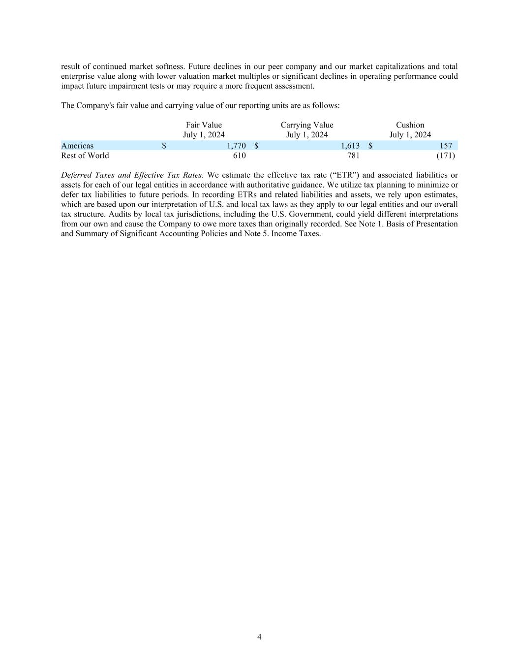 4 result of continued market softness. Future declines in our peer company and our market capitalizations and total enterprise value along with lower valuation market multiples or significant declines in operating performance could impact future impairment tests or may require a more frequent assessment. The Company's fair value and carrying value of our reporting units are as follows: Fair Value July 1, 2024 Carrying Value July 1, 2024 Cushion July 1, 2024 Americas $ 1,770 $ 1,613 $ 157 Rest of World 610 781 (171 ) Deferred Taxes and Effective Tax Rates. We estimate the effective tax rate (“ETR”) and associated liabilities or assets for each of our legal entities in accordance with authoritative guidance. We utilize tax planning to minimize or defer tax liabilities to future periods. In recording ETRs and related liabilities and assets, we rely upon estimates, which are based upon our interpretation of U.S. and local tax laws as they apply to our legal entities and our overall tax structure. Audits by local tax jurisdictions, including the U.S. Government, could yield different interpretations from our own and cause the Company to owe more taxes than originally recorded. See Note 1. Basis of Presentation and Summary of Significant Accounting Policies and Note 5. Income Taxes.