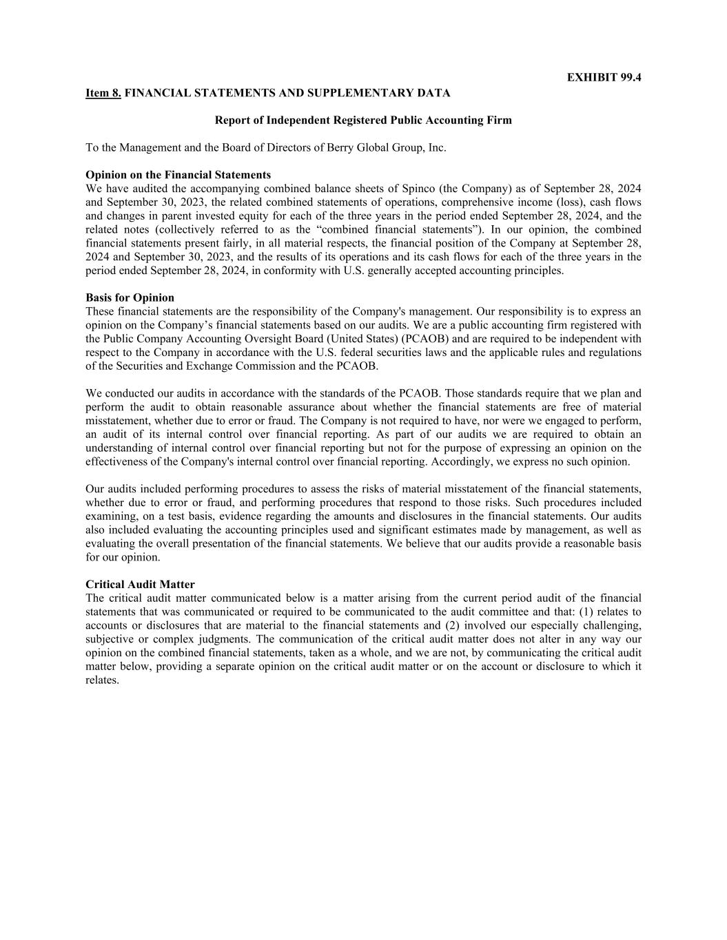 EXHIBIT 99.4 Item 8. FINANCIAL STATEMENTS AND SUPPLEMENTARY DATA Report of Independent Registered Public Accounting Firm To the Management and the Board of Directors of Berry Global Group, Inc. Opinion on the Financial Statements We have audited the accompanying combined balance sheets of Spinco (the Company) as of September 28, 2024 and September 30, 2023, the related combined statements of operations, comprehensive income (loss), cash flows and changes in parent invested equity for each of the three years in the period ended September 28, 2024, and the related notes (collectively referred to as the “combined financial statements”). In our opinion, the combined financial statements present fairly, in all material respects, the financial position of the Company at September 28, 2024 and September 30, 2023, and the results of its operations and its cash flows for each of the three years in the period ended September 28, 2024, in conformity with U.S. generally accepted accounting principles. Basis for Opinion These financial statements are the responsibility of the Company's management. Our responsibility is to express an opinion on the Company’s financial statements based on our audits. We are a public accounting firm registered with the Public Company Accounting Oversight Board (United States) (PCAOB) and are required to be independent with respect to the Company in accordance with the U.S. federal securities laws and the applicable rules and regulations of the Securities and Exchange Commission and the PCAOB. We conducted our audits in accordance with the standards of the PCAOB. Those standards require that we plan and perform the audit to obtain reasonable assurance about whether the financial statements are free of material misstatement, whether due to error or fraud. The Company is not required to have, nor were we engaged to perform, an audit of its internal control over financial reporting. As part of our audits we are required to obtain an understanding of internal control over financial reporting but not for the purpose of expressing an opinion on the effectiveness of the Company's internal control over financial reporting. Accordingly, we express no such opinion. Our audits included performing procedures to assess the risks of material misstatement of the financial statements, whether due to error or fraud, and performing procedures that respond to those risks. Such procedures included examining, on a test basis, evidence regarding the amounts and disclosures in the financial statements. Our audits also included evaluating the accounting principles used and significant estimates made by management, as well as evaluating the overall presentation of the financial statements. We believe that our audits provide a reasonable basis for our opinion. Critical Audit Matter The critical audit matter communicated below is a matter arising from the current period audit of the financial statements that was communicated or required to be communicated to the audit committee and that: (1) relates to accounts or disclosures that are material to the financial statements and (2) involved our especially challenging, subjective or complex judgments. The communication of the critical audit matter does not alter in any way our opinion on the combined financial statements, taken as a whole, and we are not, by communicating the critical audit matter below, providing a separate opinion on the critical audit matter or on the account or disclosure to which it relates.
