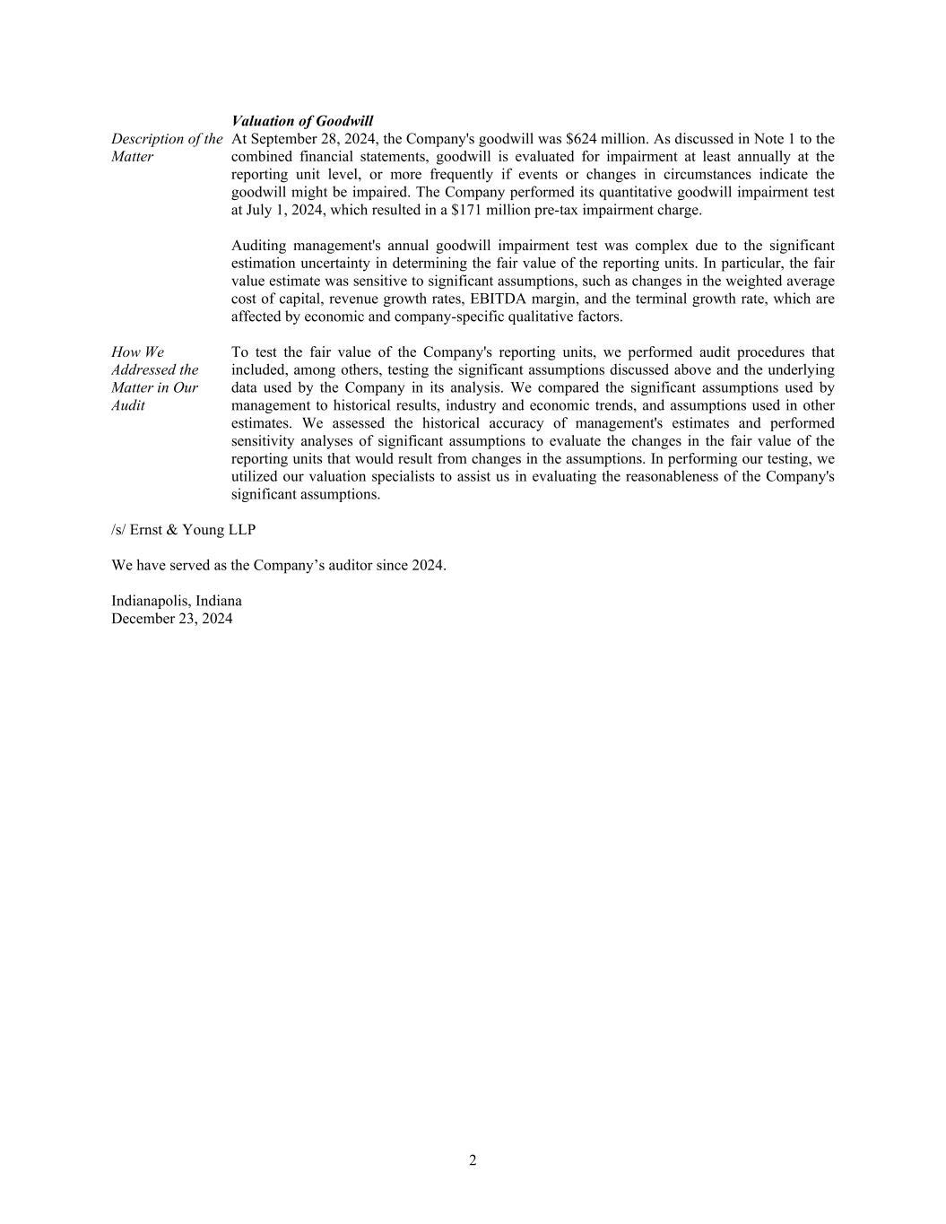2 Valuation of Goodwill Description of the Matter At September 28, 2024, the Company's goodwill was $624 million. As discussed in Note 1 to the combined financial statements, goodwill is evaluated for impairment at least annually at the reporting unit level, or more frequently if events or changes in circumstances indicate the goodwill might be impaired. The Company performed its quantitative goodwill impairment test at July 1, 2024, which resulted in a $171 million pre-tax impairment charge. Auditing management's annual goodwill impairment test was complex due to the significant estimation uncertainty in determining the fair value of the reporting units. In particular, the fair value estimate was sensitive to significant assumptions, such as changes in the weighted average cost of capital, revenue growth rates, EBITDA margin, and the terminal growth rate, which are affected by economic and company-specific qualitative factors. How We Addressed the Matter in Our Audit To test the fair value of the Company's reporting units, we performed audit procedures that included, among others, testing the significant assumptions discussed above and the underlying data used by the Company in its analysis. We compared the significant assumptions used by management to historical results, industry and economic trends, and assumptions used in other estimates. We assessed the historical accuracy of management's estimates and performed sensitivity analyses of significant assumptions to evaluate the changes in the fair value of the reporting units that would result from changes in the assumptions. In performing our testing, we utilized our valuation specialists to assist us in evaluating the reasonableness of the Company's significant assumptions. /s/ Ernst & Young LLP We have served as the Company’s auditor since 2024. Indianapolis, Indiana December 23, 2024