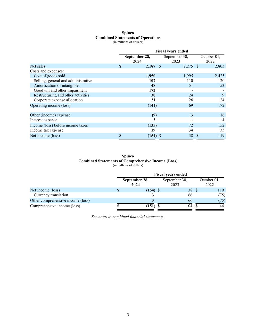3 Spinco Combined Statements of Operations (in millions of dollars) Fiscal years ended September 28, 2024 September 30, 2023 October 01, 2022 Net sales $ 2,187 $ 2,275 $ 2,803 Costs and expenses: Cost of goods sold 1,950 1,995 2,425 Selling, general and administrative 107 110 120 Amortization of intangibles 48 51 53 Goodwill and other impairment 172 - - Restructuring and other activities 30 24 9 Corporate expense allocation 21 26 24 Operating income (loss) (141 ) 69 172 Other (income) expense (9 ) (3 ) 16 Interest expense 3 - 4 Income (loss) before income taxes (135 ) 72 152 Income tax expense 19 34 33 Net income (loss) $ (154 ) $ 38 $ 119 Spinco Combined Statements of Comprehensive Income (Loss) (in millions of dollars) Fiscal years ended September 28, 2024 September 30, 2023 October 01, 2022 Net income (loss) $ (154 ) $ 38 $ 119 Currency translation 3 66 (75 ) Other comprehensive income (loss) 3 66 (75 ) Comprehensive income (loss) $ (151 ) $ 104 $ 44 See notes to combined financial statements.