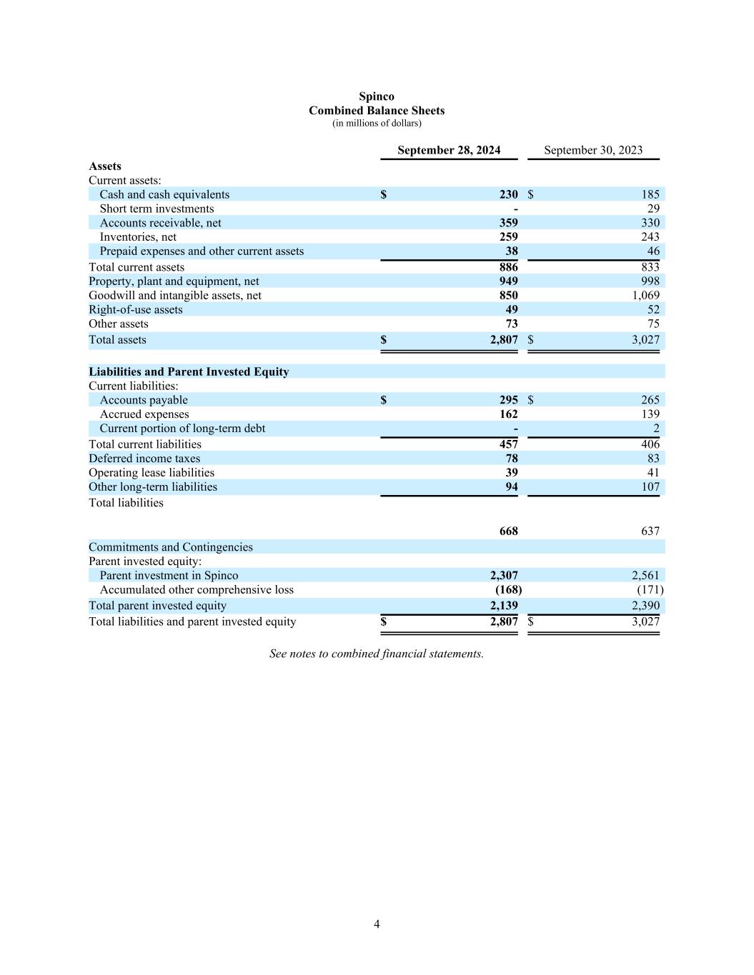 4 Spinco Combined Balance Sheets (in millions of dollars) September 28, 2024 September 30, 2023 Assets Current assets: Cash and cash equivalents $ 230 $ 185 Short term investments - 29 Accounts receivable, net 359 330 Inventories, net 259 243 Prepaid expenses and other current assets 38 46 Total current assets 886 833 Property, plant and equipment, net 949 998 Goodwill and intangible assets, net 850 1,069 Right-of-use assets 49 52 Other assets 73 75 Total assets $ 2,807 $ 3,027 Liabilities and Parent Invested Equity Current liabilities: Accounts payable $ 295 $ 265 Accrued expenses 162 139 Current portion of long-term debt - 2 Total current liabilities 457 406 Deferred income taxes 78 83 Operating lease liabilities 39 41 Other long-term liabilities 94 107 Total liabilities 668 637 Commitments and Contingencies Parent invested equity: Parent investment in Spinco 2,307 2,561 Accumulated other comprehensive loss (168 ) (171 ) Total parent invested equity 2,139 2,390 Total liabilities and parent invested equity $ 2,807 $ 3,027 See notes to combined financial statements.