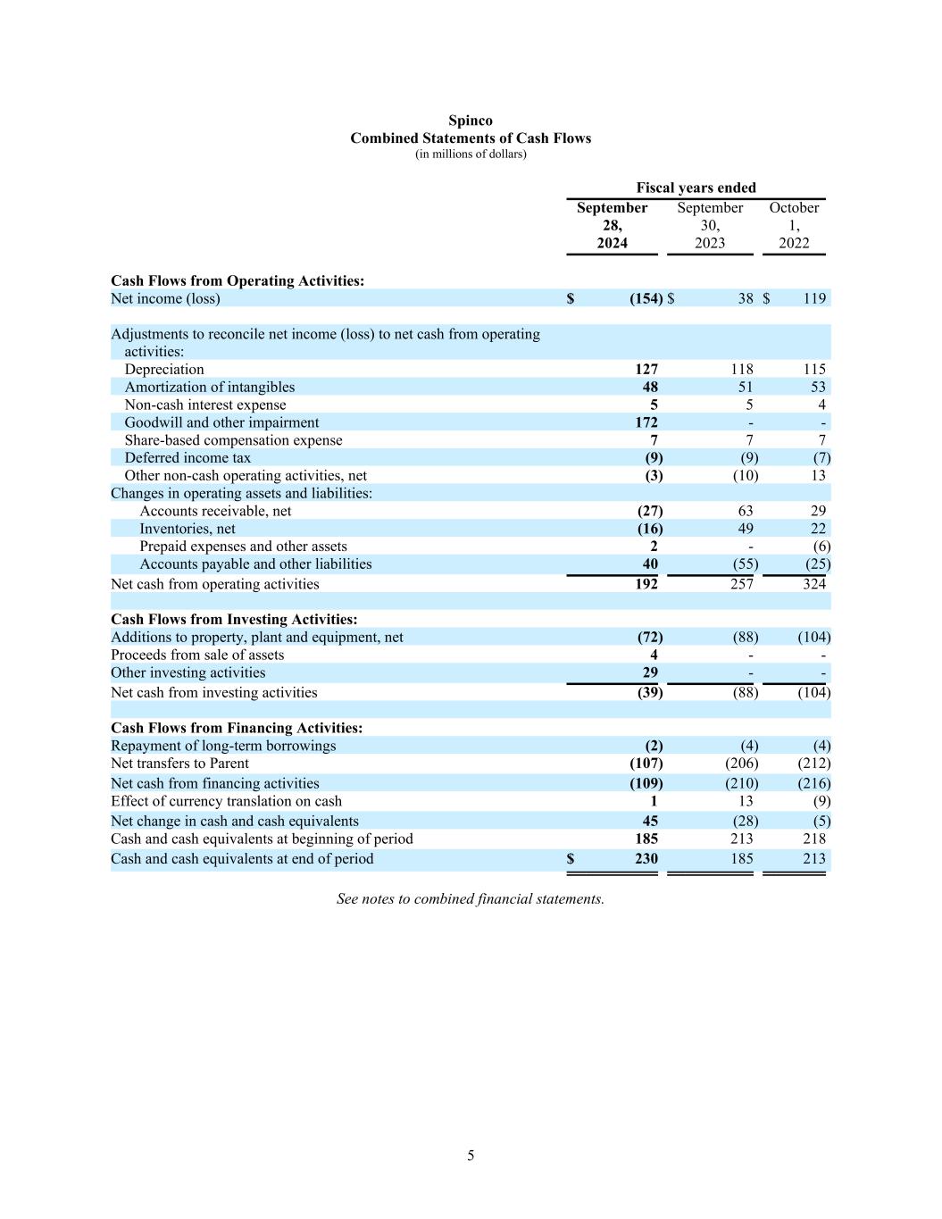 5 Spinco Combined Statements of Cash Flows (in millions of dollars) Fiscal years ended September 28, 2024 September 30, 2023 October 1, 2022 Cash Flows from Operating Activities: Net income (loss) $ (154 ) $ 38 $ 119 Adjustments to reconcile net income (loss) to net cash from operating activities: Depreciation 127 118 115 Amortization of intangibles 48 51 53 Non-cash interest expense 5 5 4 Goodwill and other impairment 172 - - Share-based compensation expense 7 7 7 Deferred income tax (9 ) (9 ) (7 ) Other non-cash operating activities, net (3 ) (10 ) 13 Changes in operating assets and liabilities: Accounts receivable, net (27 ) 63 29 Inventories, net (16 ) 49 22 Prepaid expenses and other assets 2 - (6 ) Accounts payable and other liabilities 40 (55 ) (25 ) Net cash from operating activities 192 257 324 Cash Flows from Investing Activities: Additions to property, plant and equipment, net (72 ) (88 ) (104 ) Proceeds from sale of assets 4 - - Other investing activities 29 - - Net cash from investing activities (39 ) (88 ) (104 ) Cash Flows from Financing Activities: Repayment of long-term borrowings (2 ) (4 ) (4 ) Net transfers to Parent (107 ) (206 ) (212 ) Net cash from financing activities (109 ) (210 ) (216 ) Effect of currency translation on cash 1 13 (9 ) Net change in cash and cash equivalents 45 (28 ) (5 ) Cash and cash equivalents at beginning of period 185 213 218 Cash and cash equivalents at end of period $ 230 185 213 See notes to combined financial statements.