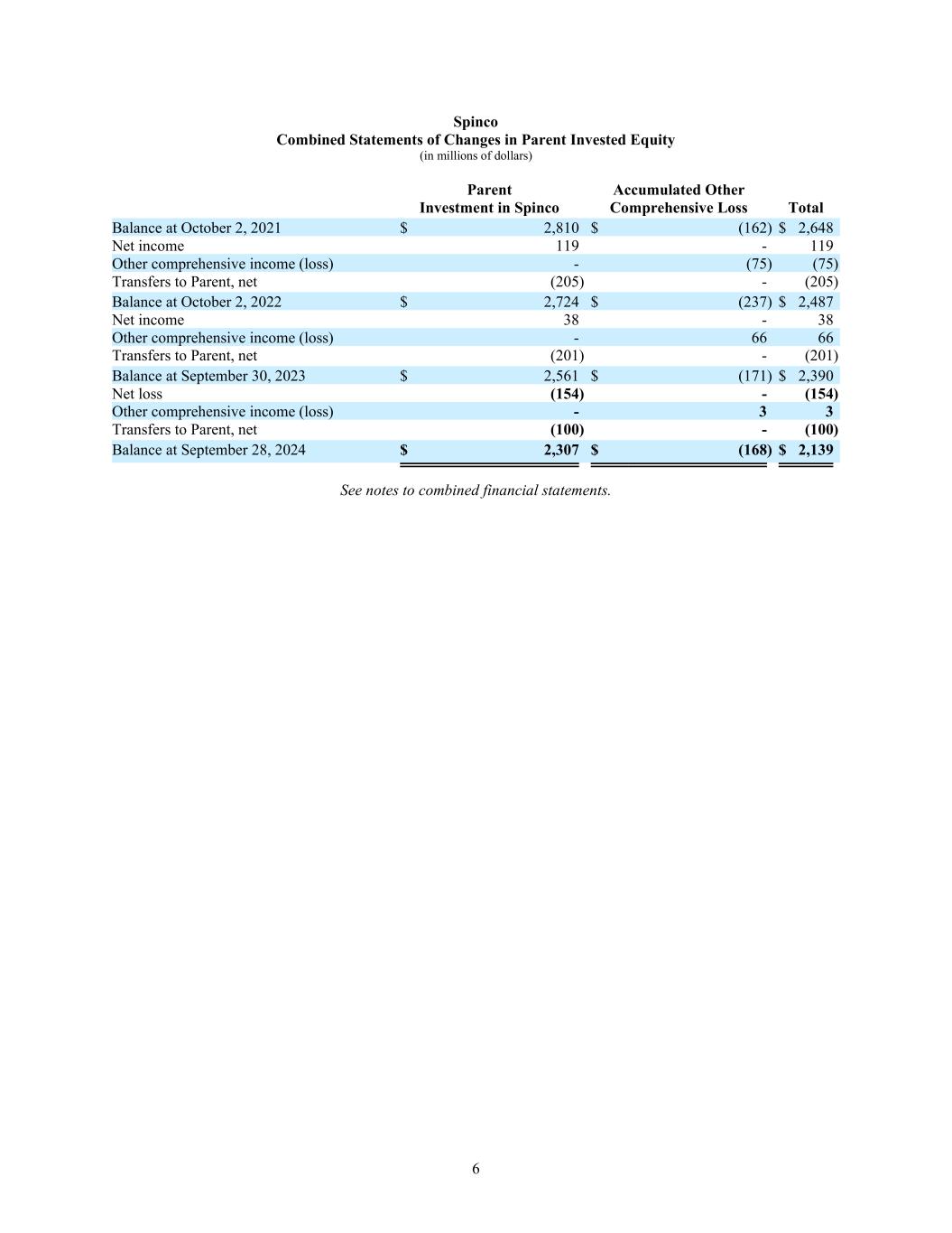 6 Spinco Combined Statements of Changes in Parent Invested Equity (in millions of dollars) Parent Investment in Spinco Accumulated Other Comprehensive Loss Total Balance at October 2, 2021 $ 2,810 $ (162 ) $ 2,648 Net income 119 - 119 Other comprehensive income (loss) - (75 ) (75 ) Transfers to Parent, net (205 ) - (205 ) Balance at October 2, 2022 $ 2,724 $ (237 ) $ 2,487 Net income 38 - 38 Other comprehensive income (loss) - 66 66 Transfers to Parent, net (201 ) - (201 ) Balance at September 30, 2023 $ 2,561 $ (171 ) $ 2,390 Net loss (154 ) - (154 ) Other comprehensive income (loss) - 3 3 Transfers to Parent, net (100 ) - (100 ) Balance at September 28, 2024 $ 2,307 $ (168 ) $ 2,139 See notes to combined financial statements.