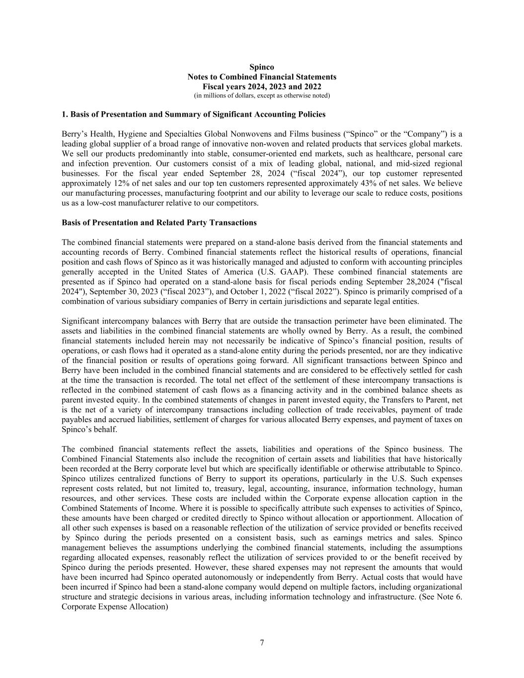 7 Spinco Notes to Combined Financial Statements Fiscal years 2024, 2023 and 2022 (in millions of dollars, except as otherwise noted) 1. Basis of Presentation and Summary of Significant Accounting Policies Berry’s Health, Hygiene and Specialties Global Nonwovens and Films business (“Spinco” or the “Company”) is a leading global supplier of a broad range of innovative non-woven and related products that services global markets. We sell our products predominantly into stable, consumer-oriented end markets, such as healthcare, personal care and infection prevention. Our customers consist of a mix of leading global, national, and mid-sized regional businesses. For the fiscal year ended September 28, 2024 (“fiscal 2024”), our top customer represented approximately 12% of net sales and our top ten customers represented approximately 43% of net sales. We believe our manufacturing processes, manufacturing footprint and our ability to leverage our scale to reduce costs, positions us as a low-cost manufacturer relative to our competitors. Basis of Presentation and Related Party Transactions The combined financial statements were prepared on a stand-alone basis derived from the financial statements and accounting records of Berry. Combined financial statements reflect the historical results of operations, financial position and cash flows of Spinco as it was historically managed and adjusted to conform with accounting principles generally accepted in the United States of America (U.S. GAAP). These combined financial statements are presented as if Spinco had operated on a stand-alone basis for fiscal periods ending September 28,2024 ("fiscal 2024"), September 30, 2023 (“fiscal 2023”), and October 1, 2022 (“fiscal 2022”). Spinco is primarily comprised of a combination of various subsidiary companies of Berry in certain jurisdictions and separate legal entities. Significant intercompany balances with Berry that are outside the transaction perimeter have been eliminated. The assets and liabilities in the combined financial statements are wholly owned by Berry. As a result, the combined financial statements included herein may not necessarily be indicative of Spinco’s financial position, results of operations, or cash flows had it operated as a stand-alone entity during the periods presented, nor are they indicative of the financial position or results of operations going forward. All significant transactions between Spinco and Berry have been included in the combined financial statements and are considered to be effectively settled for cash at the time the transaction is recorded. The total net effect of the settlement of these intercompany transactions is reflected in the combined statement of cash flows as a financing activity and in the combined balance sheets as parent invested equity. In the combined statements of changes in parent invested equity, the Transfers to Parent, net is the net of a variety of intercompany transactions including collection of trade receivables, payment of trade payables and accrued liabilities, settlement of charges for various allocated Berry expenses, and payment of taxes on Spinco’s behalf. The combined financial statements reflect the assets, liabilities and operations of the Spinco business. The Combined Financial Statements also include the recognition of certain assets and liabilities that have historically been recorded at the Berry corporate level but which are specifically identifiable or otherwise attributable to Spinco. Spinco utilizes centralized functions of Berry to support its operations, particularly in the U.S. Such expenses represent costs related, but not limited to, treasury, legal, accounting, insurance, information technology, human resources, and other services. These costs are included within the Corporate expense allocation caption in the Combined Statements of Income. Where it is possible to specifically attribute such expenses to activities of Spinco, these amounts have been charged or credited directly to Spinco without allocation or apportionment. Allocation of all other such expenses is based on a reasonable reflection of the utilization of service provided or benefits received by Spinco during the periods presented on a consistent basis, such as earnings metrics and sales. Spinco management believes the assumptions underlying the combined financial statements, including the assumptions regarding allocated expenses, reasonably reflect the utilization of services provided to or the benefit received by Spinco during the periods presented. However, these shared expenses may not represent the amounts that would have been incurred had Spinco operated autonomously or independently from Berry. Actual costs that would have been incurred if Spinco had been a stand-alone company would depend on multiple factors, including organizational structure and strategic decisions in various areas, including information technology and infrastructure. (See Note 6. Corporate Expense Allocation)