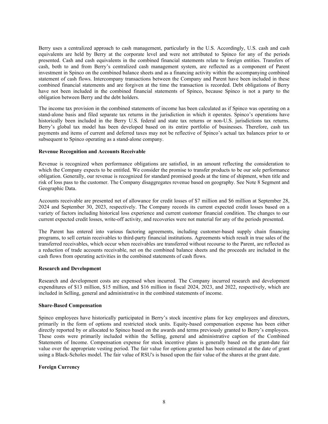8 Berry uses a centralized approach to cash management, particularly in the U.S. Accordingly, U.S. cash and cash equivalents are held by Berry at the corporate level and were not attributed to Spinco for any of the periods presented. Cash and cash equivalents in the combined financial statements relate to foreign entities. Transfers of cash, both to and from Berry’s centralized cash management system, are reflected as a component of Parent investment in Spinco on the combined balance sheets and as a financing activity within the accompanying combined statement of cash flows. Intercompany transactions between the Company and Parent have been included in these combined financial statements and are forgiven at the time the transaction is recorded. Debt obligations of Berry have not been included in the combined financial statements of Spinco, because Spinco is not a party to the obligation between Berry and the debt holders. The income tax provision in the combined statements of income has been calculated as if Spinco was operating on a stand-alone basis and filed separate tax returns in the jurisdiction in which it operates. Spinco’s operations have historically been included in the Berry U.S. federal and state tax returns or non-U.S. jurisdictions tax returns. Berry’s global tax model has been developed based on its entire portfolio of businesses. Therefore, cash tax payments and items of current and deferred taxes may not be reflective of Spinco’s actual tax balances prior to or subsequent to Spinco operating as a stand-alone company. Revenue Recognition and Accounts Receivable Revenue is recognized when performance obligations are satisfied, in an amount reflecting the consideration to which the Company expects to be entitled. We consider the promise to transfer products to be our sole performance obligation. Generally, our revenue is recognized for standard promised goods at the time of shipment, when title and risk of loss pass to the customer. The Company disaggregates revenue based on geography. See Note 8 Segment and Geographic Data. Accounts receivable are presented net of allowance for credit losses of $7 million and $6 million at September 28, 2024 and September 30, 2023, respectively. The Company records its current expected credit losses based on a variety of factors including historical loss experience and current customer financial condition. The changes to our current expected credit losses, write-off activity, and recoveries were not material for any of the periods presented. The Parent has entered into various factoring agreements, including customer-based supply chain financing programs, to sell certain receivables to third-party financial institutions. Agreements which result in true sales of the transferred receivables, which occur when receivables are transferred without recourse to the Parent, are reflected as a reduction of trade accounts receivable, net on the combined balance sheets and the proceeds are included in the cash flows from operating activities in the combined statements of cash flows. Research and Development Research and development costs are expensed when incurred. The Company incurred research and development expenditures of $13 million, $15 million, and $16 million in fiscal 2024, 2023, and 2022, respectively, which are included in Selling, general and administrative in the combined statements of income. Share-Based Compensation Spinco employees have historically participated in Berry’s stock incentive plans for key employees and directors, primarily in the form of options and restricted stock units. Equity-based compensation expense has been either directly reported by or allocated to Spinco based on the awards and terms previously granted to Berry’s employees. These costs were primarily included within the Selling, general and administrative caption of the Combined Statements of Income. Compensation expense for stock incentive plans is generally based on the grant-date fair value over the appropriate vesting period. The fair value for options granted has been estimated at the date of grant using a Black-Scholes model. The fair value of RSU's is based upon the fair value of the shares at the grant date. Foreign Currency