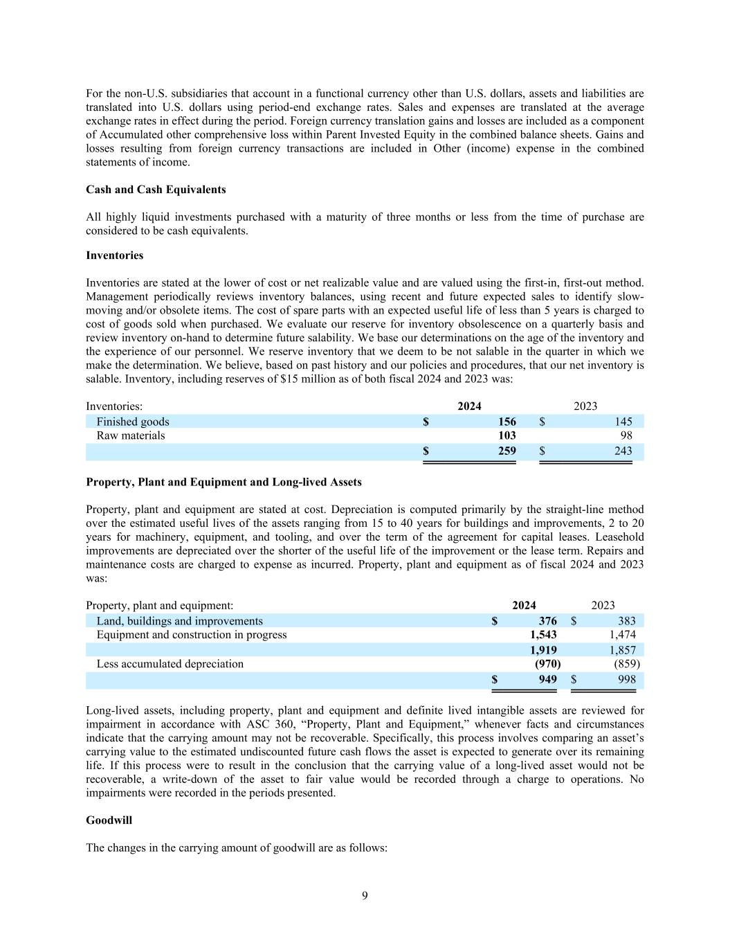 9 For the non-U.S. subsidiaries that account in a functional currency other than U.S. dollars, assets and liabilities are translated into U.S. dollars using period-end exchange rates. Sales and expenses are translated at the average exchange rates in effect during the period. Foreign currency translation gains and losses are included as a component of Accumulated other comprehensive loss within Parent Invested Equity in the combined balance sheets. Gains and losses resulting from foreign currency transactions are included in Other (income) expense in the combined statements of income. Cash and Cash Equivalents All highly liquid investments purchased with a maturity of three months or less from the time of purchase are considered to be cash equivalents. Inventories Inventories are stated at the lower of cost or net realizable value and are valued using the first-in, first-out method. Management periodically reviews inventory balances, using recent and future expected sales to identify slow- moving and/or obsolete items. The cost of spare parts with an expected useful life of less than 5 years is charged to cost of goods sold when purchased. We evaluate our reserve for inventory obsolescence on a quarterly basis and review inventory on-hand to determine future salability. We base our determinations on the age of the inventory and the experience of our personnel. We reserve inventory that we deem to be not salable in the quarter in which we make the determination. We believe, based on past history and our policies and procedures, that our net inventory is salable. Inventory, including reserves of $15 million as of both fiscal 2024 and 2023 was: Inventories: 2024 2023 Finished goods $ 156 $ 145 Raw materials 103 98 $ 259 $ 243 Property, Plant and Equipment and Long-lived Assets Property, plant and equipment are stated at cost. Depreciation is computed primarily by the straight-line method over the estimated useful lives of the assets ranging from 15 to 40 years for buildings and improvements, 2 to 20 years for machinery, equipment, and tooling, and over the term of the agreement for capital leases. Leasehold improvements are depreciated over the shorter of the useful life of the improvement or the lease term. Repairs and maintenance costs are charged to expense as incurred. Property, plant and equipment as of fiscal 2024 and 2023 was: Property, plant and equipment: 2024 2023 Land, buildings and improvements $ 376 $ 383 Equipment and construction in progress 1,543 1,474 1,919 1,857 Less accumulated depreciation (970 ) (859 ) $ 949 $ 998 Long-lived assets, including property, plant and equipment and definite lived intangible assets are reviewed for impairment in accordance with ASC 360, “Property, Plant and Equipment,” whenever facts and circumstances indicate that the carrying amount may not be recoverable. Specifically, this process involves comparing an asset’s carrying value to the estimated undiscounted future cash flows the asset is expected to generate over its remaining life. If this process were to result in the conclusion that the carrying value of a long-lived asset would not be recoverable, a write-down of the asset to fair value would be recorded through a charge to operations. No impairments were recorded in the periods presented. Goodwill The changes in the carrying amount of goodwill are as follows: