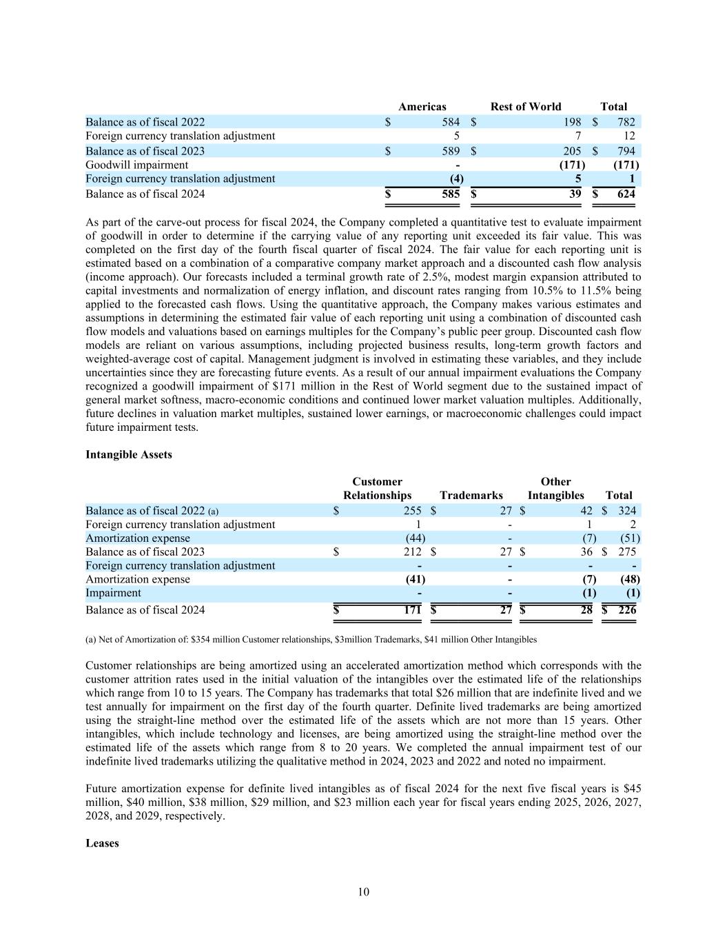 10 Americas Rest of World Total Balance as of fiscal 2022 $ 584 $ 198 $ 782 Foreign currency translation adjustment 5 7 12 Balance as of fiscal 2023 $ 589 $ 205 $ 794 Goodwill impairment - (171 ) (171 ) Foreign currency translation adjustment (4 ) 5 1 Balance as of fiscal 2024 $ 585 $ 39 $ 624 As part of the carve-out process for fiscal 2024, the Company completed a quantitative test to evaluate impairment of goodwill in order to determine if the carrying value of any reporting unit exceeded its fair value. This was completed on the first day of the fourth fiscal quarter of fiscal 2024. The fair value for each reporting unit is estimated based on a combination of a comparative company market approach and a discounted cash flow analysis (income approach). Our forecasts included a terminal growth rate of 2.5%, modest margin expansion attributed to capital investments and normalization of energy inflation, and discount rates ranging from 10.5% to 11.5% being applied to the forecasted cash flows. Using the quantitative approach, the Company makes various estimates and assumptions in determining the estimated fair value of each reporting unit using a combination of discounted cash flow models and valuations based on earnings multiples for the Company’s public peer group. Discounted cash flow models are reliant on various assumptions, including projected business results, long-term growth factors and weighted-average cost of capital. Management judgment is involved in estimating these variables, and they include uncertainties since they are forecasting future events. As a result of our annual impairment evaluations the Company recognized a goodwill impairment of $171 million in the Rest of World segment due to the sustained impact of general market softness, macro-economic conditions and continued lower market valuation multiples. Additionally, future declines in valuation market multiples, sustained lower earnings, or macroeconomic challenges could impact future impairment tests. Intangible Assets Customer Relationships Trademarks Other Intangibles Total Balance as of fiscal 2022 (a) $ 255 $ 27 $ 42 $ 324 Foreign currency translation adjustment 1 - 1 2 Amortization expense (44 ) - (7 ) (51 ) Balance as of fiscal 2023 $ 212 $ 27 $ 36 $ 275 Foreign currency translation adjustment - - - - Amortization expense (41 ) - (7 ) (48 ) Impairment - - (1 ) (1 ) Balance as of fiscal 2024 $ 171 $ 27 $ 28 $ 226 (a) Net of Amortization of: $354 million Customer relationships, $3million Trademarks, $41 million Other Intangibles Customer relationships are being amortized using an accelerated amortization method which corresponds with the customer attrition rates used in the initial valuation of the intangibles over the estimated life of the relationships which range from 10 to 15 years. The Company has trademarks that total $26 million that are indefinite lived and we test annually for impairment on the first day of the fourth quarter. Definite lived trademarks are being amortized using the straight-line method over the estimated life of the assets which are not more than 15 years. Other intangibles, which include technology and licenses, are being amortized using the straight-line method over the estimated life of the assets which range from 8 to 20 years. We completed the annual impairment test of our indefinite lived trademarks utilizing the qualitative method in 2024, 2023 and 2022 and noted no impairment. Future amortization expense for definite lived intangibles as of fiscal 2024 for the next five fiscal years is $45 million, $40 million, $38 million, $29 million, and $23 million each year for fiscal years ending 2025, 2026, 2027, 2028, and 2029, respectively. Leases