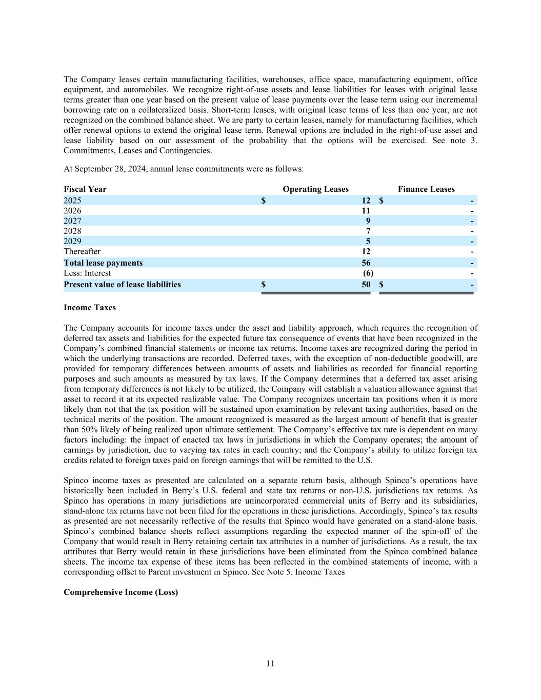 11 The Company leases certain manufacturing facilities, warehouses, office space, manufacturing equipment, office equipment, and automobiles. We recognize right-of-use assets and lease liabilities for leases with original lease terms greater than one year based on the present value of lease payments over the lease term using our incremental borrowing rate on a collateralized basis. Short-term leases, with original lease terms of less than one year, are not recognized on the combined balance sheet. We are party to certain leases, namely for manufacturing facilities, which offer renewal options to extend the original lease term. Renewal options are included in the right-of-use asset and lease liability based on our assessment of the probability that the options will be exercised. See note 3. Commitments, Leases and Contingencies. At September 28, 2024, annual lease commitments were as follows: Fiscal Year Operating Leases Finance Leases 2025 $ 12 $ - 2026 11 - 2027 9 - 2028 7 - 2029 5 - Thereafter 12 - Total lease payments 56 - Less: Interest (6 ) - Present value of lease liabilities $ 50 $ - Income Taxes The Company accounts for income taxes under the asset and liability approach, which requires the recognition of deferred tax assets and liabilities for the expected future tax consequence of events that have been recognized in the Company’s combined financial statements or income tax returns. Income taxes are recognized during the period in which the underlying transactions are recorded. Deferred taxes, with the exception of non-deductible goodwill, are provided for temporary differences between amounts of assets and liabilities as recorded for financial reporting purposes and such amounts as measured by tax laws. If the Company determines that a deferred tax asset arising from temporary differences is not likely to be utilized, the Company will establish a valuation allowance against that asset to record it at its expected realizable value. The Company recognizes uncertain tax positions when it is more likely than not that the tax position will be sustained upon examination by relevant taxing authorities, based on the technical merits of the position. The amount recognized is measured as the largest amount of benefit that is greater than 50% likely of being realized upon ultimate settlement. The Company’s effective tax rate is dependent on many factors including: the impact of enacted tax laws in jurisdictions in which the Company operates; the amount of earnings by jurisdiction, due to varying tax rates in each country; and the Company’s ability to utilize foreign tax credits related to foreign taxes paid on foreign earnings that will be remitted to the U.S. Spinco income taxes as presented are calculated on a separate return basis, although Spinco’s operations have historically been included in Berry’s U.S. federal and state tax returns or non-U.S. jurisdictions tax returns. As Spinco has operations in many jurisdictions are unincorporated commercial units of Berry and its subsidiaries, stand-alone tax returns have not been filed for the operations in these jurisdictions. Accordingly, Spinco’s tax results as presented are not necessarily reflective of the results that Spinco would have generated on a stand-alone basis. Spinco’s combined balance sheets reflect assumptions regarding the expected manner of the spin-off of the Company that would result in Berry retaining certain tax attributes in a number of jurisdictions. As a result, the tax attributes that Berry would retain in these jurisdictions have been eliminated from the Spinco combined balance sheets. The income tax expense of these items has been reflected in the combined statements of income, with a corresponding offset to Parent investment in Spinco. See Note 5. Income Taxes Comprehensive Income (Loss)