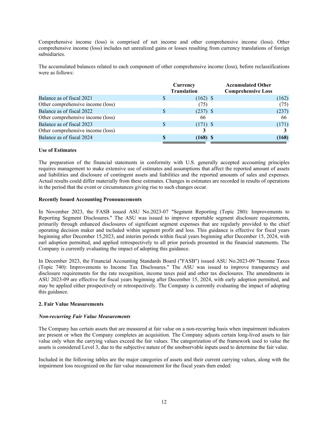 12 Comprehensive income (loss) is comprised of net income and other comprehensive income (loss). Other comprehensive income (loss) includes net unrealized gains or losses resulting from currency translations of foreign subsidiaries. The accumulated balances related to each component of other comprehensive income (loss), before reclassifications were as follows: Currency Translation Accumulated Other Comprehensive Loss Balance as of fiscal 2021 $ (162 ) $ (162 ) Other comprehensive income (loss) (75 ) (75 ) Balance as of fiscal 2022 $ (237 ) $ (237 ) Other comprehensive income (loss) 66 66 Balance as of fiscal 2023 $ (171 ) $ (171 ) Other comprehensive income (loss) 3 3 Balance as of fiscal 2024 $ (168 ) $ (168 ) Use of Estimates The preparation of the financial statements in conformity with U.S. generally accepted accounting principles requires management to make extensive use of estimates and assumptions that affect the reported amount of assets and liabilities and disclosure of contingent assets and liabilities and the reported amounts of sales and expenses. Actual results could differ materially from these estimates. Changes in estimates are recorded in results of operations in the period that the event or circumstances giving rise to such changes occur. Recently Issued Accounting Pronouncements In November 2023, the FASB issued ASU No.2023-07 "Segment Reporting (Topic 280): Improvements to Reporting Segment Disclosures." The ASU was issued to improve reportable segment disclosure requirements, primarily through enhanced disclosures of significant segment expenses that are regularly provided to the chief operating decision maker and included within segment profit and loss. This guidance is effective for fiscal years beginning after December 15,2023, and interim periods within fiscal years beginning after December 15, 2024, with earl adoption permitted, and applied retrospectively to all prior periods presented in the financial statements. The Company is currently evaluating the impact of adopting this guidance. In December 2023, the Financial Accounting Standards Board ("FASB") issued ASU No.2023-09 "Income Taxes (Topic 740): Improvements to Income Tax Disclosures." The ASU was issued to improve transparency and disclosure requirements for the rate recognition, income taxes paid and other tax disclosures. The amendments in ASU 2023-09 are effective for fiscal years beginning after December 15, 2024, with early adoption permitted, and may be applied either prospectively or retrospectively. The Company is currently evaluating the impact of adopting this guidance. 2. Fair Value Measurements Non-recurring Fair Value Measurements The Company has certain assets that are measured at fair value on a non-recurring basis when impairment indicators are present or when the Company completes an acquisition. The Company adjusts certain long-lived assets to fair value only when the carrying values exceed the fair values. The categorization of the framework used to value the assets is considered Level 3, due to the subjective nature of the unobservable inputs used to determine the fair value. Included in the following tables are the major categories of assets and their current carrying values, along with the impairment loss recognized on the fair value measurement for the fiscal years then ended:
