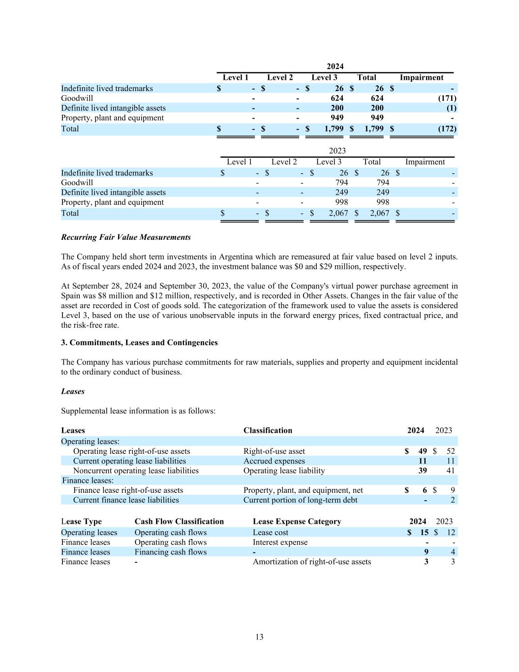 13 2024 Level 1 Level 2 Level 3 Total Impairment Indefinite lived trademarks $ - $ - $ 26 $ 26 $ - Goodwill - - 624 624 (171 ) Definite lived intangible assets - - 200 200 (1 ) Property, plant and equipment - - 949 949 - Total $ - $ - $ 1,799 $ 1,799 $ (172 ) 2023 Level 1 Level 2 Level 3 Total Impairment Indefinite lived trademarks $ - $ - $ 26 $ 26 $ - Goodwill - - 794 794 - Definite lived intangible assets - - 249 249 - Property, plant and equipment - - 998 998 - Total $ - $ - $ 2,067 $ 2,067 $ - Recurring Fair Value Measurements The Company held short term investments in Argentina which are remeasured at fair value based on level 2 inputs. As of fiscal years ended 2024 and 2023, the investment balance was $0 and $29 million, respectively. At September 28, 2024 and September 30, 2023, the value of the Company's virtual power purchase agreement in Spain was $8 million and $12 million, respectively, and is recorded in Other Assets. Changes in the fair value of the asset are recorded in Cost of goods sold. The categorization of the framework used to value the assets is considered Level 3, based on the use of various unobservable inputs in the forward energy prices, fixed contractual price, and the risk-free rate. 3. Commitments, Leases and Contingencies The Company has various purchase commitments for raw materials, supplies and property and equipment incidental to the ordinary conduct of business. Leases Supplemental lease information is as follows: Leases Classification 2024 2023 Operating leases: Operating lease right-of-use assets Right-of-use asset $ 49 $ 52 Current operating lease liabilities Accrued expenses 11 11 Noncurrent operating lease liabilities Operating lease liability 39 41 Finance leases: Finance lease right-of-use assets Property, plant, and equipment, net $ 6 $ 9 Current finance lease liabilities Current portion of long-term debt - 2 Lease Type Cash Flow Classification Lease Expense Category 2024 2023 Operating leases Operating cash flows Lease cost $ 15 $ 12 Finance leases Operating cash flows Interest expense - - Finance leases Financing cash flows - 9 4 Finance leases - Amortization of right-of-use assets 3 3