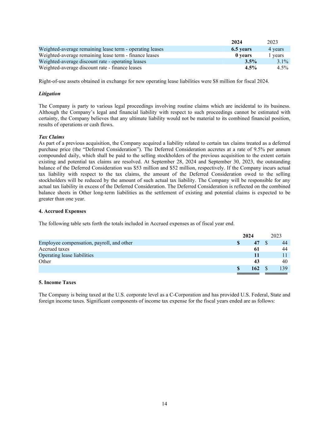 14 2024 2023 Weighted-average remaining lease term - operating leases 6.5 years 4 years Weighted-average remaining lease term - finance leases 0 years 1 years Weighted-average discount rate - operating leases 3.5 % 3.1 % Weighted-average discount rate - finance leases 4.5 % 4.5 % Right-of-use assets obtained in exchange for new operating lease liabilities were $8 million for fiscal 2024. Litigation The Company is party to various legal proceedings involving routine claims which are incidental to its business. Although the Company’s legal and financial liability with respect to such proceedings cannot be estimated with certainty, the Company believes that any ultimate liability would not be material to its combined financial position, results of operations or cash flows. Tax Claims As part of a previous acquisition, the Company acquired a liability related to certain tax claims treated as a deferred purchase price (the “Deferred Consideration”). The Deferred Consideration accretes at a rate of 9.5% per annum compounded daily, which shall be paid to the selling stockholders of the previous acquisition to the extent certain existing and potential tax claims are resolved. At September 28, 2024 and September 30, 2023, the outstanding balance of the Deferred Consideration was $53 million and $52 million, respectively. If the Company incurs actual tax liability with respect to the tax claims, the amount of the Deferred Consideration owed to the selling stockholders will be reduced by the amount of such actual tax liability. The Company will be responsible for any actual tax liability in excess of the Deferred Consideration. The Deferred Consideration is reflected on the combined balance sheets in Other long-term liabilities as the settlement of existing and potential claims is expected to be greater than one year. 4. Accrued Expenses The following table sets forth the totals included in Accrued expenses as of fiscal year end. 2024 2023 Employee compensation, payroll, and other $ 47 $ 44 Accrued taxes 61 44 Operating lease liabilities 11 11 Other 43 40 $ 162 $ 139 5. Income Taxes The Company is being taxed at the U.S. corporate level as a C-Corporation and has provided U.S. Federal, State and foreign income taxes. Significant components of income tax expense for the fiscal years ended are as follows: