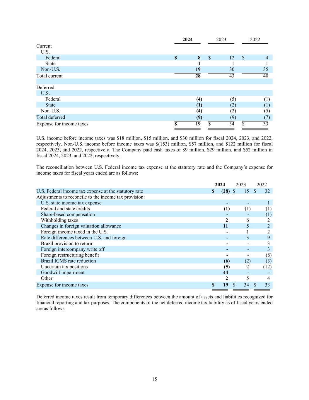 15 2024 2023 2022 Current U.S. Federal $ 8 $ 12 $ 4 State 1 1 1 Non-U.S. 19 30 35 Total current 28 43 40 Deferred: U.S. Federal (4 ) (5 ) (1 ) State (1 ) (2 ) (1 ) Non-U.S. (4 ) (2 ) (5 ) Total deferred (9 ) (9 ) (7 ) Expense for income taxes $ 19 $ 34 $ 33 U.S. income before income taxes was $18 million, $15 million, and $30 million for fiscal 2024, 2023, and 2022, respectively. Non-U.S. income before income taxes was $(153) million, $57 million, and $122 million for fiscal 2024, 2023, and 2022, respectively. The Company paid cash taxes of $9 million, $29 million, and $52 million in fiscal 2024, 2023, and 2022, respectively. The reconciliation between U.S. Federal income tax expense at the statutory rate and the Company’s expense for income taxes for fiscal years ended are as follows: 2024 2023 2022 U.S. Federal income tax expense at the statutory rate $ (28 ) $ 15 $ 32 Adjustments to reconcile to the income tax provision: U.S. state income tax expense - - 1 Federal and state credits (1 ) (1 ) (1 ) Share-based compensation - - (1 ) Withholding taxes 2 6 2 Changes in foreign valuation allowance 11 5 2 Foreign income taxed in the U.S. - 1 2 Rate differences between U.S. and foreign - 3 9 Brazil provision to return - - 3 Foreign intercompany write off - - 3 Foreign restructuring benefit - - (8 ) Brazil ICMS rate reduction (6 ) (2 ) (3 ) Uncertain tax positions (5 ) 2 (12 ) Goodwill impairment 44 - - Other 2 5 4 Expense for income taxes $ 19 $ 34 $ 33 Deferred income taxes result from temporary differences between the amount of assets and liabilities recognized for financial reporting and tax purposes. The components of the net deferred income tax liability as of fiscal years ended are as follows: