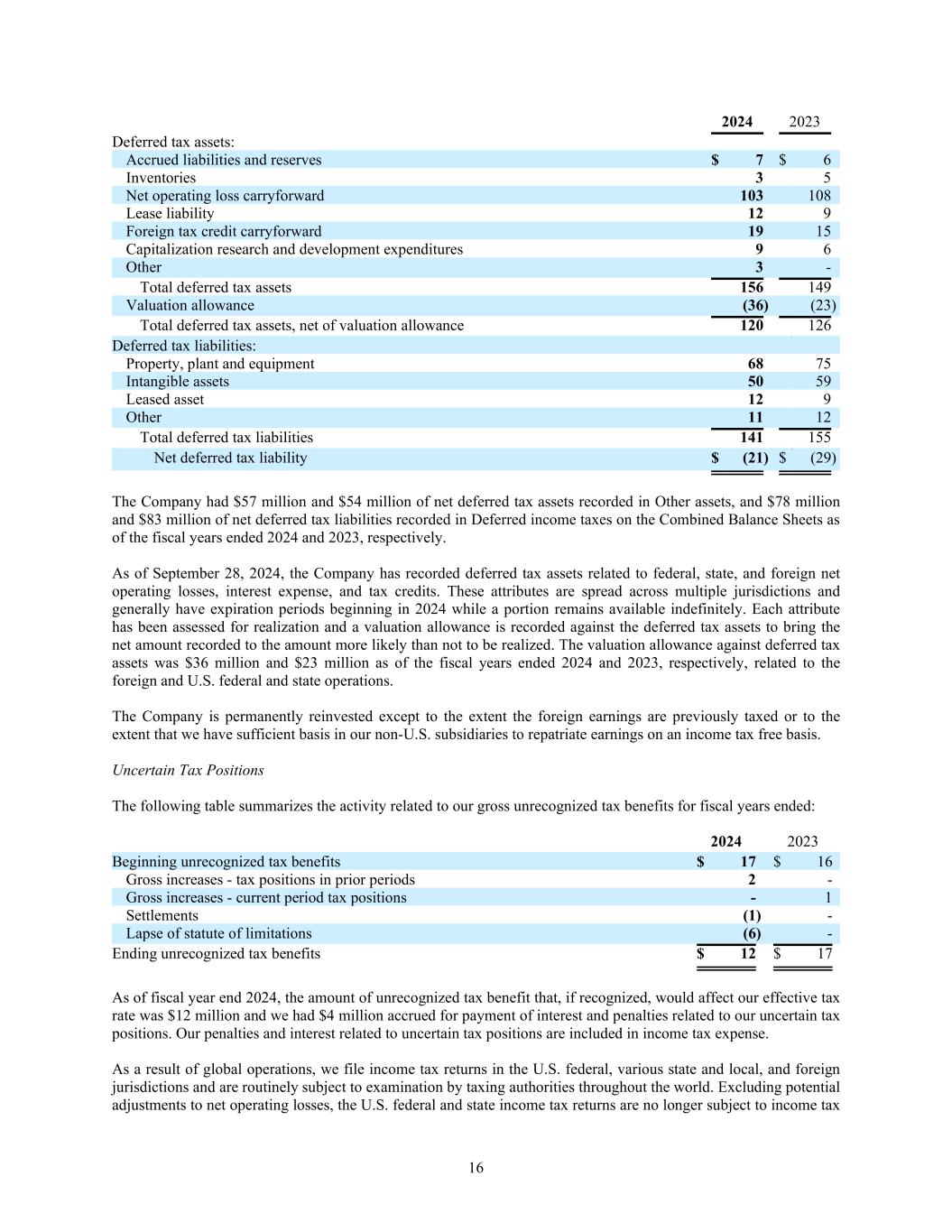 16 2024 2023 Deferred tax assets: Accrued liabilities and reserves $ 7 $ 6 Inventories 3 5 Net operating loss carryforward 103 108 Lease liability 12 9 Foreign tax credit carryforward 19 15 Capitalization research and development expenditures 9 6 Other 3 - Total deferred tax assets 156 149 Valuation allowance (36 ) (23 ) Total deferred tax assets, net of valuation allowance 120 126 Deferred tax liabilities: Property, plant and equipment 68 75 Intangible assets 50 59 Leased asset 12 9 Other 11 12 Total deferred tax liabilities 141 155 Net deferred tax liability $ (21 ) $ (29 ) The Company had $57 million and $54 million of net deferred tax assets recorded in Other assets, and $78 million and $83 million of net deferred tax liabilities recorded in Deferred income taxes on the Combined Balance Sheets as of the fiscal years ended 2024 and 2023, respectively. As of September 28, 2024, the Company has recorded deferred tax assets related to federal, state, and foreign net operating losses, interest expense, and tax credits. These attributes are spread across multiple jurisdictions and generally have expiration periods beginning in 2024 while a portion remains available indefinitely. Each attribute has been assessed for realization and a valuation allowance is recorded against the deferred tax assets to bring the net amount recorded to the amount more likely than not to be realized. The valuation allowance against deferred tax assets was $36 million and $23 million as of the fiscal years ended 2024 and 2023, respectively, related to the foreign and U.S. federal and state operations. The Company is permanently reinvested except to the extent the foreign earnings are previously taxed or to the extent that we have sufficient basis in our non-U.S. subsidiaries to repatriate earnings on an income tax free basis. Uncertain Tax Positions The following table summarizes the activity related to our gross unrecognized tax benefits for fiscal years ended: 2024 2023 Beginning unrecognized tax benefits $ 17 $ 16 Gross increases - tax positions in prior periods 2 - Gross increases - current period tax positions - 1 Settlements (1 ) - Lapse of statute of limitations (6 ) - Ending unrecognized tax benefits $ 12 $ 17 As of fiscal year end 2024, the amount of unrecognized tax benefit that, if recognized, would affect our effective tax rate was $12 million and we had $4 million accrued for payment of interest and penalties related to our uncertain tax positions. Our penalties and interest related to uncertain tax positions are included in income tax expense. As a result of global operations, we file income tax returns in the U.S. federal, various state and local, and foreign jurisdictions and are routinely subject to examination by taxing authorities throughout the world. Excluding potential adjustments to net operating losses, the U.S. federal and state income tax returns are no longer subject to income tax