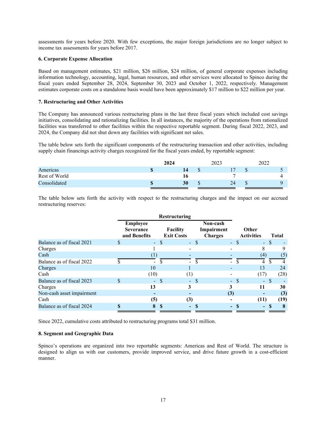17 assessments for years before 2020. With few exceptions, the major foreign jurisdictions are no longer subject to income tax assessments for years before 2017. 6. Corporate Expense Allocation Based on management estimates, $21 million, $26 million, $24 million, of general corporate expenses including information technology, accounting, legal, human resources, and other services were allocated to Spinco during the fiscal years ended September 28, 2024, September 30, 2023 and October 1, 2022, respectively. Management estimates corporate costs on a standalone basis would have been approximately $17 million to $22 million per year. 7. Restructuring and Other Activities The Company has announced various restructuring plans in the last three fiscal years which included cost savings initiatives, consolidating and rationalizing facilities. In all instances, the majority of the operations from rationalized facilities was transferred to other facilities within the respective reportable segment. During fiscal 2022, 2023, and 2024, the Company did not shut down any facilities with significant net sales. The table below sets forth the significant components of the restructuring transaction and other activities, including supply chain financings activity charges recognized for the fiscal years ended, by reportable segment: 2024 2023 2022 Americas $ 14 $ 17 $ 5 Rest of World 16 7 4 Consolidated $ 30 $ 24 $ 9 The table below sets forth the activity with respect to the restructuring charges and the impact on our accrued restructuring reserves: Restructuring Employee Severance and Benefits Facility Exit Costs Non-cash Impairment Charges Other Activities Total Balance as of fiscal 2021 $ - $ - $ - $ - $ - Charges 1 - - 8 9 Cash (1 ) - - (4 ) (5 ) Balance as of fiscal 2022 $ - $ - $ - $ 4 $ 4 Charges 10 1 - 13 24 Cash (10 ) (1 ) - (17 ) (28 ) Balance as of fiscal 2023 $ - $ - $ - $ - $ - Charges 13 3 3 11 30 Non-cash asset impairment - - (3 ) - (3 ) Cash (5 ) (3 ) - (11 ) (19 ) Balance as of fiscal 2024 $ 8 $ - $ - $ - $ 8 Since 2022, cumulative costs attributed to restructuring programs total $31 million. 8. Segment and Geographic Data Spinco’s operations are organized into two reportable segments: Americas and Rest of World. The structure is designed to align us with our customers, provide improved service, and drive future growth in a cost-efficient manner.