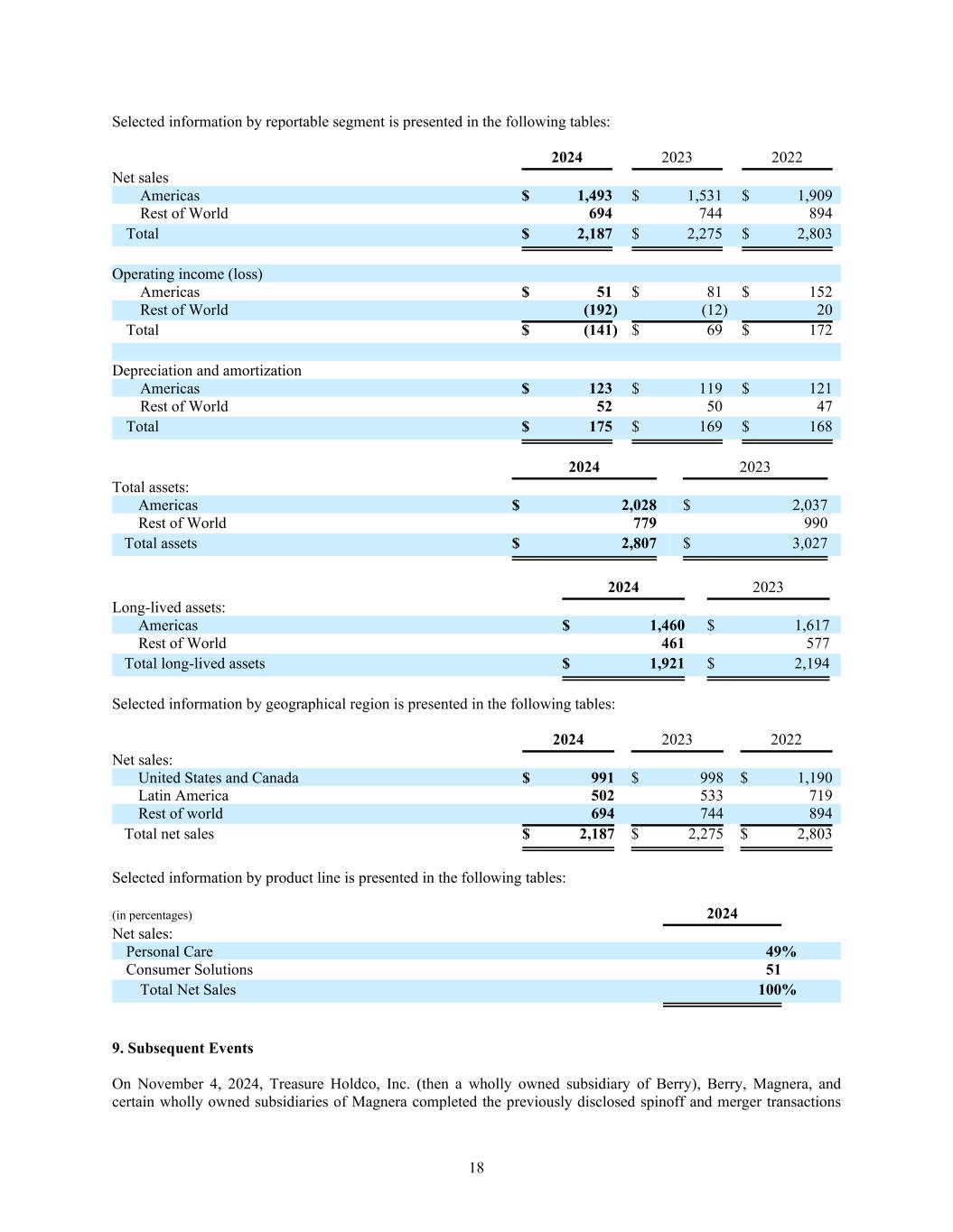 18 Selected information by reportable segment is presented in the following tables: 2024 2023 2022 Net sales Americas $ 1,493 $ 1,531 $ 1,909 Rest of World 694 744 894 Total $ 2,187 $ 2,275 $ 2,803 Operating income (loss) Americas $ 51 $ 81 $ 152 Rest of World (192 ) (12 ) 20 Total $ (141 ) $ 69 $ 172 Depreciation and amortization Americas $ 123 $ 119 $ 121 Rest of World 52 50 47 Total $ 175 $ 169 $ 168 2024 2023 Total assets: Americas $ 2,028 $ 2,037 Rest of World 779 990 Total assets $ 2,807 $ 3,027 2024 2023 Long-lived assets: Americas $ 1,460 $ 1,617 Rest of World 461 577 Total long-lived assets $ 1,921 $ 2,194 Selected information by geographical region is presented in the following tables: 2024 2023 2022 Net sales: United States and Canada $ 991 $ 998 $ 1,190 Latin America 502 533 719 Rest of world 694 744 894 Total net sales $ 2,187 $ 2,275 $ 2,803 Selected information by product line is presented in the following tables: (in percentages) 2024 Net sales: Personal Care 49 % Consumer Solutions 51 Total Net Sales 100 % 9. Subsequent Events On November 4, 2024, Treasure Holdco, Inc. (then a wholly owned subsidiary of Berry), Berry, Magnera, and certain wholly owned subsidiaries of Magnera completed the previously disclosed spinoff and merger transactions