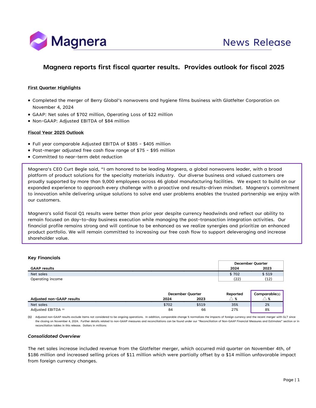 Page | 1 Magnera reports first fiscal quarter results. Provides outlook for fiscal 2025 First Quarter Highlights  Completed the merger of Berry Global’s nonwovens and hygiene films business with Glatfelter Corporation on November 4, 2024  GAAP: Net sales of $702 million, Operating Loss of $22 million  Non-GAAP: Adjusted EBITDA of $84 million Fiscal Year 2025 Outlook  Full year comparable Adjusted EBITDA of $385 - $405 million  Post-merger adjusted free cash flow range of $75 - $95 million  Committed to near-term debt reduction Magnera’s CEO Curt Begle said, “I am honored to be leading Magnera, a global nonwovens leader, with a broad platform of product solutions for the specialty materials industry. Our diverse business and valued customers are proudly supported by more than 9,000 employees across 46 global manufacturing facilities. We expect to build on our expanded experience to approach every challenge with a proactive and results-driven mindset. Magnera's commitment to innovation while delivering unique solutions to solve end user problems enables the trusted partnership we enjoy with our customers. Magnera's solid fiscal Q1 results were better than prior year despite currency headwinds and reflect our ability to remain focused on day-to-day business execution while managing the post-transaction integration activities. Our financial profile remains strong and will continue to be enhanced as we realize synergies and prioritize an enhanced product portfolio. We will remain committed to increasing our free cash flow to support deleveraging and increase shareholder value. Key Financials December Quarter GAAP results 2024 2023 Net sales $ 702 $ 519 Operating income (22) (12) December Quarter Reported Comparable(1) Adjusted non-GAAP results 2024 2023 % % Net sales $702 $519 35% 2% Adjusted EBITDA (1) 84 66 27% 8% (1) Adjusted non-GAAP results exclude items not considered to be ongoing operations. In addition, comparable change % normalizes the impacts of foreign currency and the recent merger with GLT since the closing on November 4, 2024. Further details related to non-GAAP measures and reconciliations can be found under our “Reconciliation of Non-GAAP Financial Measures and Estimates” section or in reconciliation tables in this release. Dollars in millions Consolidated Overview The net sales increase included revenue from the Glatfelter merger, which occurred mid quarter on November 4th, of $186 million and increased selling prices of $11 million which were partially offset by a $14 million unfavorable impact from foreign currency changes. News Release