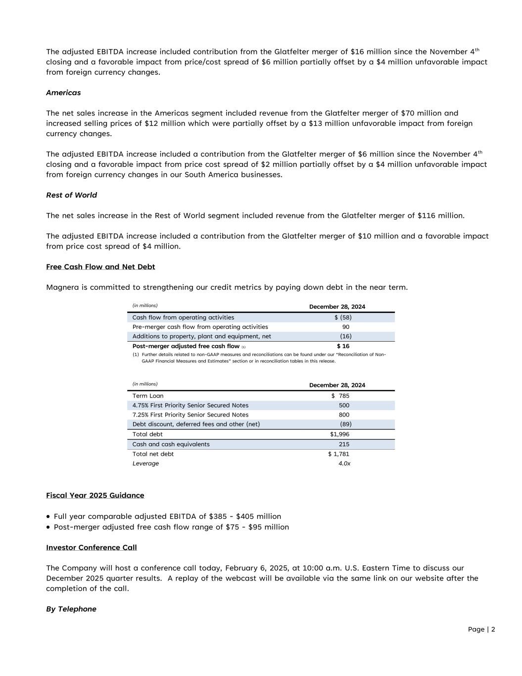 Page | 2 The adjusted EBITDA increase included contribution from the Glatfelter merger of $16 million since the November 4th closing and a favorable impact from price/cost spread of $6 million partially offset by a $4 million unfavorable impact from foreign currency changes. Americas The net sales increase in the Americas segment included revenue from the Glatfelter merger of $70 million and increased selling prices of $12 million which were partially offset by a $13 million unfavorable impact from foreign currency changes. The adjusted EBITDA increase included a contribution from the Glatfelter merger of $6 million since the November 4th closing and a favorable impact from price cost spread of $2 million partially offset by a $4 million unfavorable impact from foreign currency changes in our South America businesses. Rest of World The net sales increase in the Rest of World segment included revenue from the Glatfelter merger of $116 million. The adjusted EBITDA increase included a contribution from the Glatfelter merger of $10 million and a favorable impact from price cost spread of $4 million. Free Cash Flow and Net Debt Magnera is committed to strengthening our credit metrics by paying down debt in the near term. (in millions) December 28, 2024 Cash flow from operating activities $ (58) Pre-merger cash flow from operating activities 90 Additions to property, plant and equipment, net (16) Post-merger adjusted free cash flow (1) $ 16 (1) Further details related to non-GAAP measures and reconciliations can be found under our “Reconciliation of Non- GAAP Financial Measures and Estimates” section or in reconciliation tables in this release. (in millions) December 28, 2024 Term Loan $ 785 4.75% First Priority Senior Secured Notes 500 7.25% First Priority Senior Secured Notes 800 Debt discount, deferred fees and other (net) (89) Total debt $1,996 Cash and cash equivalents 215 Total net debt $ 1,781 Leverage 4.0x Fiscal Year 2025 Guidance  Full year comparable adjusted EBITDA of $385 - $405 million  Post-merger adjusted free cash flow range of $75 - $95 million Investor Conference Call The Company will host a conference call today, February 6, 2025, at 10:00 a.m. U.S. Eastern Time to discuss our December 2025 quarter results. A replay of the webcast will be available via the same link on our website after the completion of the call. By Telephone