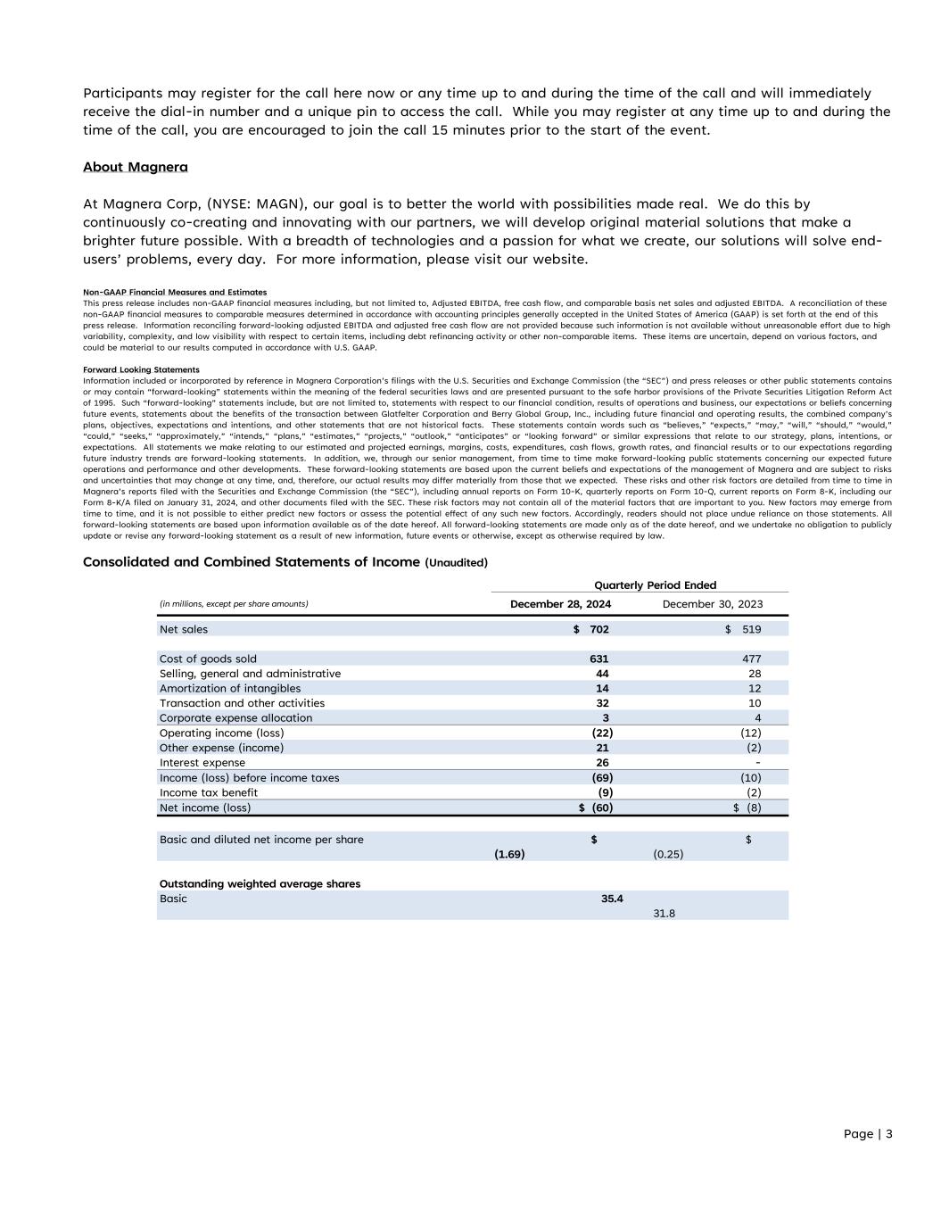Page | 3 Participants may register for the call here now or any time up to and during the time of the call and will immediately receive the dial-in number and a unique pin to access the call. While you may register at any time up to and during the time of the call, you are encouraged to join the call 15 minutes prior to the start of the event. About Magnera At Magnera Corp, (NYSE: MAGN), our goal is to better the world with possibilities made real. We do this by continuously co-creating and innovating with our partners, we will develop original material solutions that make a brighter future possible. With a breadth of technologies and a passion for what we create, our solutions will solve end- users’ problems, every day. For more information, please visit our website. Non-GAAP Financial Measures and Estimates This press release includes non-GAAP financial measures including, but not limited to, Adjusted EBITDA, free cash flow, and comparable basis net sales and adjusted EBITDA. A reconciliation of these non-GAAP financial measures to comparable measures determined in accordance with accounting principles generally accepted in the United States of America (GAAP) is set forth at the end of this press release. Information reconciling forward-looking adjusted EBITDA and adjusted free cash flow are not provided because such information is not available without unreasonable effort due to high variability, complexity, and low visibility with respect to certain items, including debt refinancing activity or other non-comparable items. These items are uncertain, depend on various factors, and could be material to our results computed in accordance with U.S. GAAP. Forward Looking Statements Information included or incorporated by reference in Magnera Corporation’s filings with the U.S. Securities and Exchange Commission (the “SEC”) and press releases or other public statements contains or may contain “forward-looking” statements within the meaning of the federal securities laws and are presented pursuant to the safe harbor provisions of the Private Securities Litigation Reform Act of 1995. Such “forward-looking” statements include, but are not limited to, statements with respect to our financial condition, results of operations and business, our expectations or beliefs concerning future events, statements about the benefits of the transaction between Glatfelter Corporation and Berry Global Group, Inc., including future financial and operating results, the combined company’s plans, objectives, expectations and intentions, and other statements that are not historical facts. These statements contain words such as “believes,” “expects,” “may,” “will,” “should,” “would,” “could,” “seeks,” “approximately,” “intends,” “plans,” “estimates,” “projects,” “outlook,” “anticipates” or “looking forward” or similar expressions that relate to our strategy, plans, intentions, or expectations. All statements we make relating to our estimated and projected earnings, margins, costs, expenditures, cash flows, growth rates, and financial results or to our expectations regarding future industry trends are forward-looking statements. In addition, we, through our senior management, from time to time make forward-looking public statements concerning our expected future operations and performance and other developments. These forward-looking statements are based upon the current beliefs and expectations of the management of Magnera and are subject to risks and uncertainties that may change at any time, and, therefore, our actual results may differ materially from those that we expected. These risks and other risk factors are detailed from time to time in Magnera’s reports filed with the Securities and Exchange Commission (the “SEC”), including annual reports on Form 10-K, quarterly reports on Form 10-Q, current reports on Form 8-K, including our Form 8-K/A filed on January 31, 2024, and other documents filed with the SEC. These risk factors may not contain all of the material factors that are important to you. New factors may emerge from time to time, and it is not possible to either predict new factors or assess the potential effect of any such new factors. Accordingly, readers should not place undue reliance on those statements. All forward-looking statements are based upon information available as of the date hereof. All forward-looking statements are made only as of the date hereof, and we undertake no obligation to publicly update or revise any forward-looking statement as a result of new information, future events or otherwise, except as otherwise required by law. Consolidated and Combined Statements of Income (Unaudited) Quarterly Period Ended (in millions, except per share amounts) December 28, 2024 December 30, 2023 Net sales $ 702 $ 519 Cost of goods sold 631 477 Selling, general and administrative 44 28 Amortization of intangibles 14 12 Transaction and other activities 32 10 Corporate expense allocation 3 4 Operating income (loss) (22) (12) Other expense (income) 21 (2) Interest expense 26 - Income (loss) before income taxes (69) (10) Income tax benefit (9) (2) Net income (loss) $ (60) $ (8) Basic and diluted net income per share $ (1.69) $ (0.25) Outstanding weighted average shares Basic 35.4 31.8