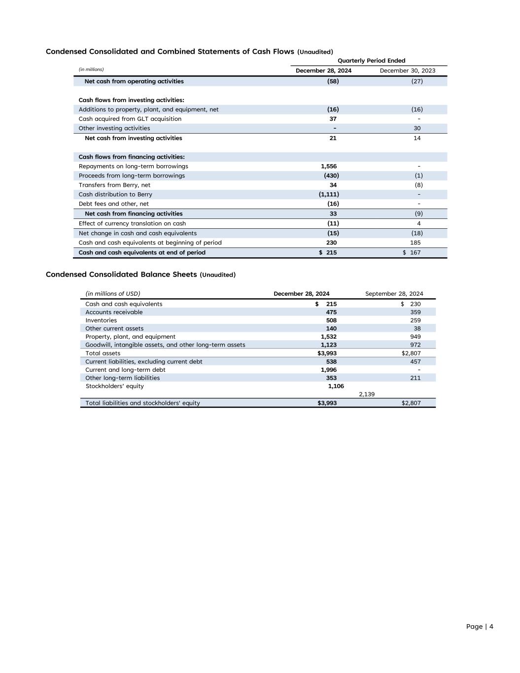 Page | 4 Condensed Consolidated and Combined Statements of Cash Flows (Unaudited) Quarterly Period Ended (in millions) December 28, 2024 December 30, 2023 Net cash from operating activities (58) (27) Cash flows from investing activities: Additions to property, plant, and equipment, net (16) (16) Cash acquired from GLT acquisition 37 - Other investing activities - 30 Net cash from investing activities 21 14 Cash flows from financing activities: Repayments on long-term borrowings 1,556 - Proceeds from long-term borrowings (430) (1) Transfers from Berry, net 34 (8) Cash distribution to Berry (1,111) - Debt fees and other, net (16) - Net cash from financing activities 33 (9) Effect of currency translation on cash (11) 4 Net change in cash and cash equivalents (15) (18) Cash and cash equivalents at beginning of period 230 185 Cash and cash equivalents at end of period $ 215 $ 167 Condensed Consolidated Balance Sheets (Unaudited) (in millions of USD) December 28, 2024 September 28, 2024 Cash and cash equivalents $ 215 $ 230 Accounts receivable 475 359 Inventories 508 259 Other current assets 140 38 Property, plant, and equipment 1,532 949 Goodwill, intangible assets, and other long-term assets 1,123 972 Total assets $3,993 $2,807 Current liabilities, excluding current debt 538 457 Current and long-term debt 1,996 - Other long-term liabilities 353 211 Stockholders’ equity 1,106 2,139 Total liabilities and stockholders' equity $3,993 $2,807