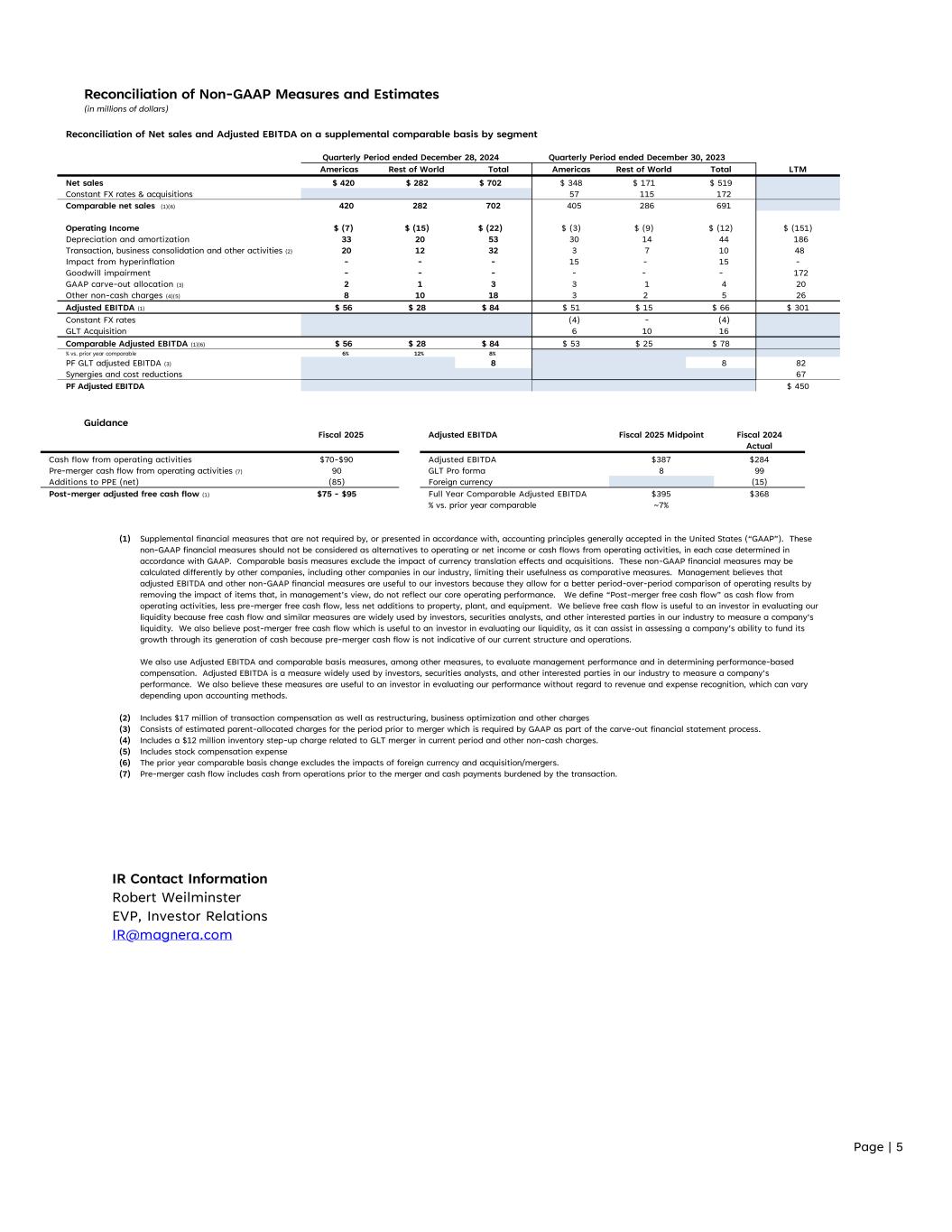 Page | 5 Reconciliation of Non-GAAP Measures and Estimates (in millions of dollars) Reconciliation of Net sales and Adjusted EBITDA on a supplemental comparable basis by segment Quarterly Period ended December 28, 2024 Quarterly Period ended December 30, 2023 Americas Rest of World Total Americas Rest of World Total LTM Net sales $ 420 $ 282 $ 702 $ 348 $ 171 $ 519 Constant FX rates & acquisitions 57 115 172 Comparable net sales (1)(6) 420 282 702 405 286 691 Operating Income $ (7) $ (15) $ (22) $ (3) $ (9) $ (12) $ (151) Depreciation and amortization 33 20 53 30 14 44 186 Transaction, business consolidation and other activities (2) 20 12 32 3 7 10 48 Impact from hyperinflation - - - 15 - 15 - Goodwill impairment - - - - - - 172 GAAP carve-out allocation (3) 2 1 3 3 1 4 20 Other non-cash charges (4)(5) 8 10 18 3 2 5 26 Adjusted EBITDA (1) $ 56 $ 28 $ 84 $ 51 $ 15 $ 66 $ 301 Constant FX rates (4) - (4) GLT Acquisition 6 10 16 Comparable Adjusted EBITDA (1)(6) $ 56 $ 28 $ 84 $ 53 $ 25 $ 78 % vs. prior year comparable 6% 12% 8% PF GLT adjusted EBITDA (3) 8 8 82 Synergies and cost reductions 67 PF Adjusted EBITDA $ 450 Guidance Fiscal 2025 Adjusted EBITDA Fiscal 2025 Midpoint Fiscal 2024 Actual Cash flow from operating activities $70-$90 Adjusted EBITDA $387 $284 Pre-merger cash flow from operating activities (7) 90 GLT Pro forma 8 99 Additions to PPE (net) (85) Foreign currency (15) Post-merger adjusted free cash flow (1) $75 - $95 Full Year Comparable Adjusted EBITDA $395 $368 % vs. prior year comparable ~7% (1) Supplemental financial measures that are not required by, or presented in accordance with, accounting principles generally accepted in the United States (“GAAP”). These non-GAAP financial measures should not be considered as alternatives to operating or net income or cash flows from operating activities, in each case determined in accordance with GAAP. Comparable basis measures exclude the impact of currency translation effects and acquisitions. These non-GAAP financial measures may be calculated differently by other companies, including other companies in our industry, limiting their usefulness as comparative measures. Management believes that adjusted EBITDA and other non-GAAP financial measures are useful to our investors because they allow for a better period-over-period comparison of operating results by removing the impact of items that, in management’s view, do not reflect our core operating performance. We define “Post-merger free cash flow” as cash flow from operating activities, less pre-merger free cash flow, less net additions to property, plant, and equipment. We believe free cash flow is useful to an investor in evaluating our liquidity because free cash flow and similar measures are widely used by investors, securities analysts, and other interested parties in our industry to measure a company’s liquidity. We also believe post-merger free cash flow which is useful to an investor in evaluating our liquidity, as it can assist in assessing a company’s ability to fund its growth through its generation of cash because pre-merger cash flow is not indicative of our current structure and operations. We also use Adjusted EBITDA and comparable basis measures, among other measures, to evaluate management performance and in determining performance-based compensation. Adjusted EBITDA is a measure widely used by investors, securities analysts, and other interested parties in our industry to measure a company’s performance. We also believe these measures are useful to an investor in evaluating our performance without regard to revenue and expense recognition, which can vary depending upon accounting methods. (2) Includes $17 million of transaction compensation as well as restructuring, business optimization and other charges (3) Consists of estimated parent-allocated charges for the period prior to merger which is required by GAAP as part of the carve-out financial statement process. (4) Includes a $12 million inventory step-up charge related to GLT merger in current period and other non-cash charges. (5) Includes stock compensation expense (6) The prior year comparable basis change excludes the impacts of foreign currency and acquisition/mergers. (7) Pre-merger cash flow includes cash from operations prior to the merger and cash payments burdened by the transaction. IR Contact Information Robert Weilminster EVP, Investor Relations IR@magnera.com