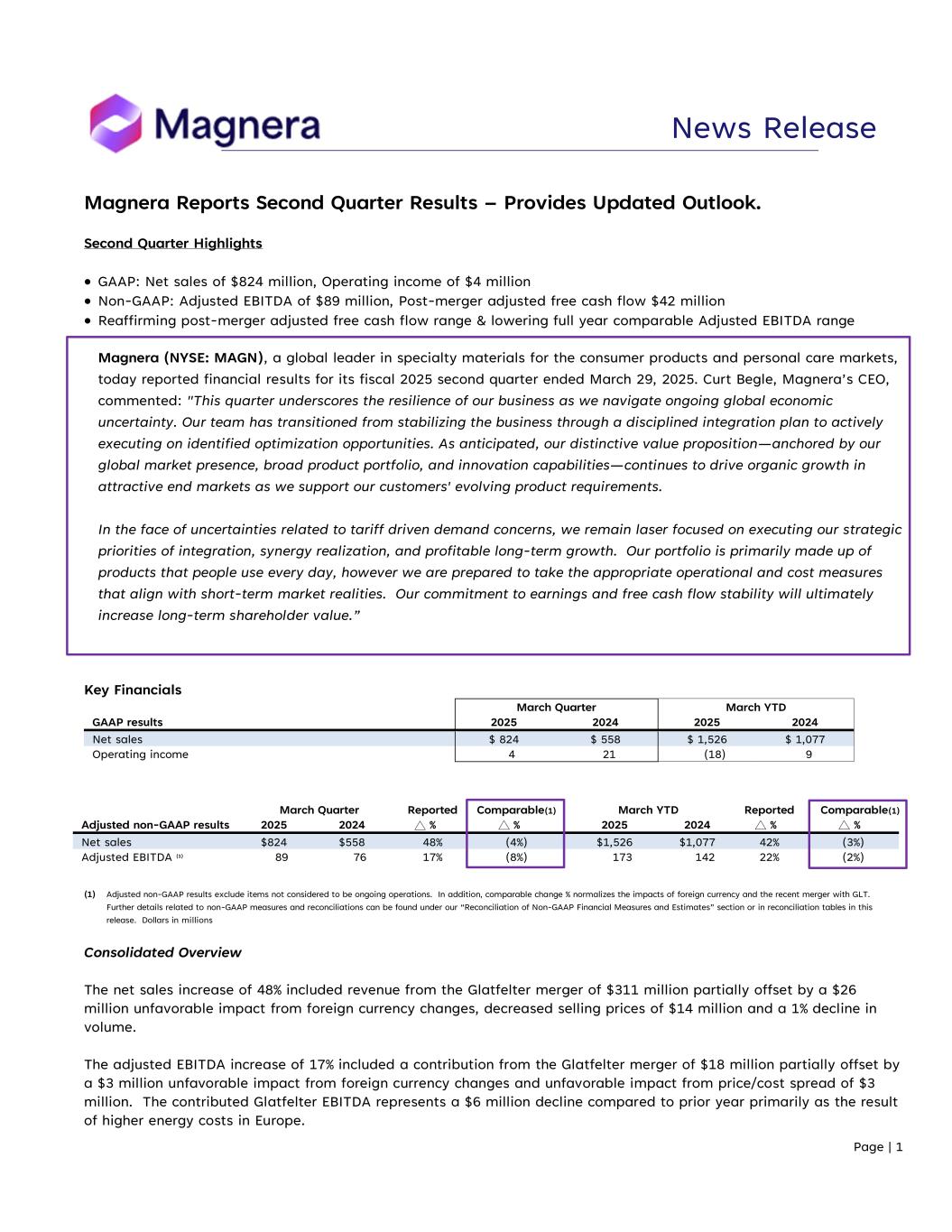 Page | 1 Magnera Reports Second Quarter Results – Provides Updated Outlook. Second Quarter Highlights  GAAP: Net sales of $824 million, Operating income of $4 million  Non-GAAP: Adjusted EBITDA of $89 million, Post-merger adjusted free cash flow $42 million  Reaffirming post-merger adjusted free cash flow range & lowering full year comparable Adjusted EBITDA range Magnera (NYSE: MAGN), a global leader in specialty materials for the consumer products and personal care markets, today reported financial results for its fiscal 2025 second quarter ended March 29, 2025. Curt Begle, Magnera’s CEO, commented: "This quarter underscores the resilience of our business as we navigate ongoing global economic uncertainty. Our team has transitioned from stabilizing the business through a disciplined integration plan to actively executing on identified optimization opportunities. As anticipated, our distinctive value proposition—anchored by our global market presence, broad product portfolio, and innovation capabilities—continues to drive organic growth in attractive end markets as we support our customers' evolving product requirements. In the face of uncertainties related to tariff driven demand concerns, we remain laser focused on executing our strategic priorities of integration, synergy realization, and profitable long-term growth. Our portfolio is primarily made up of products that people use every day, however we are prepared to take the appropriate operational and cost measures that align with short-term market realities. Our commitment to earnings and free cash flow stability will ultimately increase long-term shareholder value.” Key Financials March Quarter March YTD GAAP results 2025 2024 2025 2024 Net sales $ 824 $ 558 $ 1,526 $ 1,077 Operating income 4 21 (18) 9 (1) Adjusted non-GAAP results exclude items not considered to be ongoing operations. In addition, comparable change % normalizes the impacts of foreign currency and the recent merger with GLT. Further details related to non-GAAP measures and reconciliations can be found under our “Reconciliation of Non-GAAP Financial Measures and Estimates” section or in reconciliation tables in this release. Dollars in millions Consolidated Overview The net sales increase of 48% included revenue from the Glatfelter merger of $311 million partially offset by a $26 million unfavorable impact from foreign currency changes, decreased selling prices of $14 million and a 1% decline in volume. The adjusted EBITDA increase of 17% included a contribution from the Glatfelter merger of $18 million partially offset by a $3 million unfavorable impact from foreign currency changes and unfavorable impact from price/cost spread of $3 million. The contributed Glatfelter EBITDA represents a $6 million decline compared to prior year primarily as the result of higher energy costs in Europe. March Quarter Reported Comparable(1) March YTD Reported Comparable(1) Adjusted non-GAAP results 2025 2024 % % 2025 2024 % % Net sales $824 $558 48% (4%) $1,526 $1,077 42% (3%) Adjusted EBITDA (1) 89 76 17% (8%) 173 142 22% (2%) News Release