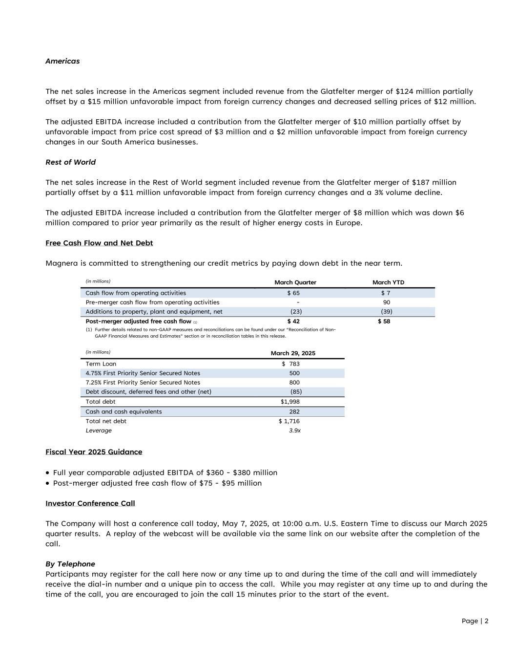 Page | 2 Americas The net sales increase in the Americas segment included revenue from the Glatfelter merger of $124 million partially offset by a $15 million unfavorable impact from foreign currency changes and decreased selling prices of $12 million. The adjusted EBITDA increase included a contribution from the Glatfelter merger of $10 million partially offset by unfavorable impact from price cost spread of $3 million and a $2 million unfavorable impact from foreign currency changes in our South America businesses. Rest of World The net sales increase in the Rest of World segment included revenue from the Glatfelter merger of $187 million partially offset by a $11 million unfavorable impact from foreign currency changes and a 3% volume decline. The adjusted EBITDA increase included a contribution from the Glatfelter merger of $8 million which was down $6 million compared to prior year primarily as the result of higher energy costs in Europe. Free Cash Flow and Net Debt Magnera is committed to strengthening our credit metrics by paying down debt in the near term. (in millions) March Quarter March YTD Cash flow from operating activities $ 65 $ 7 Pre-merger cash flow from operating activities - 90 Additions to property, plant and equipment, net (23) (39) Post-merger adjusted free cash flow (1) $ 42 $ 58 (1) Further details related to non-GAAP measures and reconciliations can be found under our “Reconciliation of Non- GAAP Financial Measures and Estimates” section or in reconciliation tables in this release. (in millions) March 29, 2025 Term Loan $ 783 4.75% First Priority Senior Secured Notes 500 7.25% First Priority Senior Secured Notes 800 Debt discount, deferred fees and other (net) (85) Total debt $1,998 Cash and cash equivalents 282 Total net debt $ 1,716 Leverage 3.9x Fiscal Year 2025 Guidance  Full year comparable adjusted EBITDA of $360 - $380 million  Post-merger adjusted free cash flow of $75 - $95 million Investor Conference Call The Company will host a conference call today, May 7, 2025, at 10:00 a.m. U.S. Eastern Time to discuss our March 2025 quarter results. A replay of the webcast will be available via the same link on our website after the completion of the call. By Telephone Participants may register for the call here now or any time up to and during the time of the call and will immediately receive the dial-in number and a unique pin to access the call. While you may register at any time up to and during the time of the call, you are encouraged to join the call 15 minutes prior to the start of the event.
