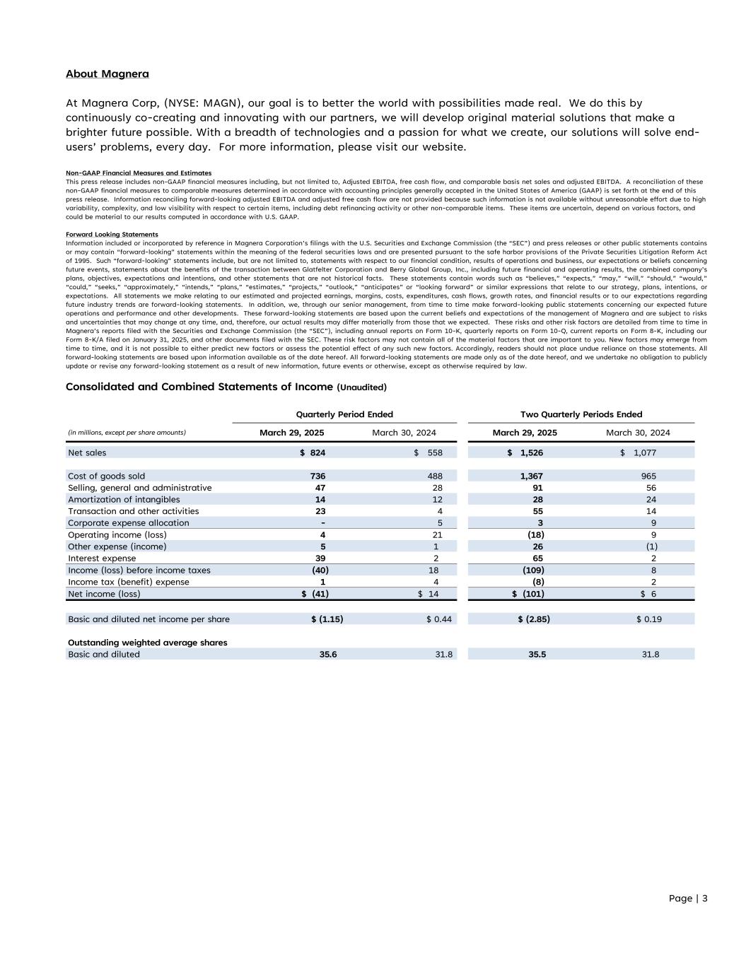 Page | 3 About Magnera At Magnera Corp, (NYSE: MAGN), our goal is to better the world with possibilities made real. We do this by continuously co-creating and innovating with our partners, we will develop original material solutions that make a brighter future possible. With a breadth of technologies and a passion for what we create, our solutions will solve end- users’ problems, every day. For more information, please visit our website. Non-GAAP Financial Measures and Estimates This press release includes non-GAAP financial measures including, but not limited to, Adjusted EBITDA, free cash flow, and comparable basis net sales and adjusted EBITDA. A reconciliation of these non-GAAP financial measures to comparable measures determined in accordance with accounting principles generally accepted in the United States of America (GAAP) is set forth at the end of this press release. Information reconciling forward-looking adjusted EBITDA and adjusted free cash flow are not provided because such information is not available without unreasonable effort due to high variability, complexity, and low visibility with respect to certain items, including debt refinancing activity or other non-comparable items. These items are uncertain, depend on various factors, and could be material to our results computed in accordance with U.S. GAAP. Forward Looking Statements Information included or incorporated by reference in Magnera Corporation’s filings with the U.S. Securities and Exchange Commission (the “SEC”) and press releases or other public statements contains or may contain “forward-looking” statements within the meaning of the federal securities laws and are presented pursuant to the safe harbor provisions of the Private Securities Litigation Reform Act of 1995. Such “forward-looking” statements include, but are not limited to, statements with respect to our financial condition, results of operations and business, our expectations or beliefs concerning future events, statements about the benefits of the transaction between Glatfelter Corporation and Berry Global Group, Inc., including future financial and operating results, the combined company’s plans, objectives, expectations and intentions, and other statements that are not historical facts. These statements contain words such as “believes,” “expects,” “may,” “will,” “should,” “would,” “could,” “seeks,” “approximately,” “intends,” “plans,” “estimates,” “projects,” “outlook,” “anticipates” or “looking forward” or similar expressions that relate to our strategy, plans, intentions, or expectations. All statements we make relating to our estimated and projected earnings, margins, costs, expenditures, cash flows, growth rates, and financial results or to our expectations regarding future industry trends are forward-looking statements. In addition, we, through our senior management, from time to time make forward-looking public statements concerning our expected future operations and performance and other developments. These forward-looking statements are based upon the current beliefs and expectations of the management of Magnera and are subject to risks and uncertainties that may change at any time, and, therefore, our actual results may differ materially from those that we expected. These risks and other risk factors are detailed from time to time in Magnera’s reports filed with the Securities and Exchange Commission (the “SEC”), including annual reports on Form 10-K, quarterly reports on Form 10-Q, current reports on Form 8-K, including our Form 8-K/A filed on January 31, 2025, and other documents filed with the SEC. These risk factors may not contain all of the material factors that are important to you. New factors may emerge from time to time, and it is not possible to either predict new factors or assess the potential effect of any such new factors. Accordingly, readers should not place undue reliance on those statements. All forward-looking statements are based upon information available as of the date hereof. All forward-looking statements are made only as of the date hereof, and we undertake no obligation to publicly update or revise any forward-looking statement as a result of new information, future events or otherwise, except as otherwise required by law. Consolidated and Combined Statements of Income (Unaudited) Quarterly Period Ended Two Quarterly Periods Ended (in millions, except per share amounts) March 29, 2025 March 30, 2024 March 29, 2025 March 30, 2024 Net sales $ 824 $ 558 $ 1,526 $ 1,077 Cost of goods sold 736 488 1,367 965 Selling, general and administrative 47 28 91 56 Amortization of intangibles 14 12 28 24 Transaction and other activities 23 4 55 14 Corporate expense allocation - 5 3 9 Operating income (loss) 4 21 (18) 9 Other expense (income) 5 1 26 (1) Interest expense 39 2 65 2 Income (loss) before income taxes (40) 18 (109) 8 Income tax (benefit) expense 1 4 (8) 2 Net income (loss) $ (41) $ 14 $ (101) $ 6 Basic and diluted net income per share $ (1.15) $ 0.44 $ (2.85) $ 0.19 Outstanding weighted average shares Basic and diluted 35.6 31.8 35.5 31.8