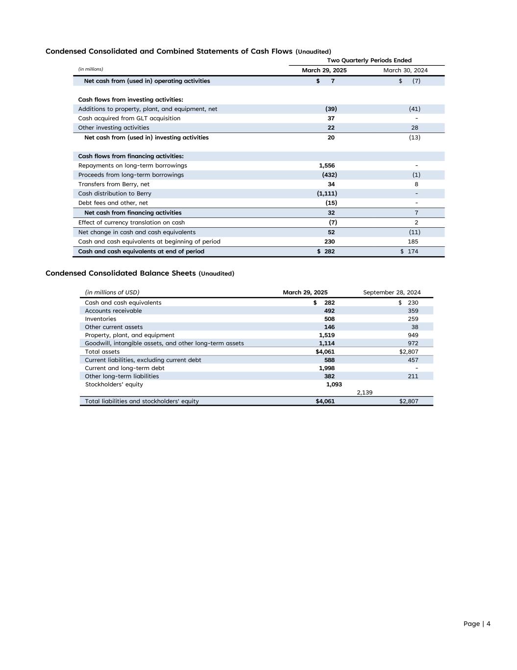 Page | 4 Condensed Consolidated and Combined Statements of Cash Flows (Unaudited) Two Quarterly Periods Ended (in millions) March 29, 2025 March 30, 2024 Net cash from (used in) operating activities $ 7 $ (7) Cash flows from investing activities: Additions to property, plant, and equipment, net (39) (41) Cash acquired from GLT acquisition 37 - Other investing activities 22 28 Net cash from (used in) investing activities 20 (13) Cash flows from financing activities: Repayments on long-term borrowings 1,556 - Proceeds from long-term borrowings (432) (1) Transfers from Berry, net 34 8 Cash distribution to Berry (1,111) - Debt fees and other, net (15) - Net cash from financing activities 32 7 Effect of currency translation on cash (7) 2 Net change in cash and cash equivalents 52 (11) Cash and cash equivalents at beginning of period 230 185 Cash and cash equivalents at end of period $ 282 $ 174 Condensed Consolidated Balance Sheets (Unaudited) (in millions of USD) March 29, 2025 September 28, 2024 Cash and cash equivalents $ 282 $ 230 Accounts receivable 492 359 Inventories 508 259 Other current assets 146 38 Property, plant, and equipment 1,519 949 Goodwill, intangible assets, and other long-term assets 1,114 972 Total assets $4,061 $2,807 Current liabilities, excluding current debt 588 457 Current and long-term debt 1,998 - Other long-term liabilities 382 211 Stockholders’ equity 1,093 2,139 Total liabilities and stockholders' equity $4,061 $2,807