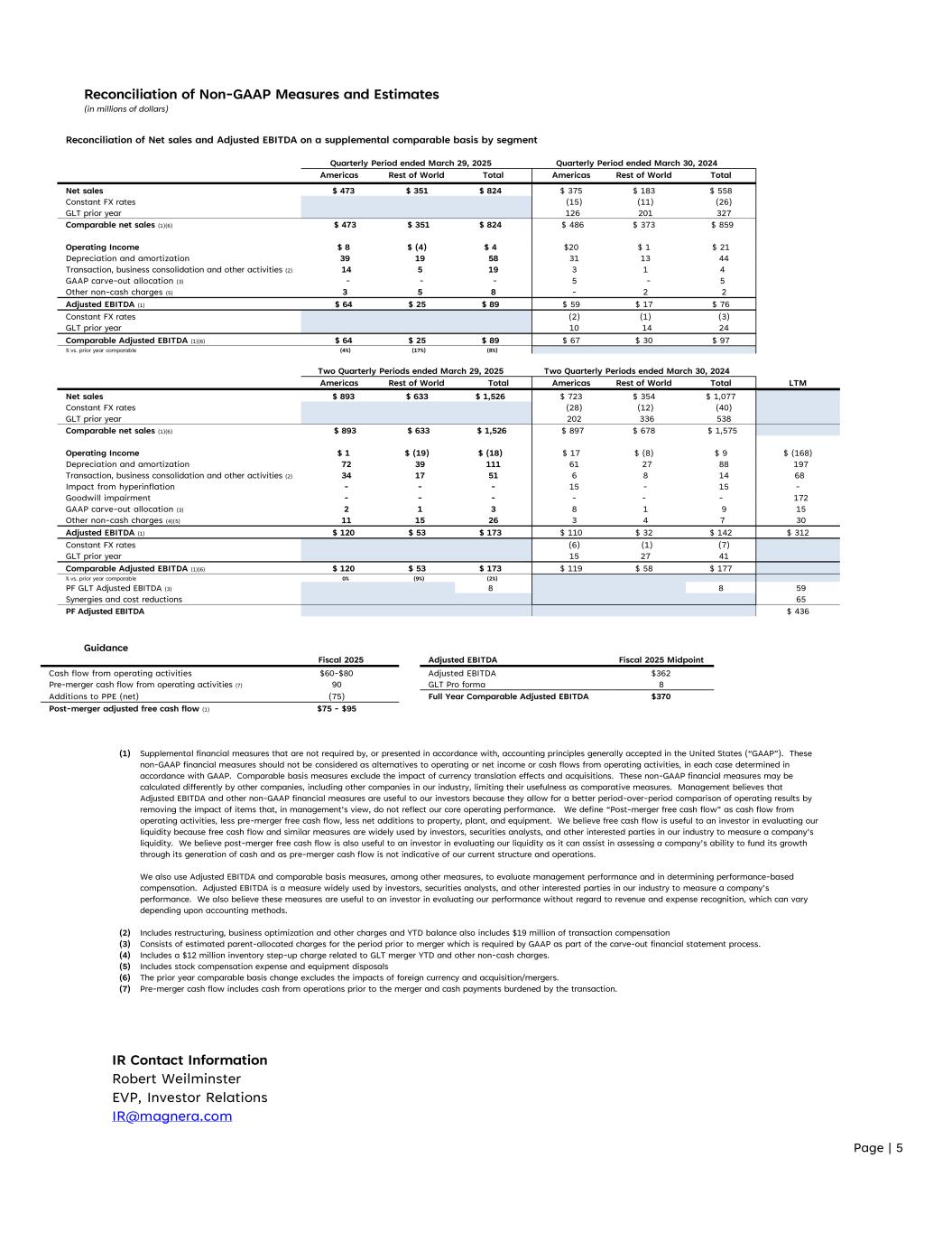Page | 5 Reconciliation of Non-GAAP Measures and Estimates (in millions of dollars) Reconciliation of Net sales and Adjusted EBITDA on a supplemental comparable basis by segment Quarterly Period ended March 29, 2025 Quarterly Period ended March 30, 2024 Americas Rest of World Total Americas Rest of World Total Net sales $ 473 $ 351 $ 824 $ 375 $ 183 $ 558 Constant FX rates (15) (11) (26) GLT prior year 126 201 327 Comparable net sales (1)(6) $ 473 $ 351 $ 824 $ 486 $ 373 $ 859 Operating Income $ 8 $ (4) $ 4 $20 $ 1 $ 21 Depreciation and amortization 39 19 58 31 13 44 Transaction, business consolidation and other activities (2) 14 5 19 3 1 4 GAAP carve-out allocation (3) - - - 5 - 5 Other non-cash charges (5) 3 5 8 - 2 2 Adjusted EBITDA (1) $ 64 $ 25 $ 89 $ 59 $ 17 $ 76 Constant FX rates (2) (1) (3) GLT prior year 10 14 24 Comparable Adjusted EBITDA (1)(6) $ 64 $ 25 $ 89 $ 67 $ 30 $ 97 % vs. prior year comparable (4%) (17%) (8%) Two Quarterly Periods ended March 29, 2025 Two Quarterly Periods ended March 30, 2024 Americas Rest of World Total Americas Rest of World Total LTM Net sales $ 893 $ 633 $ 1,526 $ 723 $ 354 $ 1,077 Constant FX rates (28) (12) (40) GLT prior year 202 336 538 Comparable net sales (1)(6) $ 893 $ 633 $ 1,526 $ 897 $ 678 $ 1,575 Operating Income $ 1 $ (19) $ (18) $ 17 $ (8) $ 9 $ (168) Depreciation and amortization 72 39 111 61 27 88 197 Transaction, business consolidation and other activities (2) 34 17 51 6 8 14 68 Impact from hyperinflation - - - 15 - 15 - Goodwill impairment - - - - - - 172 GAAP carve-out allocation (3) 2 1 3 8 1 9 15 Other non-cash charges (4)(5) 11 15 26 3 4 7 30 Adjusted EBITDA (1) $ 120 $ 53 $ 173 $ 110 $ 32 $ 142 $ 312 Constant FX rates (6) (1) (7) GLT prior year 15 27 41 Comparable Adjusted EBITDA (1)(6) $ 120 $ 53 $ 173 $ 119 $ 58 $ 177 % vs. prior year comparable 0% (9%) (2%) PF GLT Adjusted EBITDA (3) 8 8 59 Synergies and cost reductions 65 PF Adjusted EBITDA $ 436 Guidance Fiscal 2025 Adjusted EBITDA Fiscal 2025 Midpoint Cash flow from operating activities $60-$80 Adjusted EBITDA $362 Pre-merger cash flow from operating activities (7) 90 GLT Pro forma 8 Additions to PPE (net) (75) Full Year Comparable Adjusted EBITDA $370 Post-merger adjusted free cash flow (1) $75 - $95 (1) Supplemental financial measures that are not required by, or presented in accordance with, accounting principles generally accepted in the United States (“GAAP”). These non-GAAP financial measures should not be considered as alternatives to operating or net income or cash flows from operating activities, in each case determined in accordance with GAAP. Comparable basis measures exclude the impact of currency translation effects and acquisitions. These non-GAAP financial measures may be calculated differently by other companies, including other companies in our industry, limiting their usefulness as comparative measures. Management believes that Adjusted EBITDA and other non-GAAP financial measures are useful to our investors because they allow for a better period-over-period comparison of operating results by removing the impact of items that, in management’s view, do not reflect our core operating performance. We define “Post-merger free cash flow” as cash flow from operating activities, less pre-merger free cash flow, less net additions to property, plant, and equipment. We believe free cash flow is useful to an investor in evaluating our liquidity because free cash flow and similar measures are widely used by investors, securities analysts, and other interested parties in our industry to measure a company’s liquidity. We believe post-merger free cash flow is also useful to an investor in evaluating our liquidity as it can assist in assessing a company’s ability to fund its growth through its generation of cash and as pre-merger cash flow is not indicative of our current structure and operations. We also use Adjusted EBITDA and comparable basis measures, among other measures, to evaluate management performance and in determining performance-based compensation. Adjusted EBITDA is a measure widely used by investors, securities analysts, and other interested parties in our industry to measure a company’s performance. We also believe these measures are useful to an investor in evaluating our performance without regard to revenue and expense recognition, which can vary depending upon accounting methods. (2) Includes restructuring, business optimization and other charges and YTD balance also includes $19 million of transaction compensation (3) Consists of estimated parent-allocated charges for the period prior to merger which is required by GAAP as part of the carve-out financial statement process. (4) Includes a $12 million inventory step-up charge related to GLT merger YTD and other non-cash charges. (5) Includes stock compensation expense and equipment disposals (6) The prior year comparable basis change excludes the impacts of foreign currency and acquisition/mergers. (7) Pre-merger cash flow includes cash from operations prior to the merger and cash payments burdened by the transaction. IR Contact Information Robert Weilminster EVP, Investor Relations IR@magnera.com