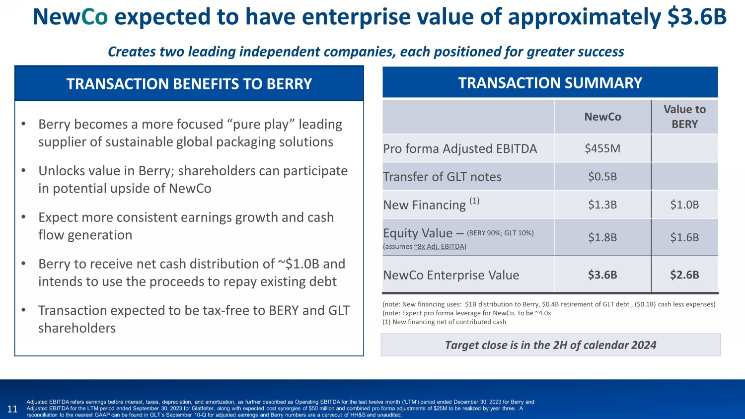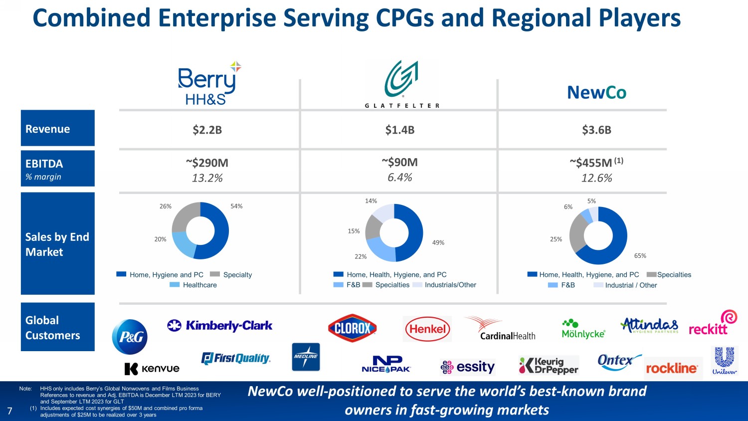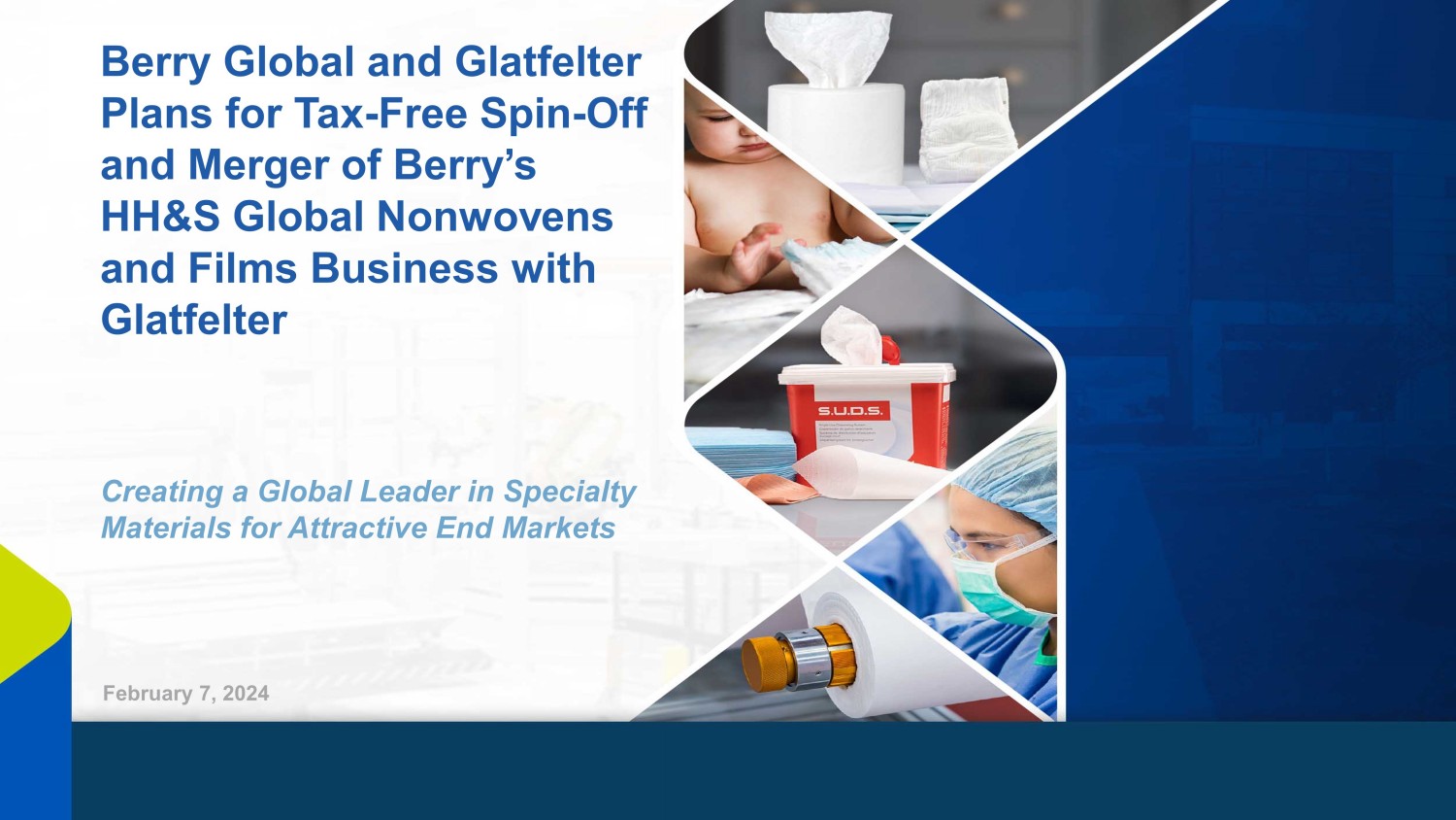 February 7, 2024 Creating a Global Leader in Specialty Materials for Attractive End Markets Berry Global and Glatfelter Plans for Tax - Free Spin - Off and Merger of Berry’s HH&S Global Nonwovens and Films Business with Glatfelter