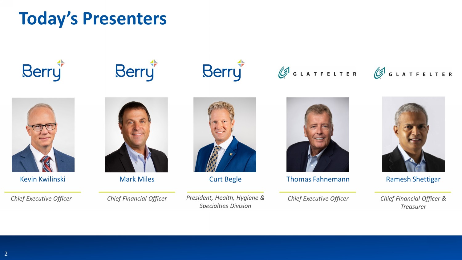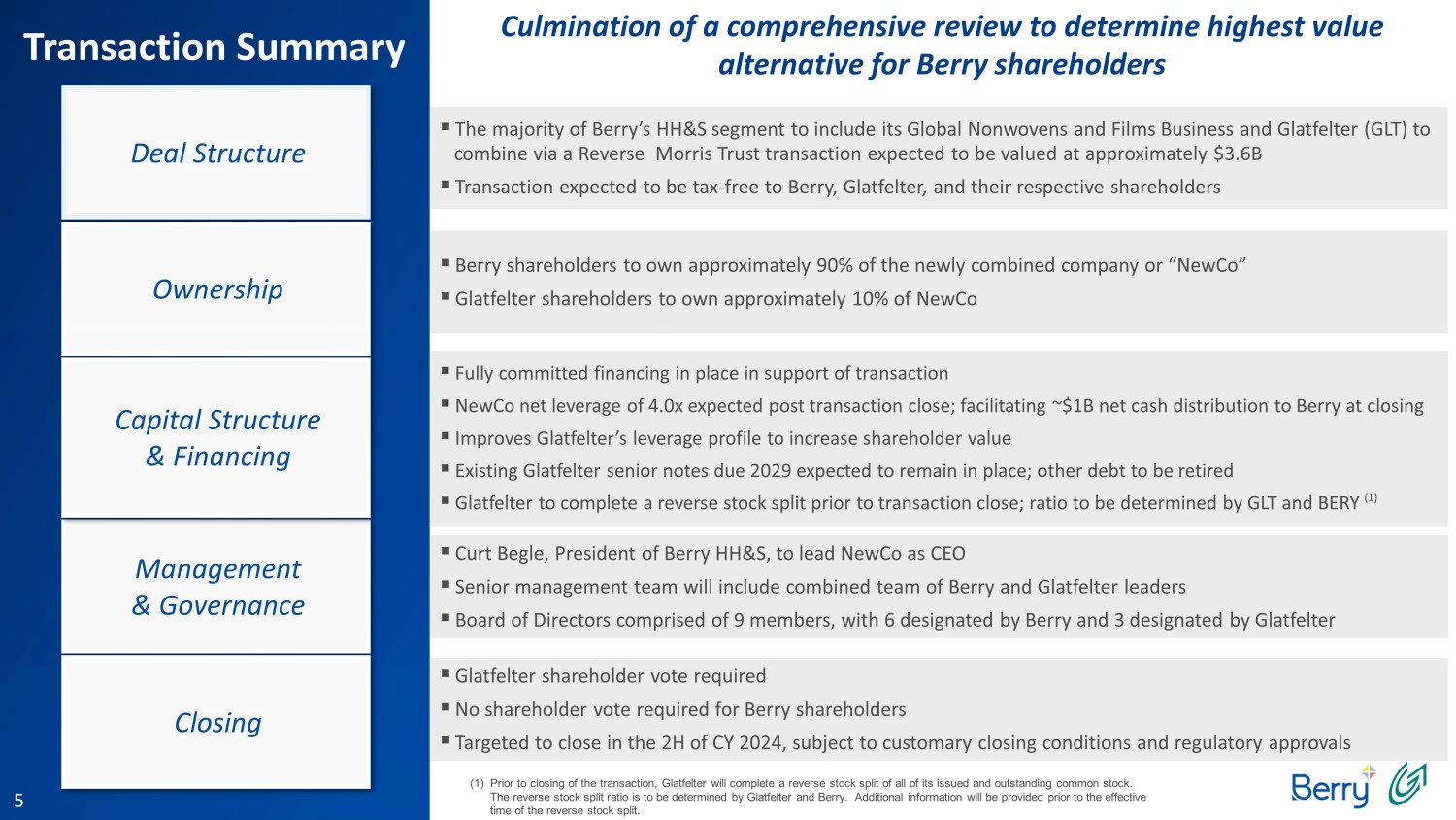 4 Safe Harbor Statements and Important Information (cont.) Additional Information and Where to Find It This communication may be deemed to be solicitation material in respect of the proposed transaction between Berry and Glatfel ter . In connection with the proposed transaction, Berry and Glatfelter intend to file relevant materials with the SEC, including a registration statement on Form S - 4 by Glatfelter that will contain a proxy statement/prospectus relating to the proposed transaction. In addition, Spinco expects to file a registration statement in connection with its separation from Berry. This communication is not a substitute for the registration statements, proxy statement/prospectus or any other document which Berry and/or Glatfelter may file with the SEC. STOCKHOLDERS OF BERRY AND GLATFELTER ARE URGED TO READ ALL RELEVANT DOCUMENTS FILED WITH THE SEC, INCLUDING THE REGISTRATION STATEMENT AND PROXY STATEM ENT /PROSPECTUS, BECAUSE THEY WILL CONTAIN IMPORTANT INFORMATION ABOUT THE PROPOSED TRANSACTION. Investors and security holders will be able to obtain copies of the registration statements and pro xy statement/prospectus (when available) as well as other filings containing information about Berry and Glatfelter, as well as the Spinco , without charge, at the SEC’s website, http://www.sec.gov. Copies of documents filed with the SEC by Berry or the Spinco will be made available free of charge on Berry’s investor relations website at https://ir.berryglobal.com. Copies of documents filed with the SEC by Glatfelter will be made available free of charge on Gla tfe lter's investor relations website at https://www.glatfelter.com/investors . No Offer or Solicitation This communication is for informational purposes only and is not intended to and does not constitute an offer to sell, or the so licitation of an offer to sell, subscribe for or buy, or a solicitation of any vote or approval in any jurisdiction, nor shall there be any sale, issuance or transfer of securities in any jurisdiction in which such offer, sale or solicitation wou ld be unlawful, prior to registration or qualification under the securities laws of any such jurisdiction. No offer or sale of securities shall be made except by means of a prospectus meeting the requirements of Section 10 of the Securities Act of 1933 , a s amended, and otherwise in accordance with applicable law. Participants in Solicitation Berry and its directors and executive officers, and Glatfelter and its directors and executive officers, may be deemed to be par ticipants in the solicitation of proxies from the holders of Glatfelter capital stock and/or the offering of securities in respect of the proposed transaction. Information about the directors and executive officers of Berry, including a descript ion of their direct or indirect interests, by security holdings or otherwise, is set forth under the caption “Security Ownership of Beneficial Owners and Management” in the definitive proxy statement for Berry’s 2024 Annual Meeting of Stockhold ers , which was filed with the SEC on January 4, 2024 (https://www.sec.gov/ixviewer/ix.html?doc=/Archives/edgar/data/0001378992/000110465924001073/tm2325571d6_def14a.htm). Informa tio n about the directors and executive officers of Glatfelter including a description of their direct or indirect interests, by security holdings or otherwise, is set forth under the caption “Ownership of Company Stock” in the pro xy statement for Glatfelter's 2023 Annual Meeting of Shareholders, which was filed with the SEC on March 31, 2023 (https://www.sec.gov/ixviewer/ix.html?doc=/Archives/edgar/data/0000041719/000004171923000012/glt - 20230331.htm). In addition , Curt Begle, the current President of the Berry’s Health, Hygiene & Specialties Division, will be appointed as Chief Executive Officer of the combined company. Investors may obtain additional information regarding the inter est of such participants by reading the proxy statement/prospectus regarding the proposed transaction when it becomes available.