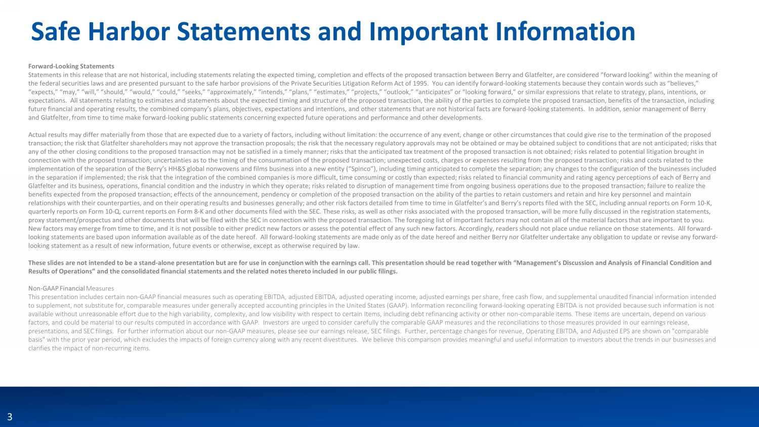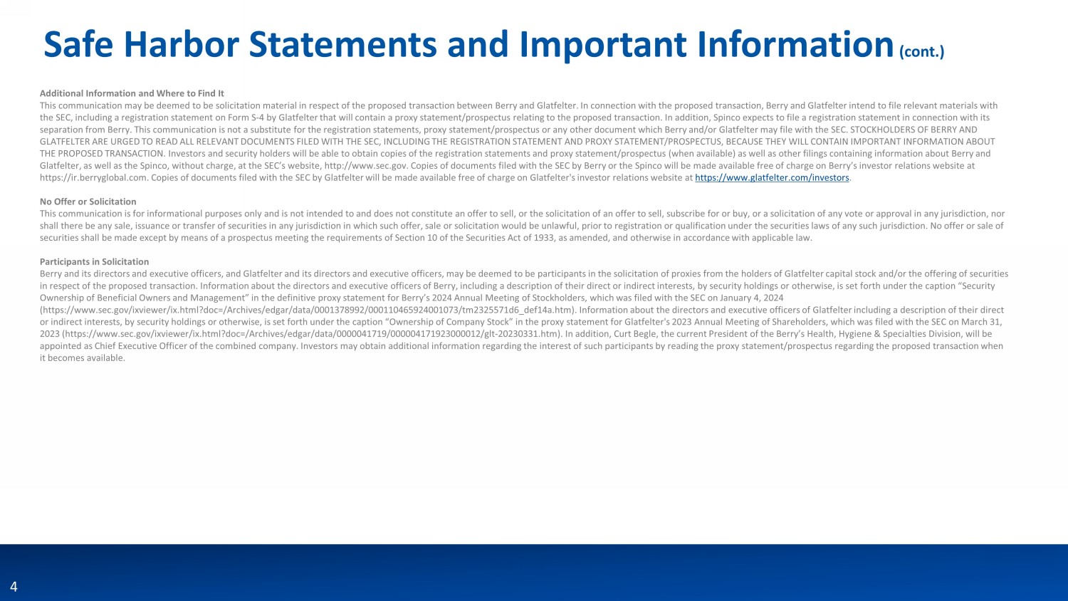 3 Safe Harbor Statements and Important Information Forward - Looking Statements Statements in this release that are not historical, including statements relating the expected timing, completion and effects of the proposed transaction between Berry and Glatfelter, are considered “forward looking” within the meaning of the federal securities laws and are presented pursuant to the safe harbor provisions of the Private Securities Litigation Ref orm Act of 1995. You can identify forward - looking statements because they contain words such as “believes,” “expects,” “may,” “will,” “should,” “would,” “could,” “seeks,” “approximately,” “intends,” “plans,” “estimates,” “projects,” “ou tlook,” “anticipates” or “looking forward,” or similar expressions that relate to strategy, plans, intentions, or expectations. All statements relating to estimates and statements about the expected timing and structure of the proposed tr ans action, the ability of the parties to complete the proposed transaction, benefits of the transaction, including future financial and operating results, the combined company’s plans, objectives, expectations and intentions, and other stat eme nts that are not historical facts are forward - looking statements. In addition, senior management of Berry and Glatfelter, from time to time make forward - looking public statements concerning expected future operations and performance a nd other developments. Actual results may differ materially from those that are expected due to a variety of factors, including without limitation: the occurrence of any event, change or other circumstances that could give rise to the termination of the proposed transaction; the risk that Glatfelter shareholders may not approve the transaction proposals; the risk that the necessary reg ula tory approvals may not be obtained or may be obtained subject to conditions that are not anticipated; risks that any of the other closing conditions to the proposed transaction may not be satisfied in a timely manner; risks that the antic ipa ted tax treatment of the proposed transaction is not obtained; risks related to potential litigation brought in connection with the proposed transaction; uncertainties as to the timing of the consummation of the proposed transaction; une xpe cted costs, charges or expenses resulting from the proposed transaction; risks and costs related to the implementation of the separation of the Berry’s HH&S global nonwovens and films business into a new entity (“ Spinco ”), including timing anticipated to complete the separation; any changes to the configuration of the businesses included in the separation if implemented; the risk that the integration of the combined companies is more difficult, time consuming o r c ostly than expected; risks related to financial community and rating agency perceptions of each of Berry and Glatfelter and its business, operations, financial condition and the industry in which they operate; risks related to disrupt ion of management time from ongoing business operations due to the proposed transaction; failure to realize the benefits expected from the proposed transaction; effects of the announcement, pendency or completion of the proposed transact ion on the ability of the parties to retain customers and retain and hire key personnel and maintain relationships with their counterparties, and on their operating results and businesses generally; and other risk factors deta ile d from time to time in Glatfelter’s and Berry’s reports filed with the SEC, including annual reports on Form 10 - K, quarterly reports on Form 10 - Q, current reports on Form 8 - K and other documents filed with the SEC. These risks, as well as othe r risks associated with the proposed transaction, will be more fully discussed in the registration statements, proxy statement/prospectus and other documents that will be filed with the SEC in connection with the proposed transaction. T he foregoing list of important factors may not contain all of the material factors that are important to you. New factors may emerge from time to time, and it is not possible to either predict new factors or assess the potential effect of any such new factors. Accordingly, readers should not place undue reliance on those statements. All forward - looking statements are based upon information available as of the date hereof. All forward - looking statements are made only as of the date hereof and neither Berry nor Glatfelter undertake any obligation to update or revise any forward - looking statement as a result of new information, future events or otherwise, except as otherwise required by law. These slides are not intended to be a stand - alone presentation but are for use in conjunction with the earnings call. This prese ntation should be read together with “Management’s Discussion and Analysis of Financial Condition and Results of Operations” and the consolidated financial statements and the related notes thereto included in our public filings . Non - GAAP Financial Measures This presentation includes certain non-GAAP financial measures such as operating EBITDA, adjusted EBITDA, adjusted operating inc ome, adjusted earnings per share, free cash flow, and supplemental unaudited financial information intended to supplement, not substitute for, comparable measures under generally accepted accounting principles in the United States (G AAP ). Information reconciling forward - looking operating EBITDA is not provided because such information is not available without unreasonable effort due to the high variability, complexity, and low visibility with respect to certain Ite ms, including debt refinancing activity or other non - comparable items. These items are uncertain, depend on various factors, and could be material to our results computed in accordance with GAAP. Investors are urged to consider carefully th e c omparable GAAP measu