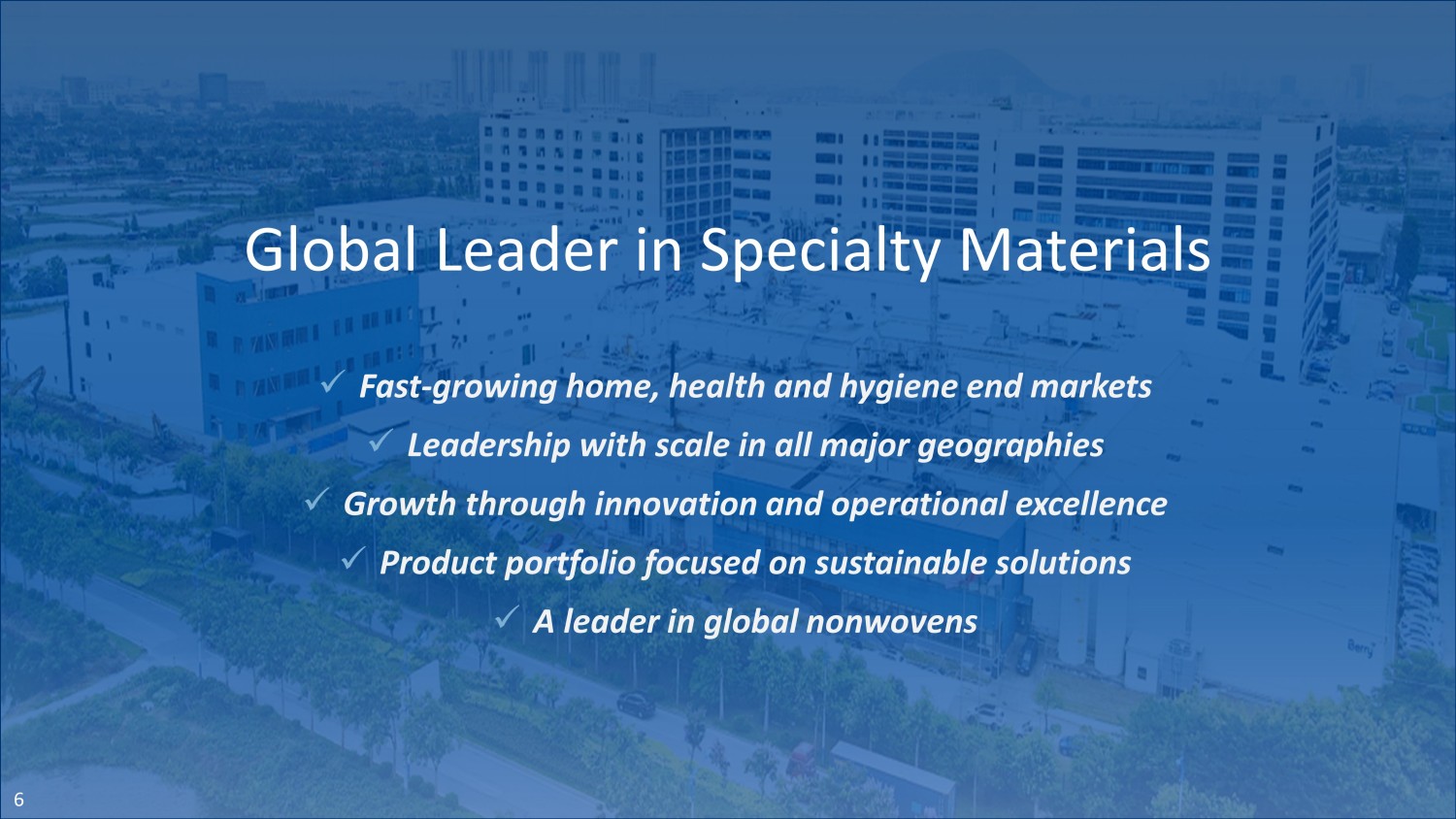 Transaction Summary Deal Structure Ownership Management & Governance Capital Structure & Financing Closing Culmination of a comprehensive review to determine highest value alternative for Berry shareholders ▪ The majority of Berry’s HH&S segment to include its Global Nonwovens and Films Business and Glatfelter (GLT) to combine via a Reverse Morris Trust transaction expected to be valued at approximately $3.6B ▪ Transaction expected to be tax - free to Berry, Glatfelter, and their respective shareholders ▪ Berry shareholders to own approximately 90% of the newly combined company or “NewCo” ▪ Glatfelter shareholders to own approximately 10% of NewCo ▪ Curt Begle, President of Berry HH&S, to lead NewCo as CEO ▪ Senior management team will include combined team of Berry and Glatfelter leaders ▪ Board of Directors comprised of 9 members, with 6 designated by Berry and 3 designated by Glatfelter ▪ Fully committed financing in place in support of transaction ▪ NewCo net leverage of 4.0x expected post transaction close; facilitating ~$1B net cash distribution to Berry at closing ▪ Improves Glatfelter’s leverage profile to increase shareholder value ▪ Existing Glatfelter senior notes due 2029 expected to remain in place; other debt to be retired ▪ Glatfelter to complete a reverse stock split prior to transaction close; ratio to be determined by GLT and BERY (1) ▪ Glatfelter shareholder vote required ▪ No shareholder vote required for Berry shareholders ▪ Targeted to close in the 2H of CY 2024, subject to customary closing conditions and regulatory approvals 5 (1) Prior to closing of the transaction, Glatfelter will complete a reverse stock split of all of its issued and outstanding comm on stock. The reverse stock split ratio is to be determined by Glatfelter and Berry. Additional information will be provided prior to the effective time of the reverse stock split.