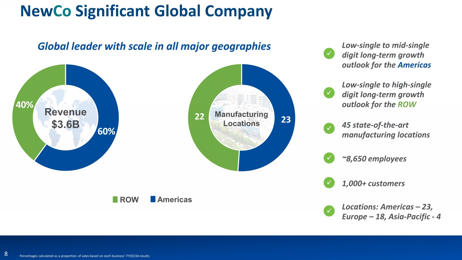 1 Percentages calculated as a proportion of sales based on each business’ FY2023A results 8 60% 40% Americas ROW Revenue $3.6B Manufacturing Locations Global leader with scale in all major geographies x Low - single to mid - single digit long - term growth outlook for the Americas Low - single to high - single digit long - term growth outlook for the ROW x 45 state - of - th e - art manufacturing locations x ~8,650 employees x 1,000+ customers x x Locations: Americas – 23, Europe – 18, Asia - Pacific - 4 New Co Significant Global Company 23 22