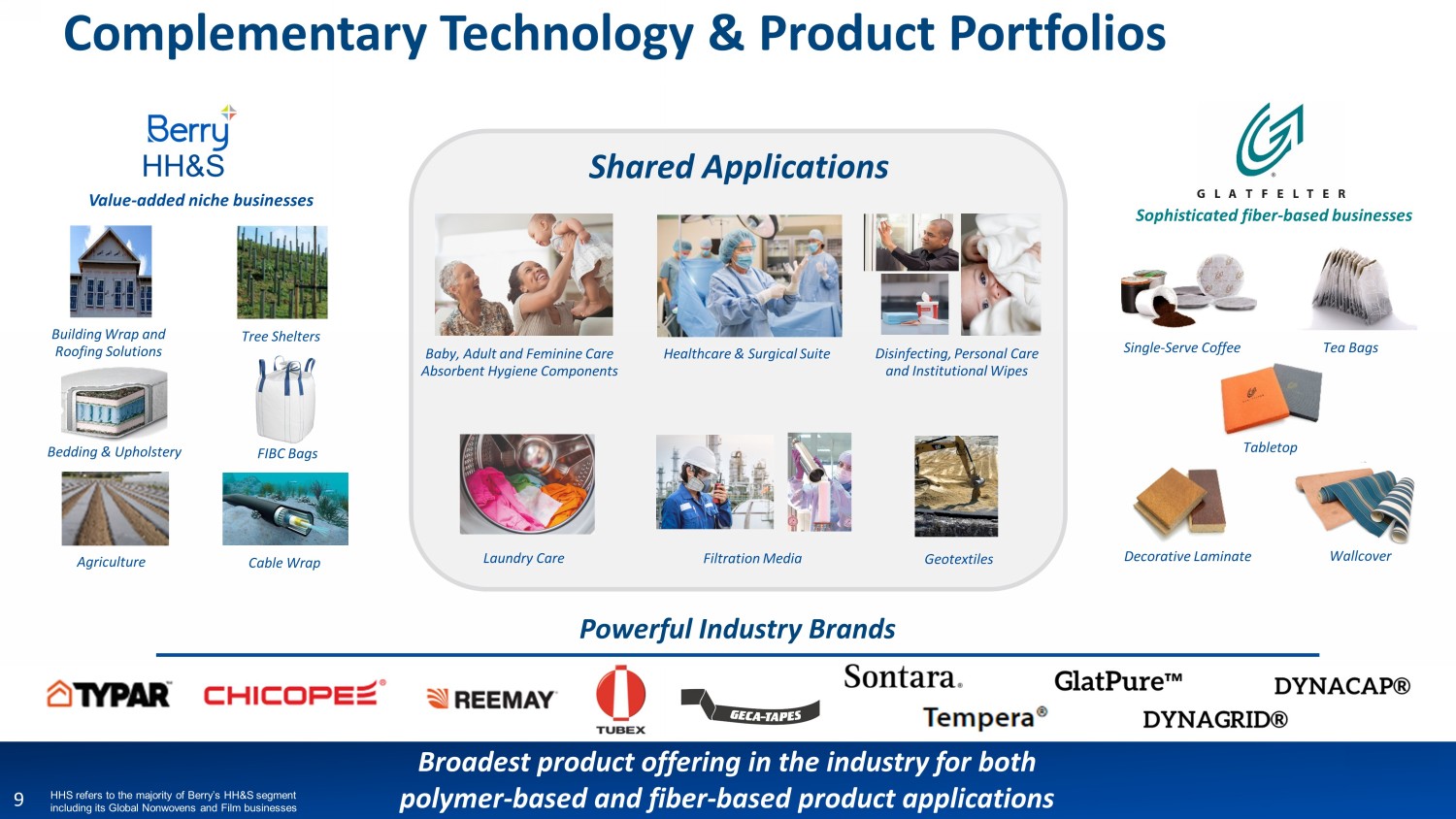 Broadest product offering in the industry for both polymer - based and fiber - based product applications Single - Serve Coffee Tea Bags Tabletop Decorative Laminate Filtration Media Disinfecting, Personal Care and Institutional Wipes Healthcare & Surgical Suite Baby, Adult and Feminine Care Ab sorbent Hygiene Components Geotextiles Laundry Care Cable Wrap Agriculture Bedding & Upholstery Building Wrap and Roofing Solutions Value - added niche businesses Sophisticated fiber - based businesses 9 HH&S HHS refers to the majority of Berry’s HH&S segment including its Global Nonwovens and Film businesses Wallcover Complementary Technology & Product Portfolios Tree Shelters Powerful Industry Brands Shared Applications FIBC Bags
